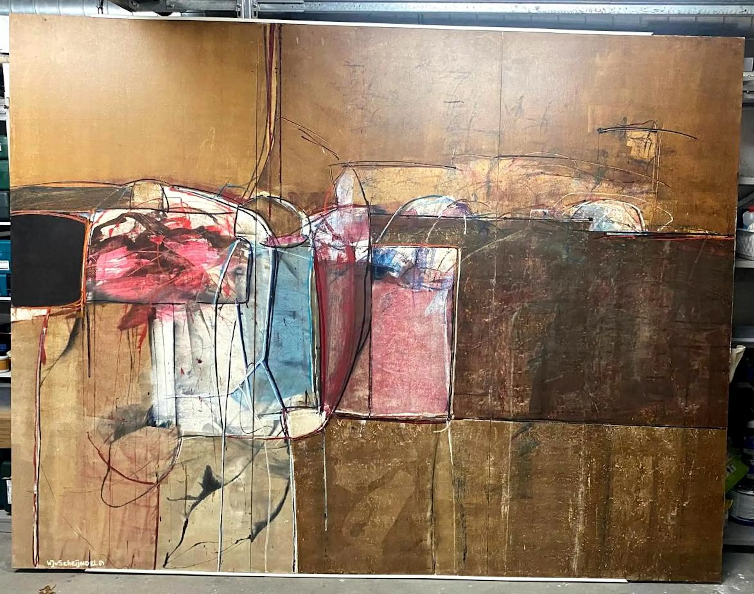 Willem van Scheijndel kreeg de opdracht van het Rijksmuseum van Oudheden in Leiden om 8 werken te maken voor de Taffeh-hal in het museum. Alle werken hadden dezelfde afmetingen: H240 x b320 cm. Dit werk betreft: Unfocused human and animal shapesstart to show. Het werk is linksonder gesigneerd en gedateerd (1984). De authenticiteit van het, aangeboden, werk wordt volledig gegarandeerd. Een certificaat van echtheid kan, op aanvraag, worden gemaild.