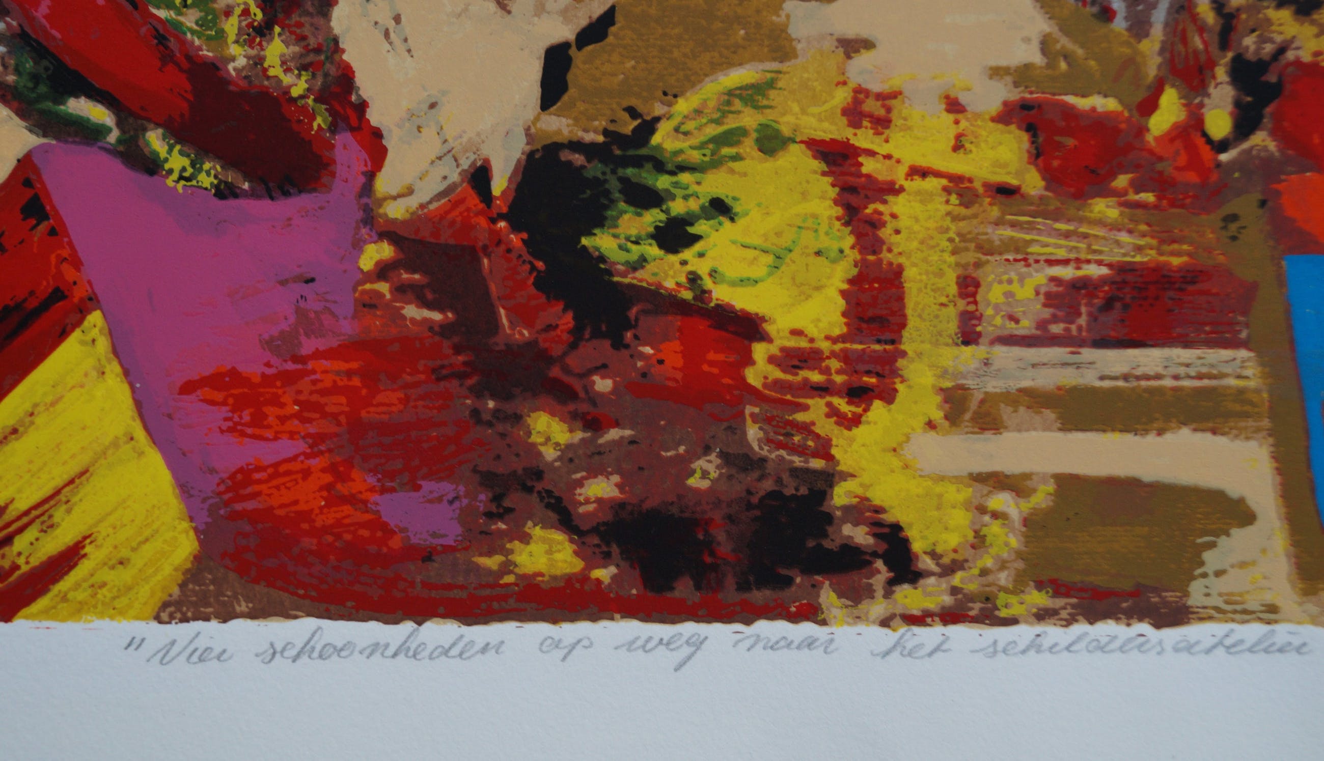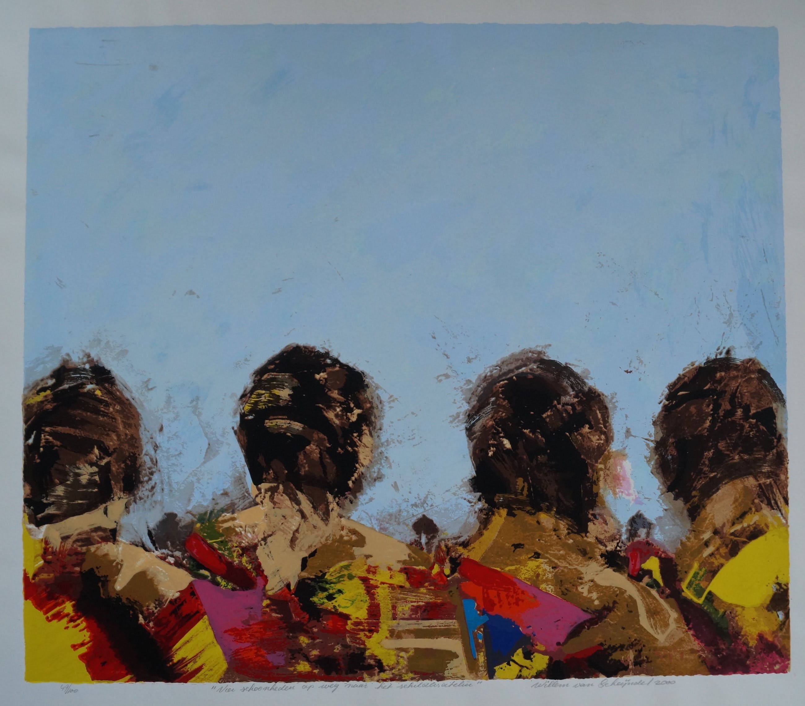 Prachtige zeefdruk van Willem van Scheijndel Titel: "Vier schoonheden op weg naar het schildersatelier" Oplagenummer: 49/ 100 Afmeting afbeelding: 65 x 56 cm Conditie: zeer goed Verzending Nederland: de zeefdruk wordt plat tussen twee platen verzonden, valt door het grote formaat in de categorie >10 kg. verzendkosten Verzending Buitenland: i.v.m. het formaat is plat verzenden niet mogelijk, de zeefdruk wordt in een koker verzonden.