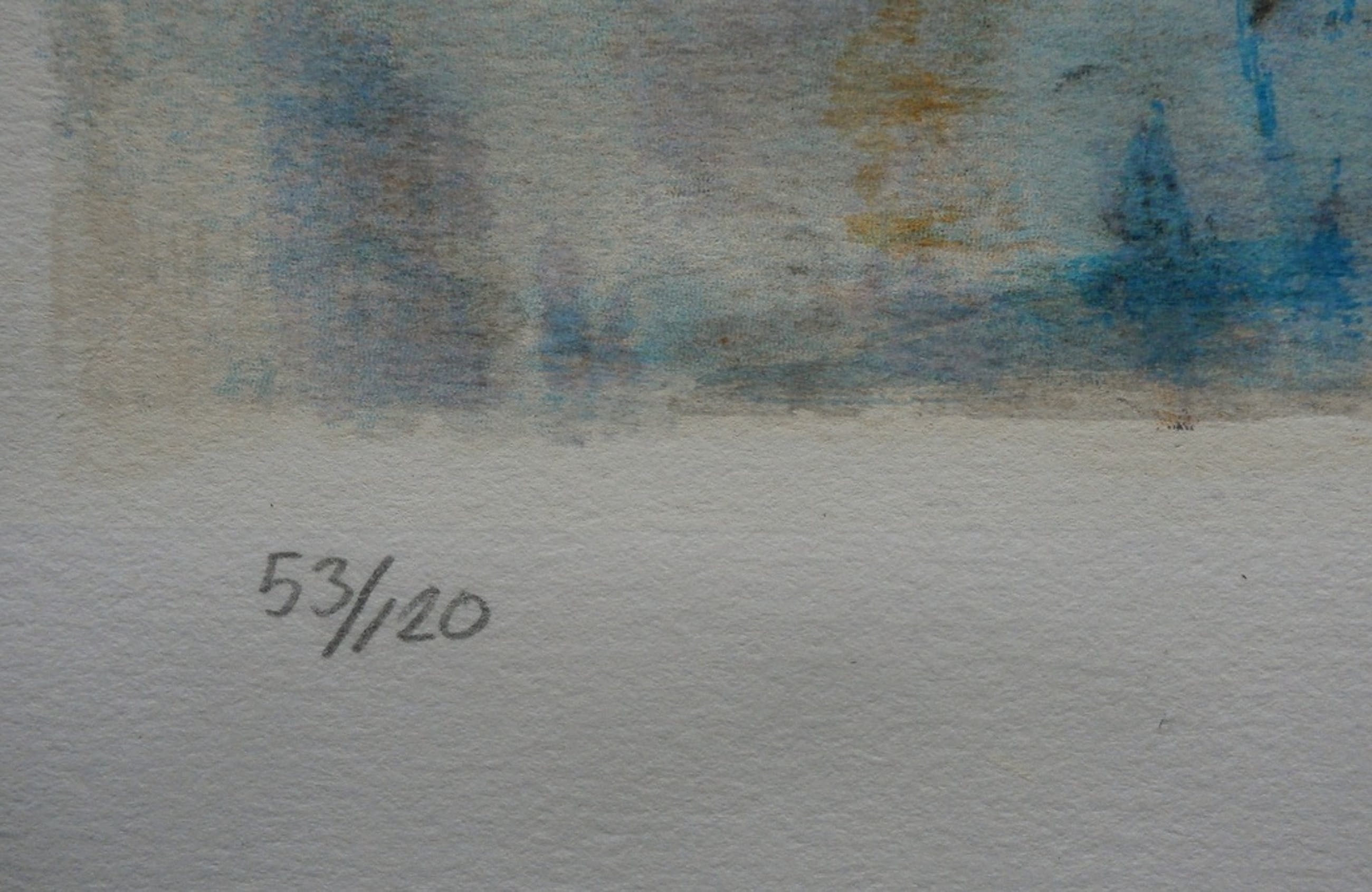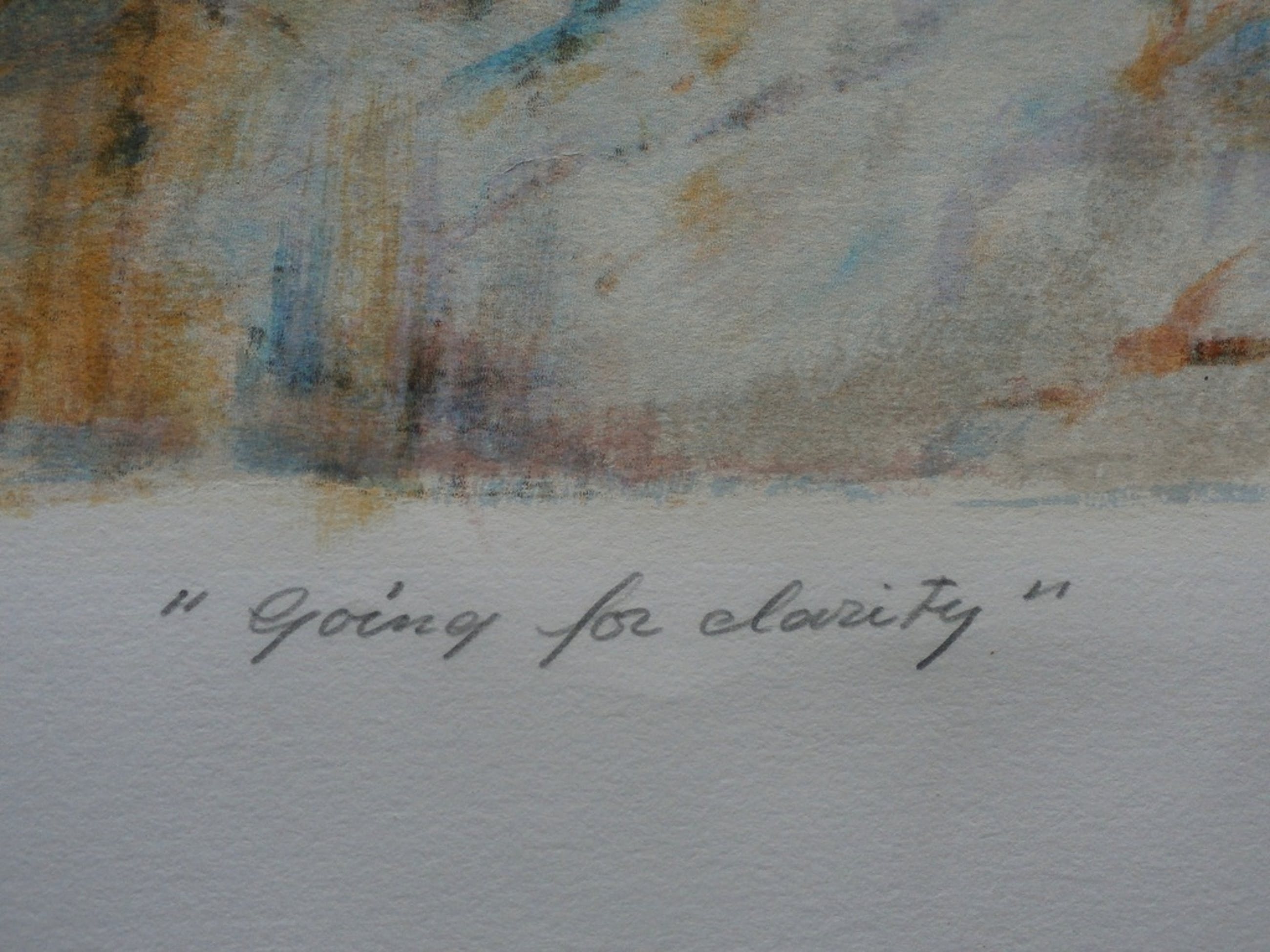 Kleurenlitho van Willem van Scheijndel uit 2005. Titel: Going for clarity. Nummer: 53/120. Afmetingen blad: H 90 x 61 cm. Afmetingen voorstelling: H79 x b59,5 cm. Conditie: in goede staat. Linksboven zit een kleine beschadiging op de rand (zie foto 6). Deze valt bij inlijsting volledig onder de passe-partout.