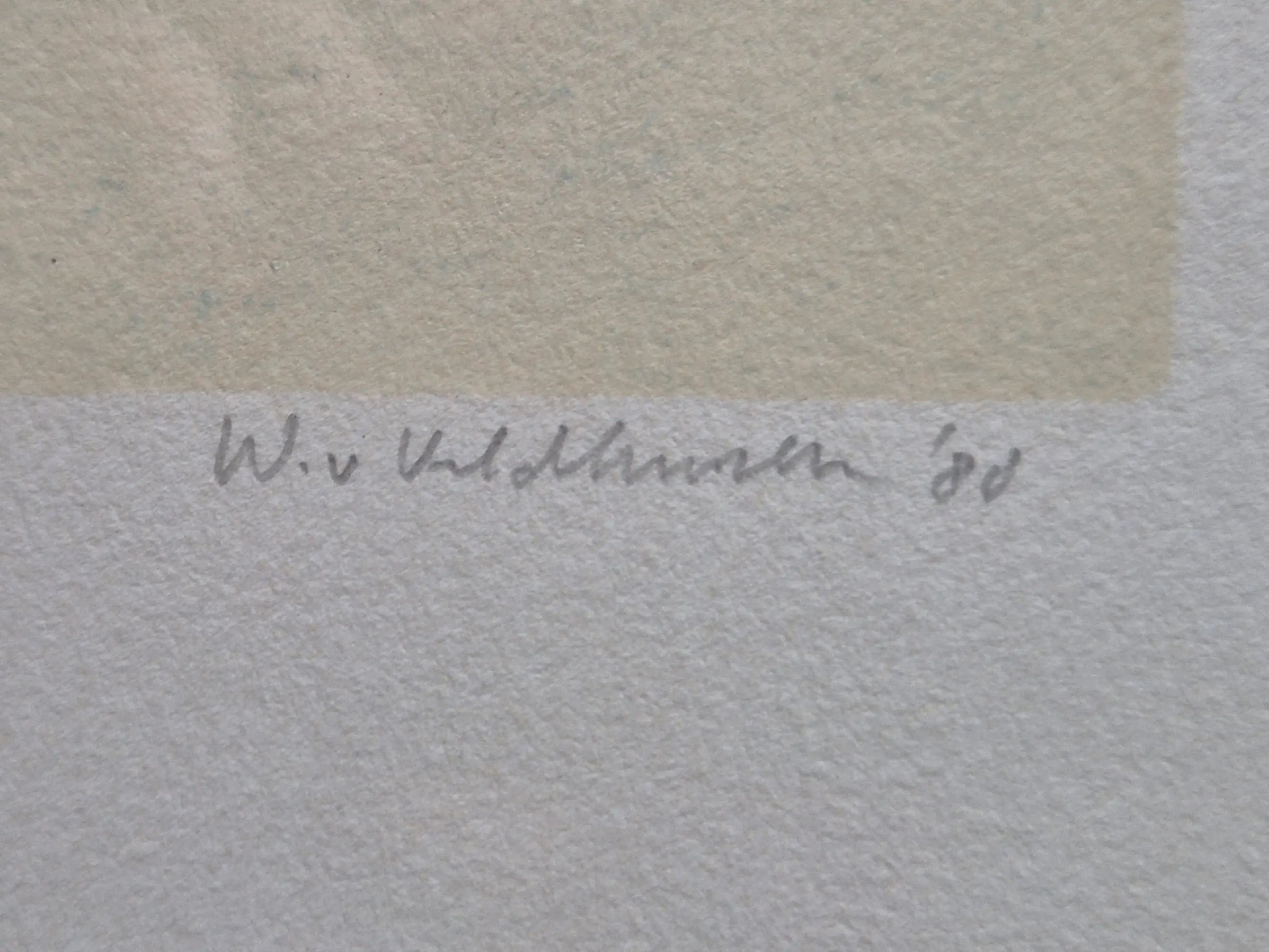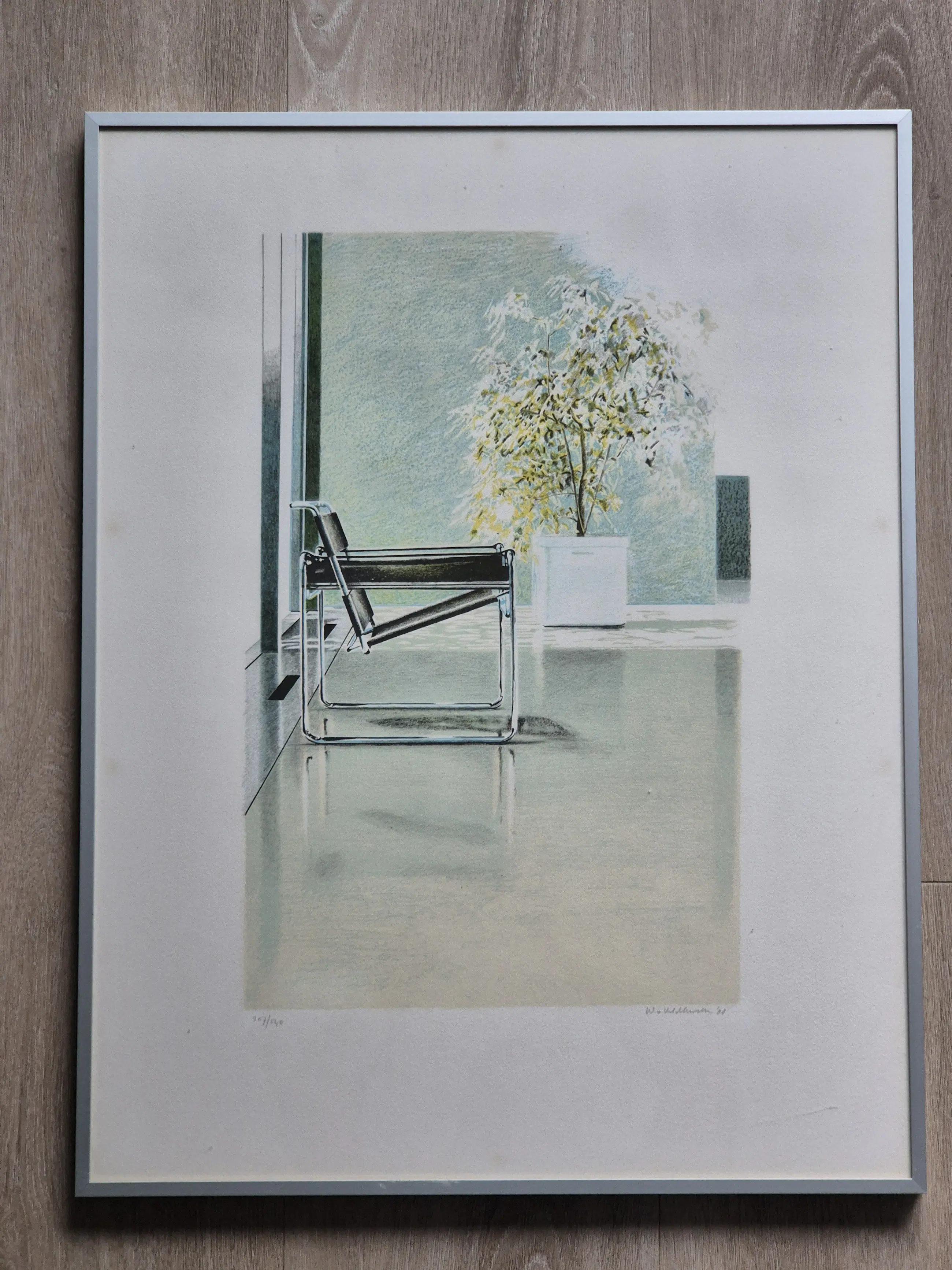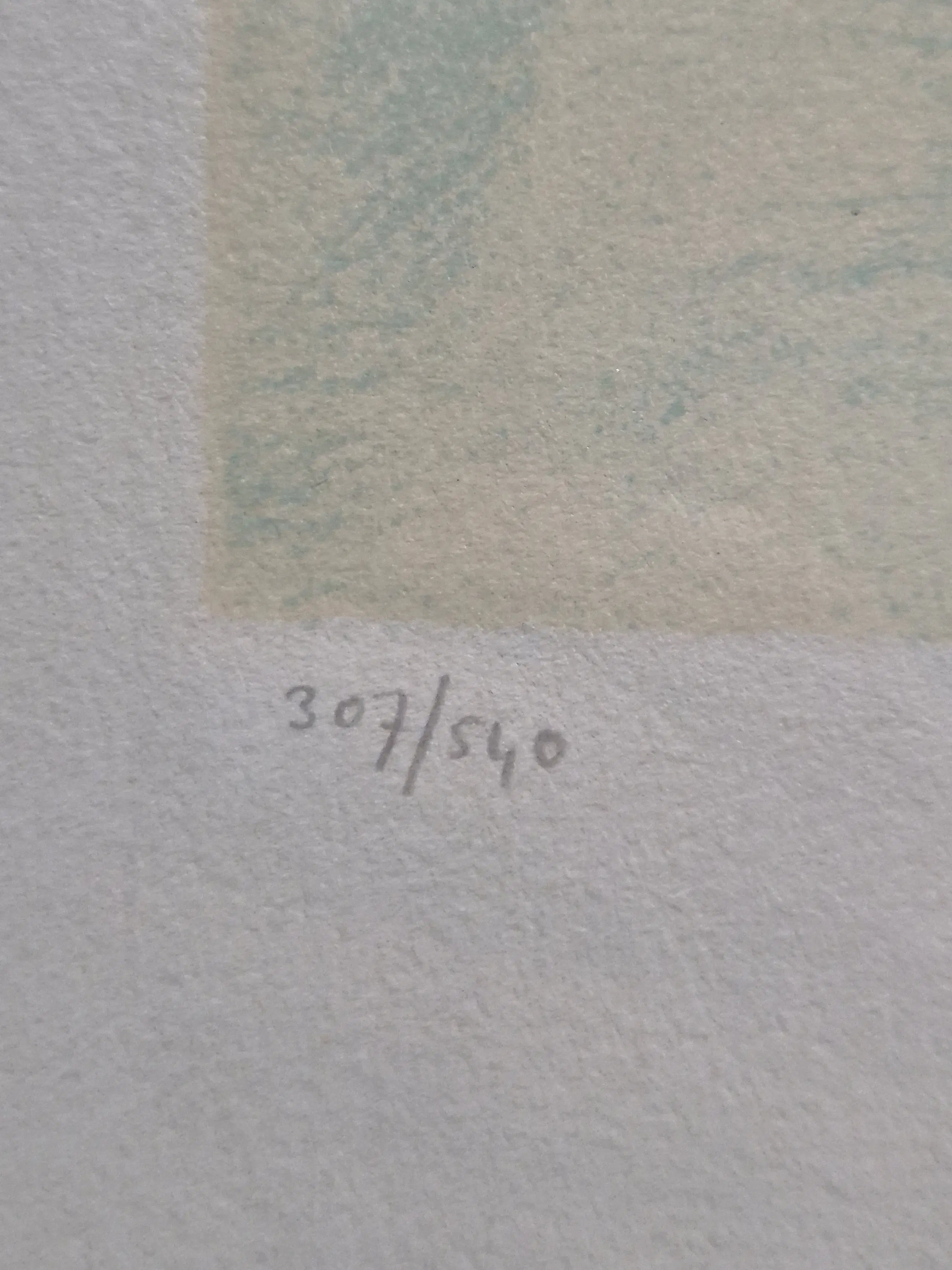 Mooi, karakteristiek werk van de Rotterdamse kunstenaar Willem van Veldhuizen. Litho op geschept papier, met potlood gesigneerd, gedateerd (‘88) en genummerd (307/540). In nette aluminium lijst. Alles in zeer goede conditie.