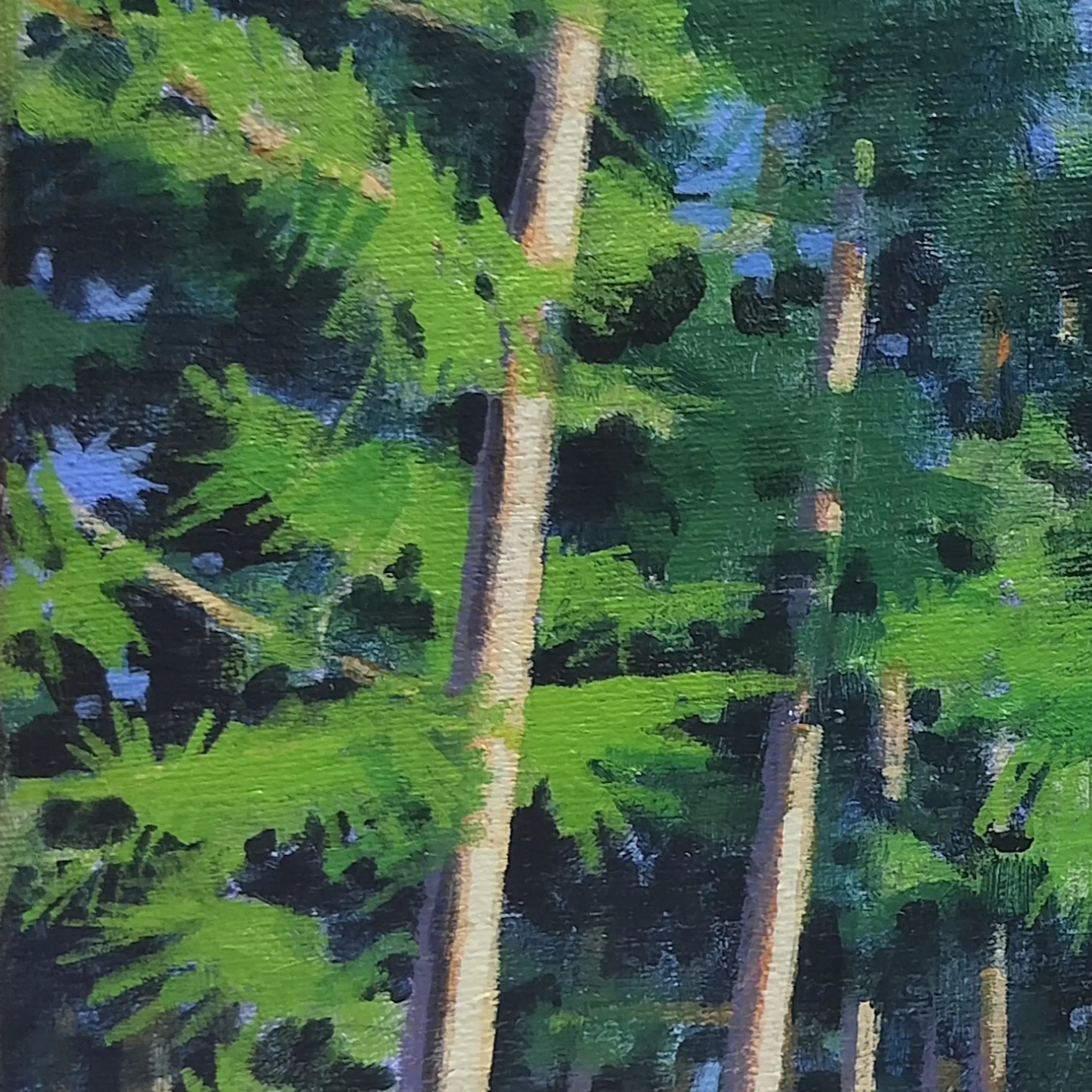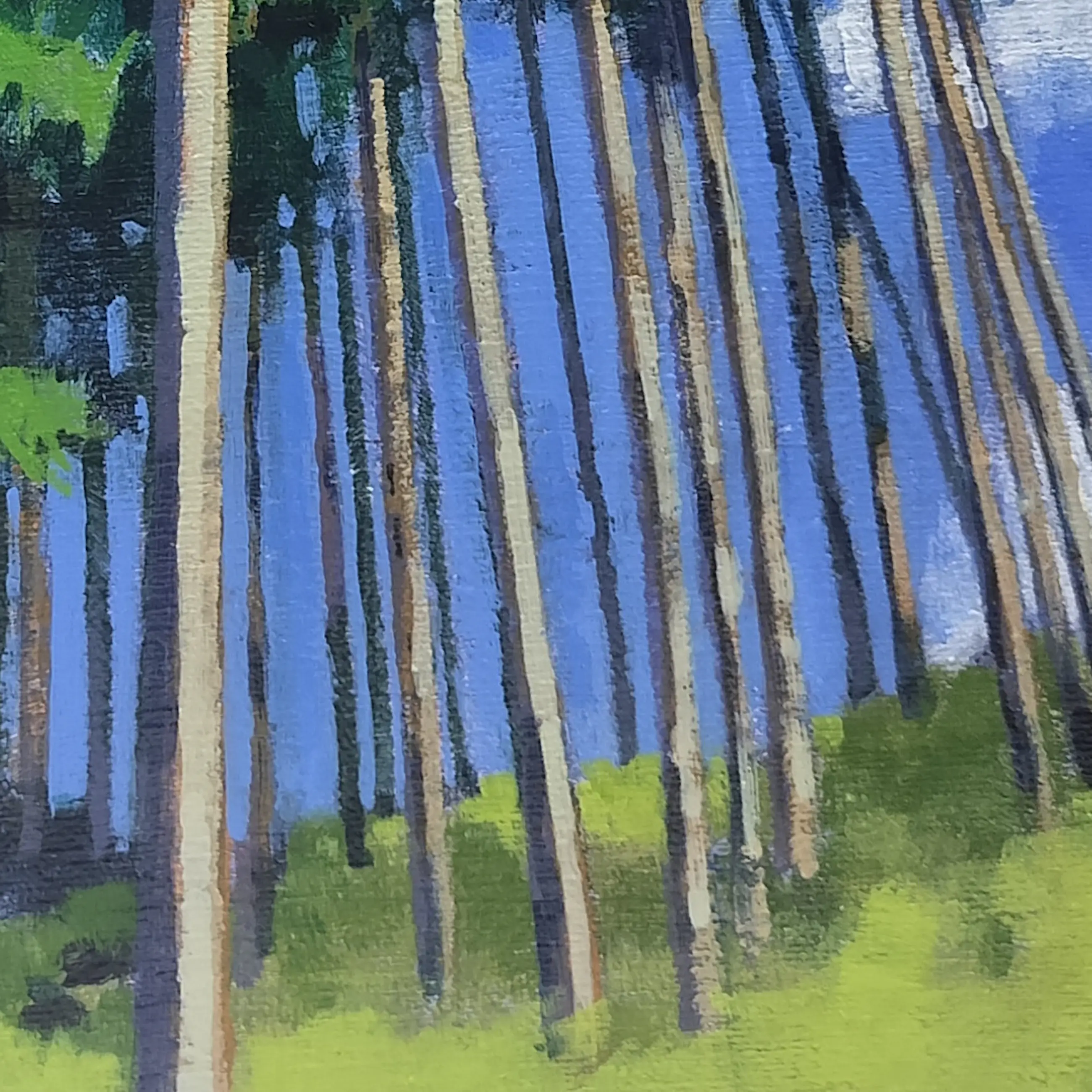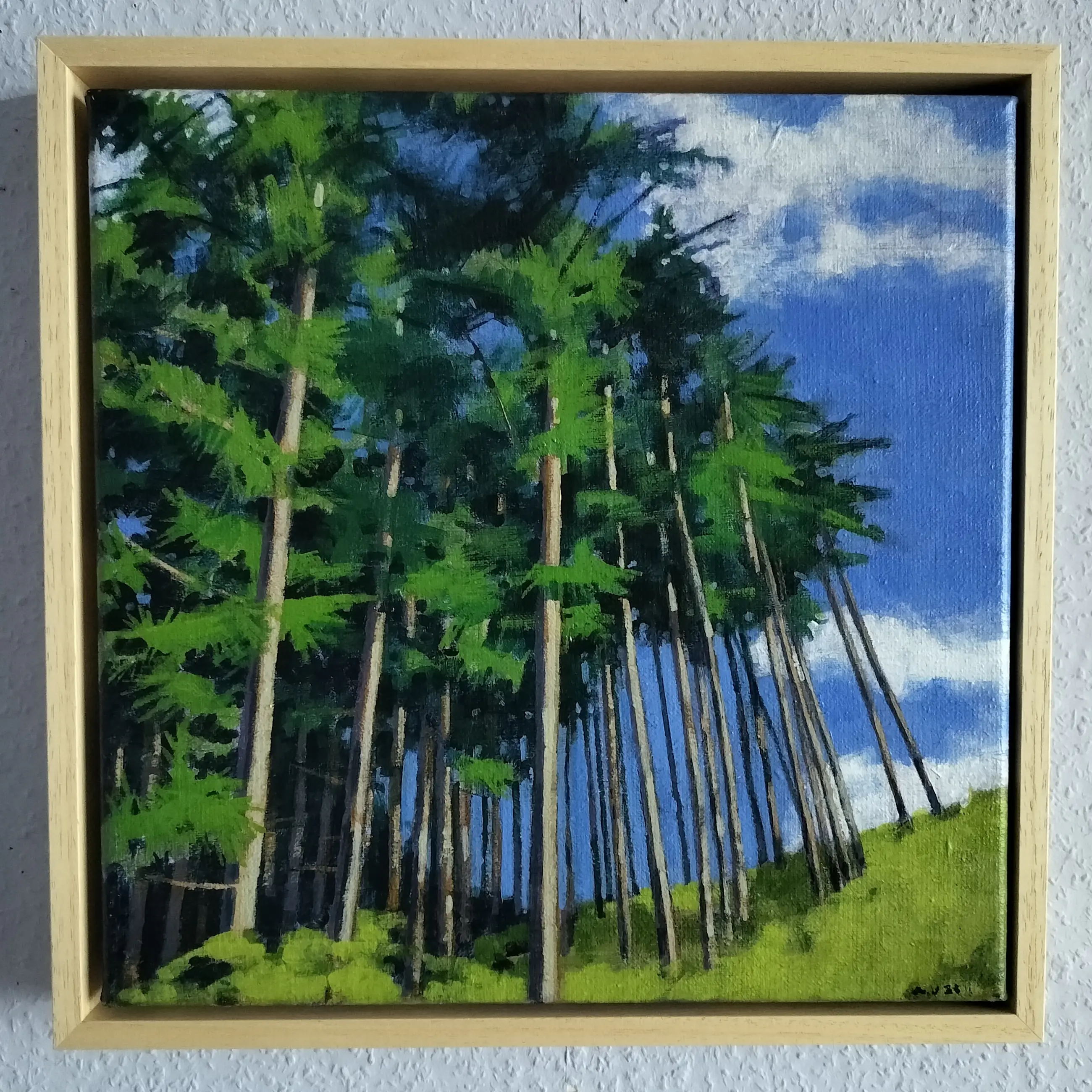 Willem Visser volgde van 1974 t/m 1979 een opleiding op de Rotterdamse Academie. Hij exposeerde regelmatig landschappen en stadsgezichten in Nederland en België. Vooral het landschap en het bosgezicht hebben zijn interesse. Werk van hem bevindt zich in particuliere en openbare collecties in binnen- en buitenland. Dit schilderij toont een bosgezicht met naaldbomen op een heuvel en is geïnspireerd door een wandeling op een zomerdag door de bossen van de Eifel. Het felle licht zorgt voor een afwisseling van donkere en lichte partijen. Willem Visser woont en werk in Rotterdam.
