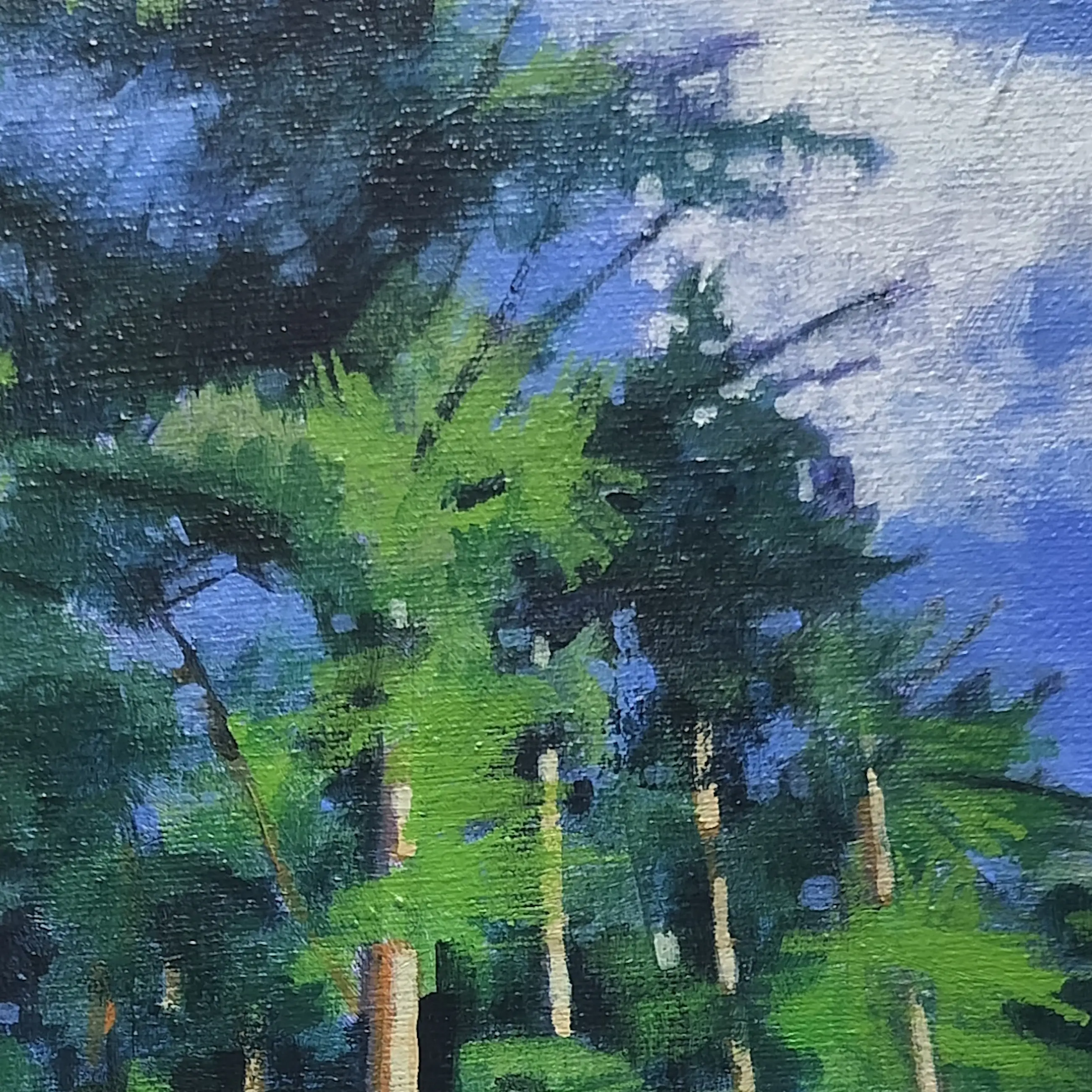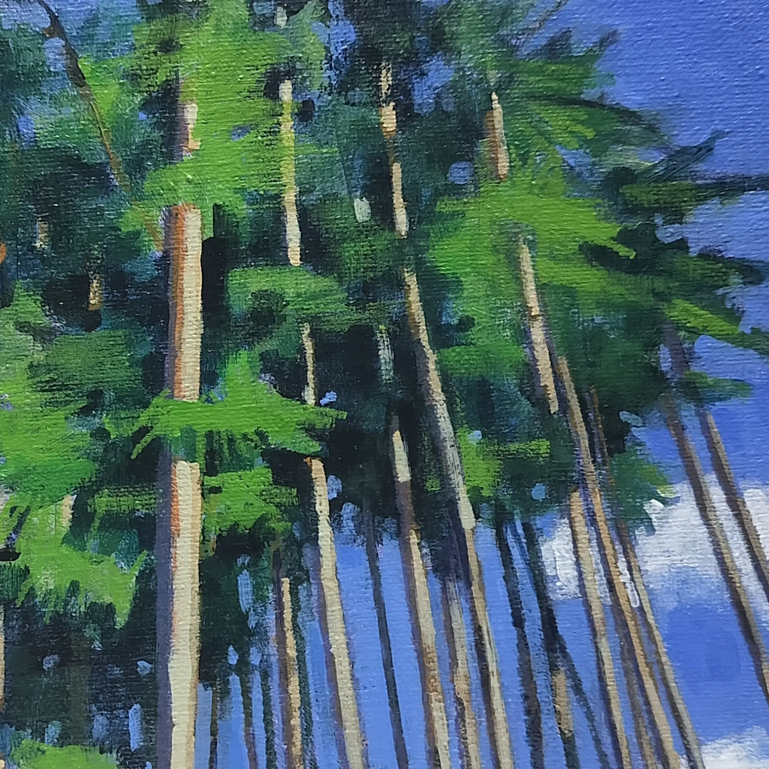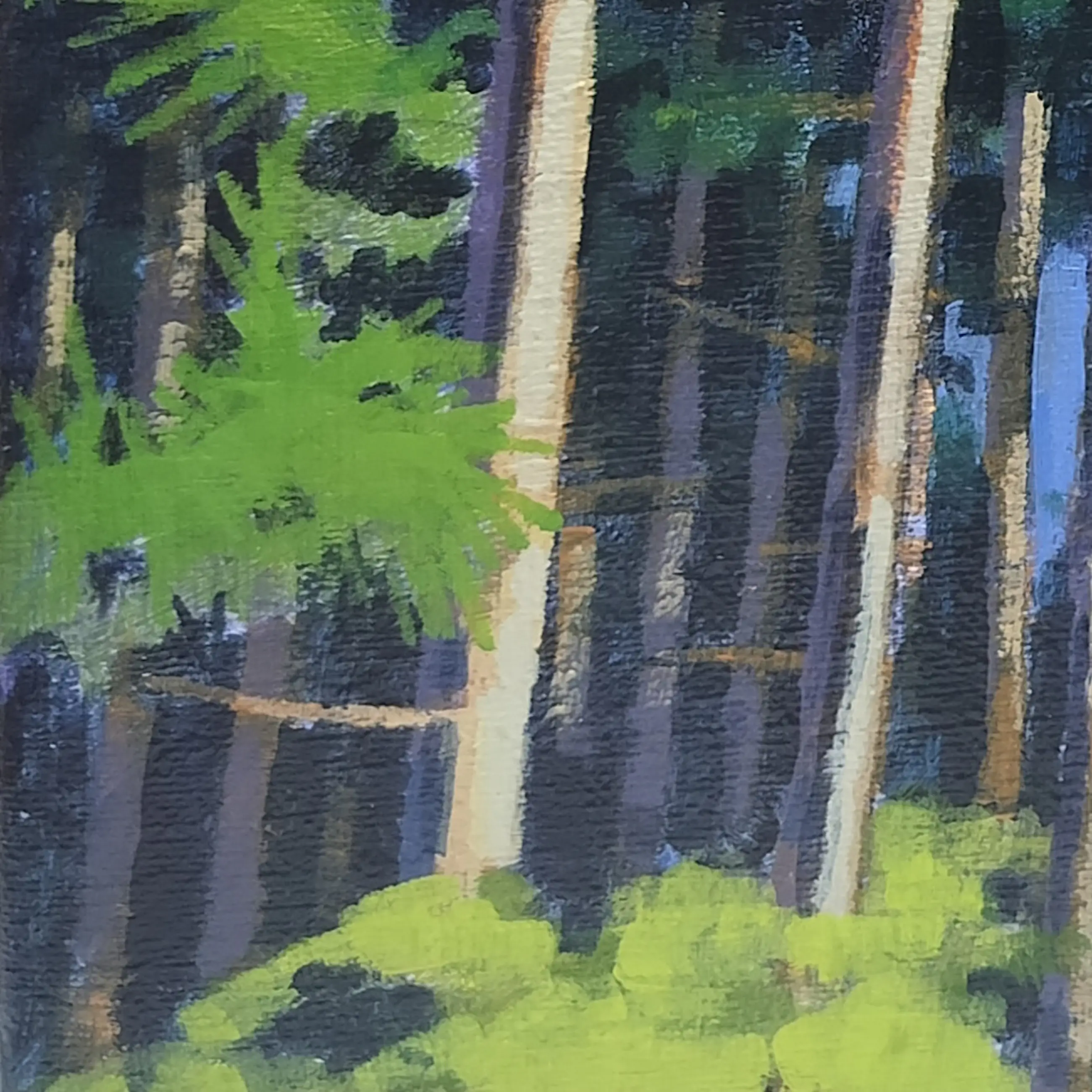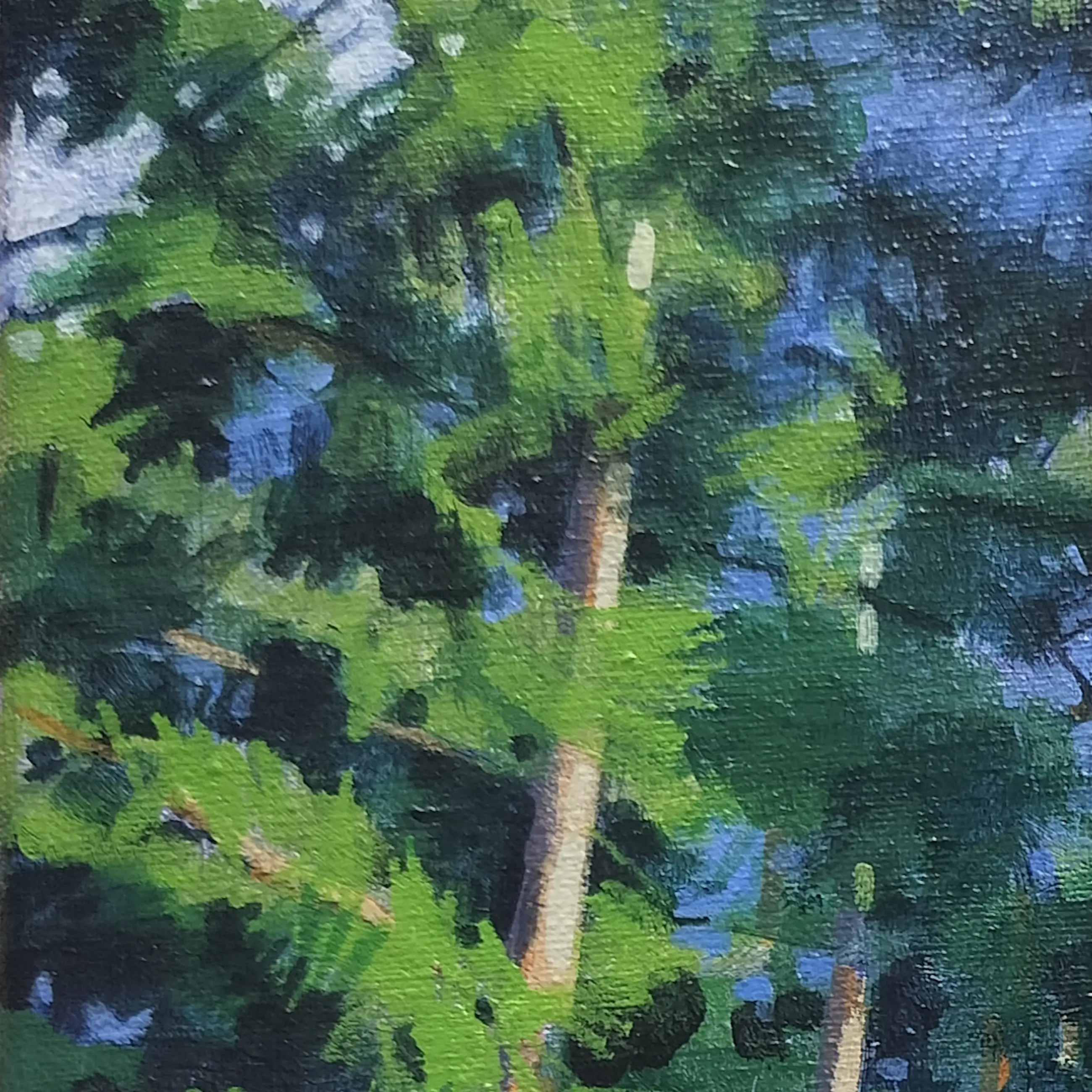 Willem Visser volgde van 1974 t/m 1979 een opleiding op de Rotterdamse Academie. Hij exposeerde regelmatig landschappen en stadsgezichten in Nederland en België. Vooral het landschap en het bosgezicht hebben zijn interesse. Werk van hem bevindt zich in particuliere en openbare collecties in binnen- en buitenland. Dit schilderij toont een bosgezicht met naaldbomen op een heuvel en is geïnspireerd door een wandeling op een zomerdag door de bossen van de Eifel. Het felle licht zorgt voor een afwisseling van donkere en lichte partijen. Willem Visser woont en werk in Rotterdam.