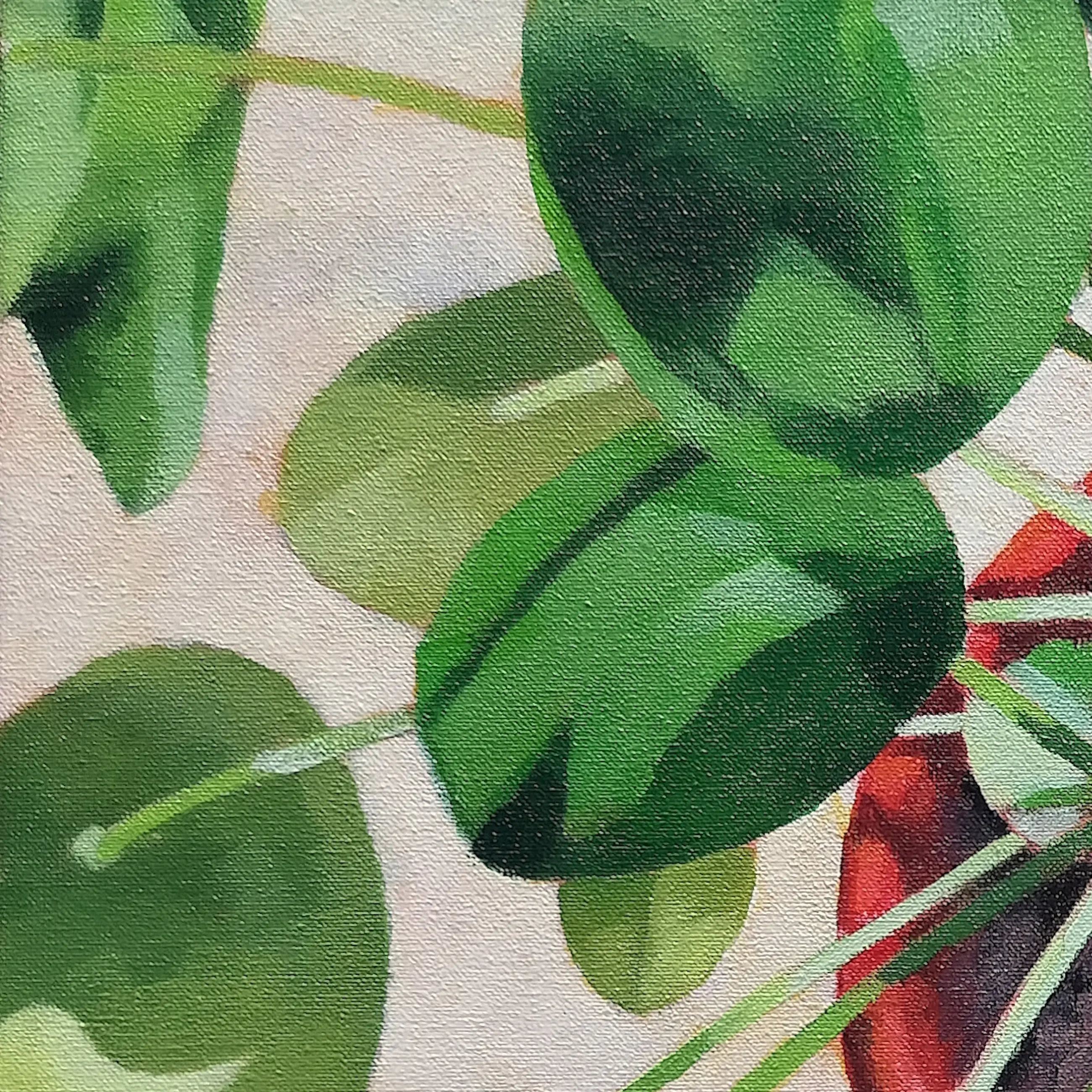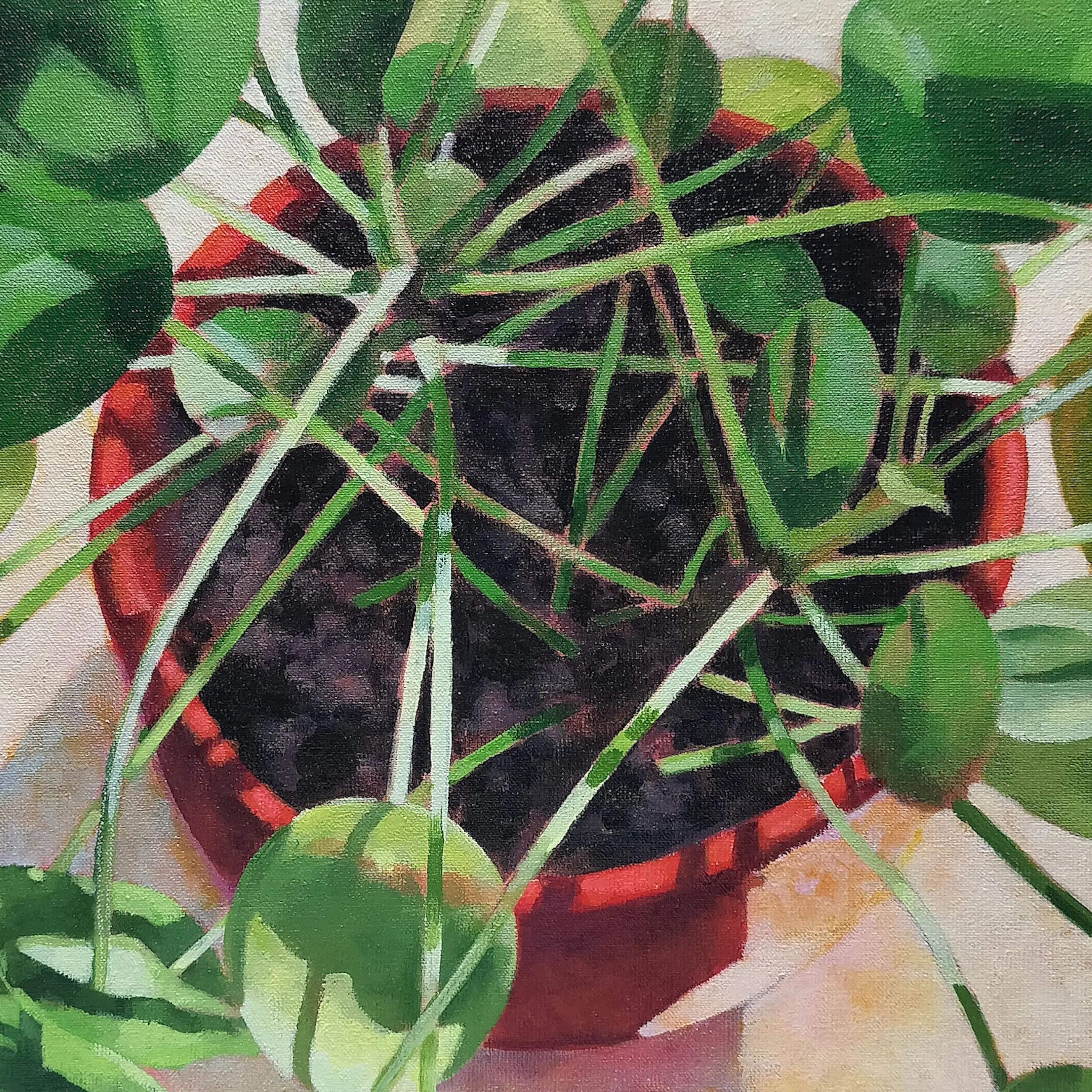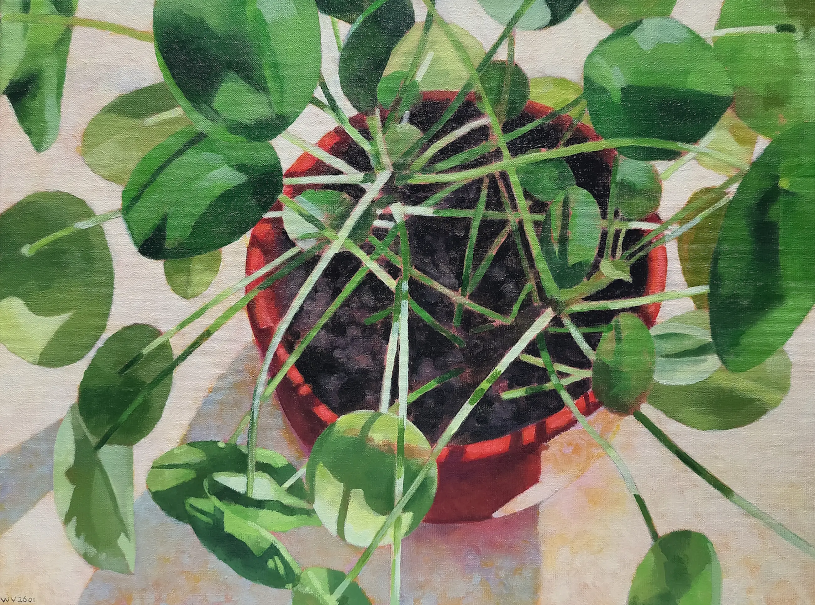 Dit schilderij heeft als onderwerp de pannenkoekplant. De pannenkoekenplant is een plant uit de brandnetelfamilie, oorspronkelijk afkomstig uit China. Ze hebben opvallend grote ronde bladeren en vlezige stengels. De bladeren hebben een doorsnede van ongeveer 10 cm en staan iets uit het midden op de bladsteel.