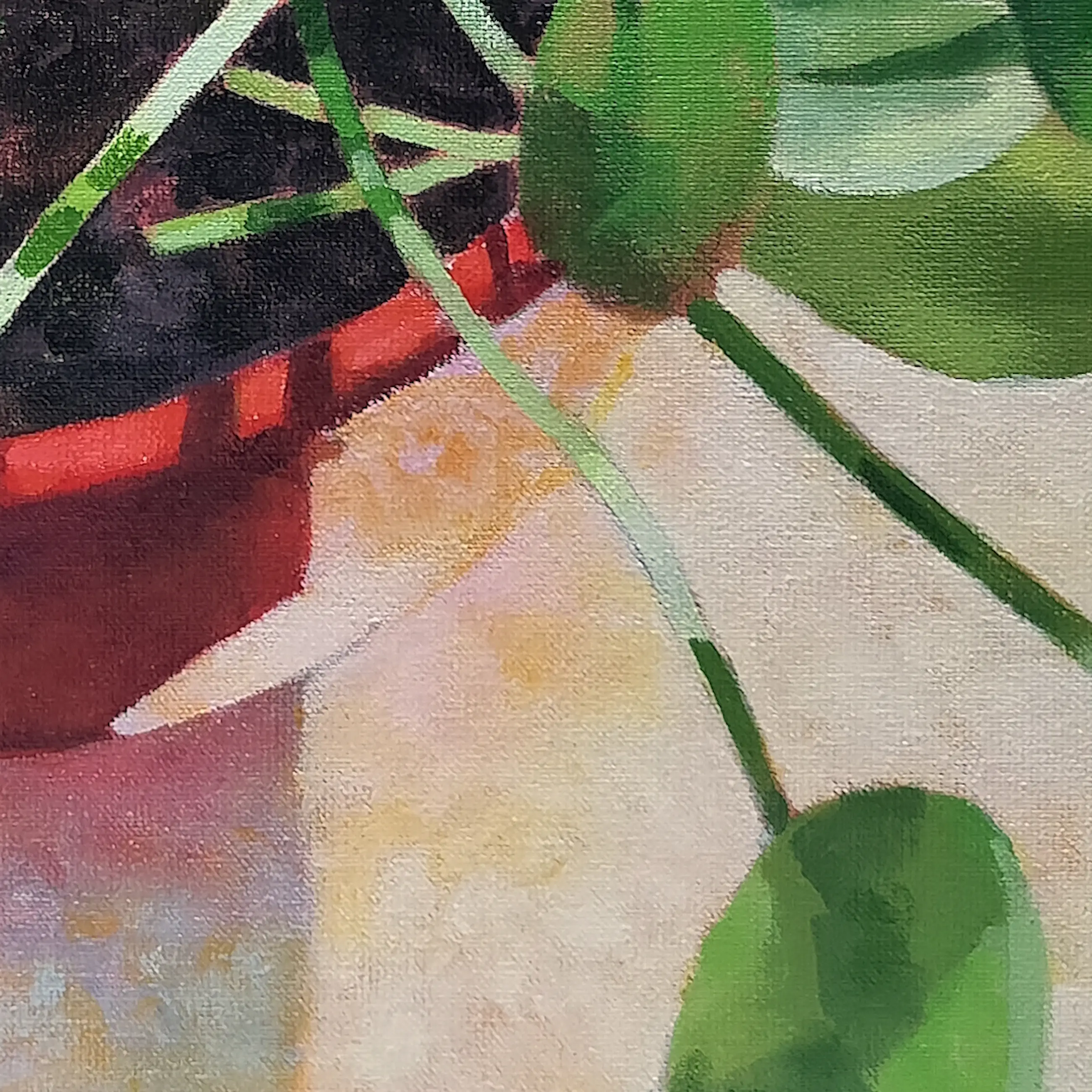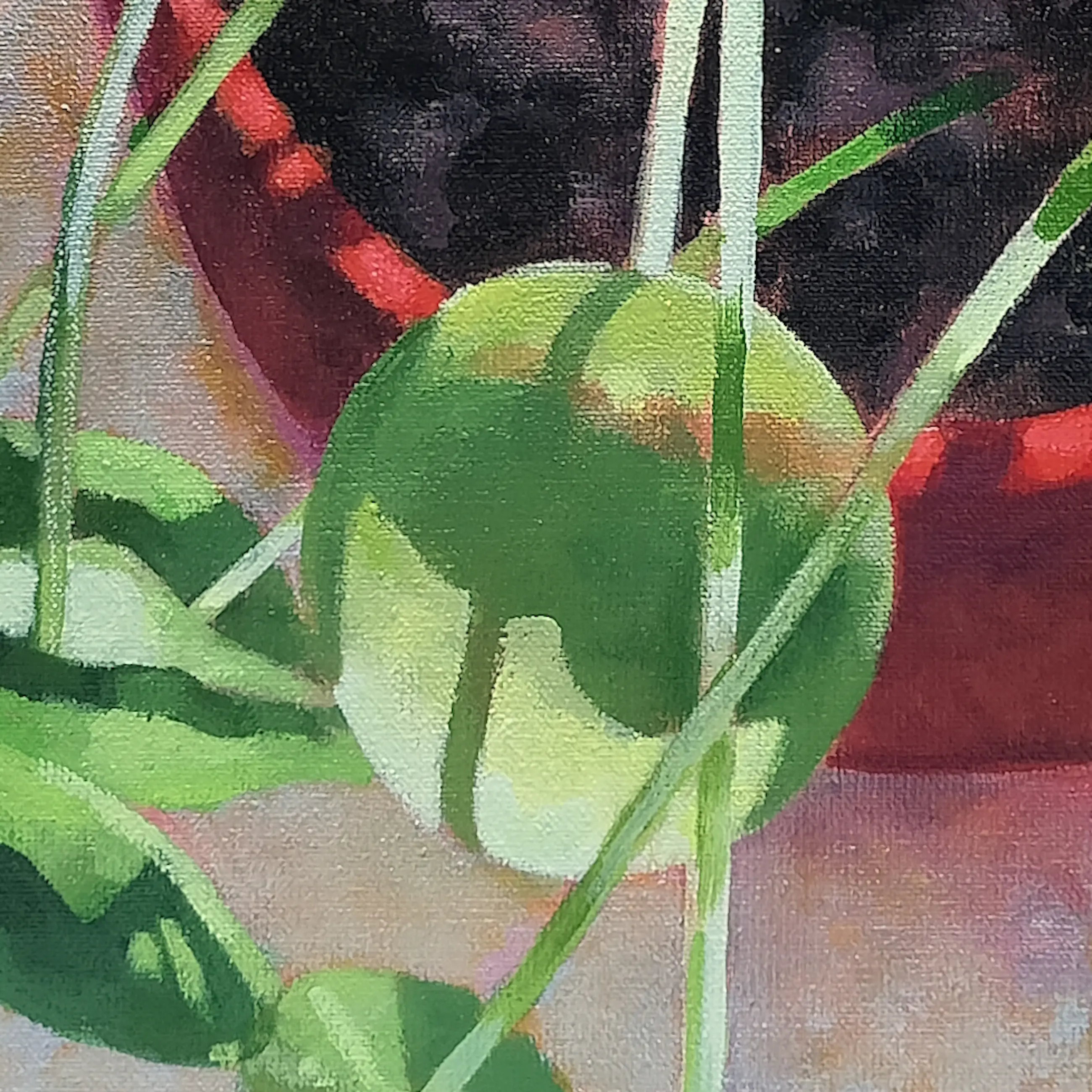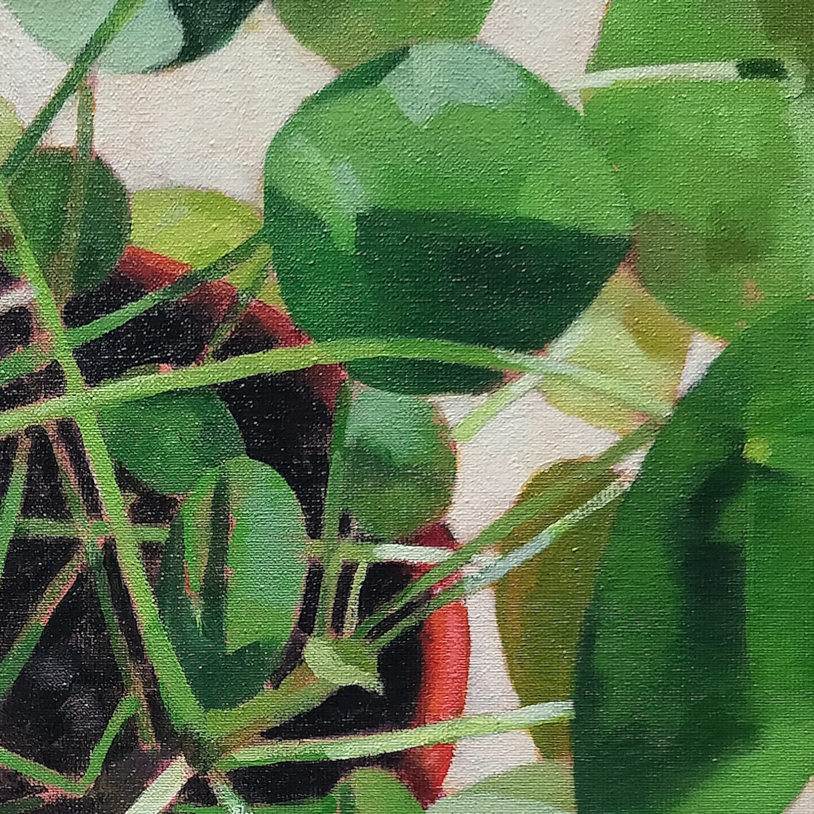 Dit schilderij heeft als onderwerp de pannenkoekplant. De pannenkoekenplant is een plant uit de brandnetelfamilie, oorspronkelijk afkomstig uit China. Ze hebben opvallend grote ronde bladeren en vlezige stengels. De bladeren hebben een doorsnede van ongeveer 10 cm en staan iets uit het midden op de bladsteel.