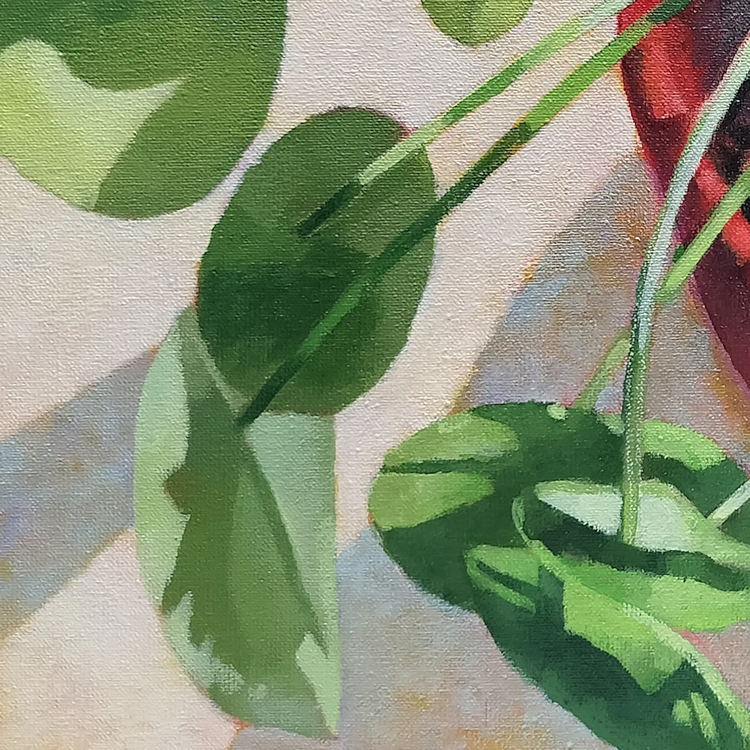 Visser zelf over de planten en het schilderij: 'Ze zijn een lust voor het schildersoog. Als 's ochtends de zon in de woonkamer schijnt, ziet het er wel heel feestelijk uit. Zeker als het zonlicht dan door de bladeren schijnt, waardoor deze felgroen kleuren, met schaduwen, slagschaduwen en felle lichtpartijen. Dit schilderij was met andere woorden een klein feestje om te schilderen.'