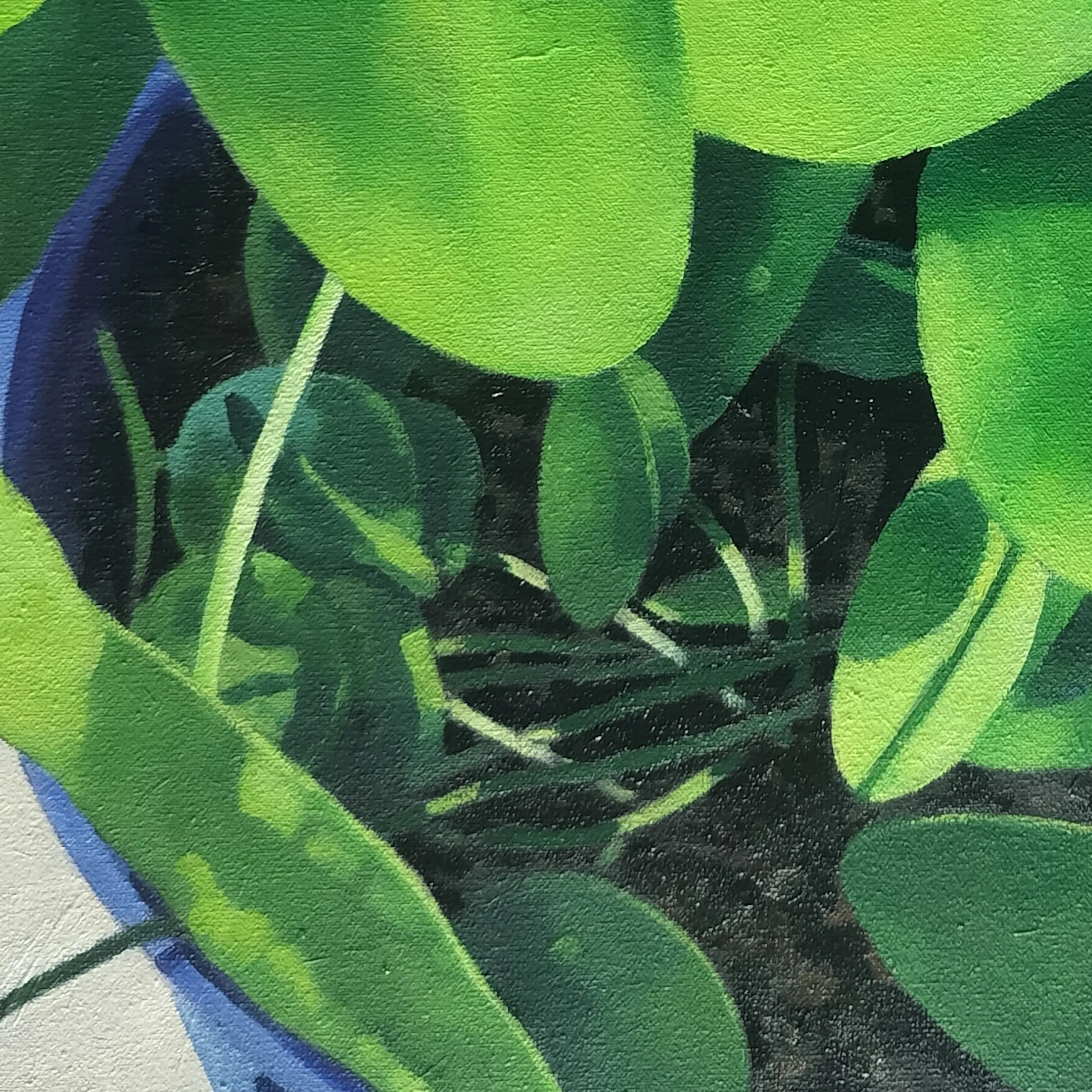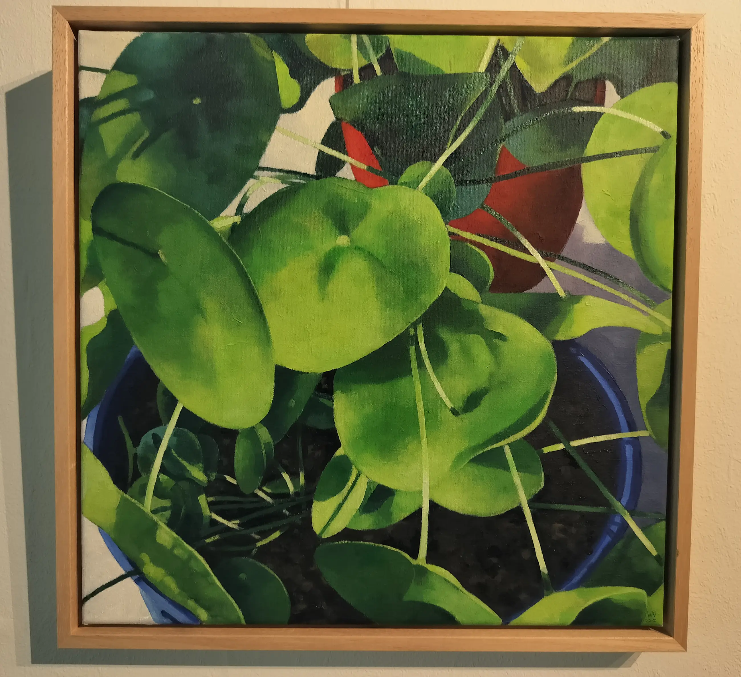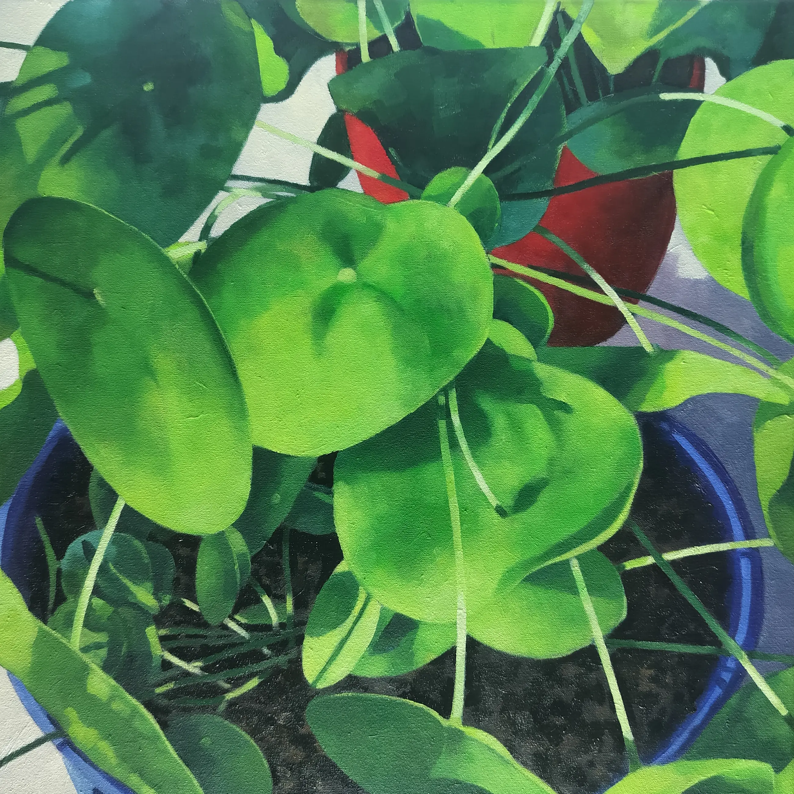 Dit schilderij heeft als onderwerp de pannenkoekplant. De pannenkoekenplant is een plant uit de brandnetelfamilie, oorspronkelijk afkomstig uit China. Ze hebben opvallend grote ronde bladeren en vlezige stengels. De bladeren hebben een doorsnede van ongeveer 10 cm en staan iets uit het midden op de bladsteel.