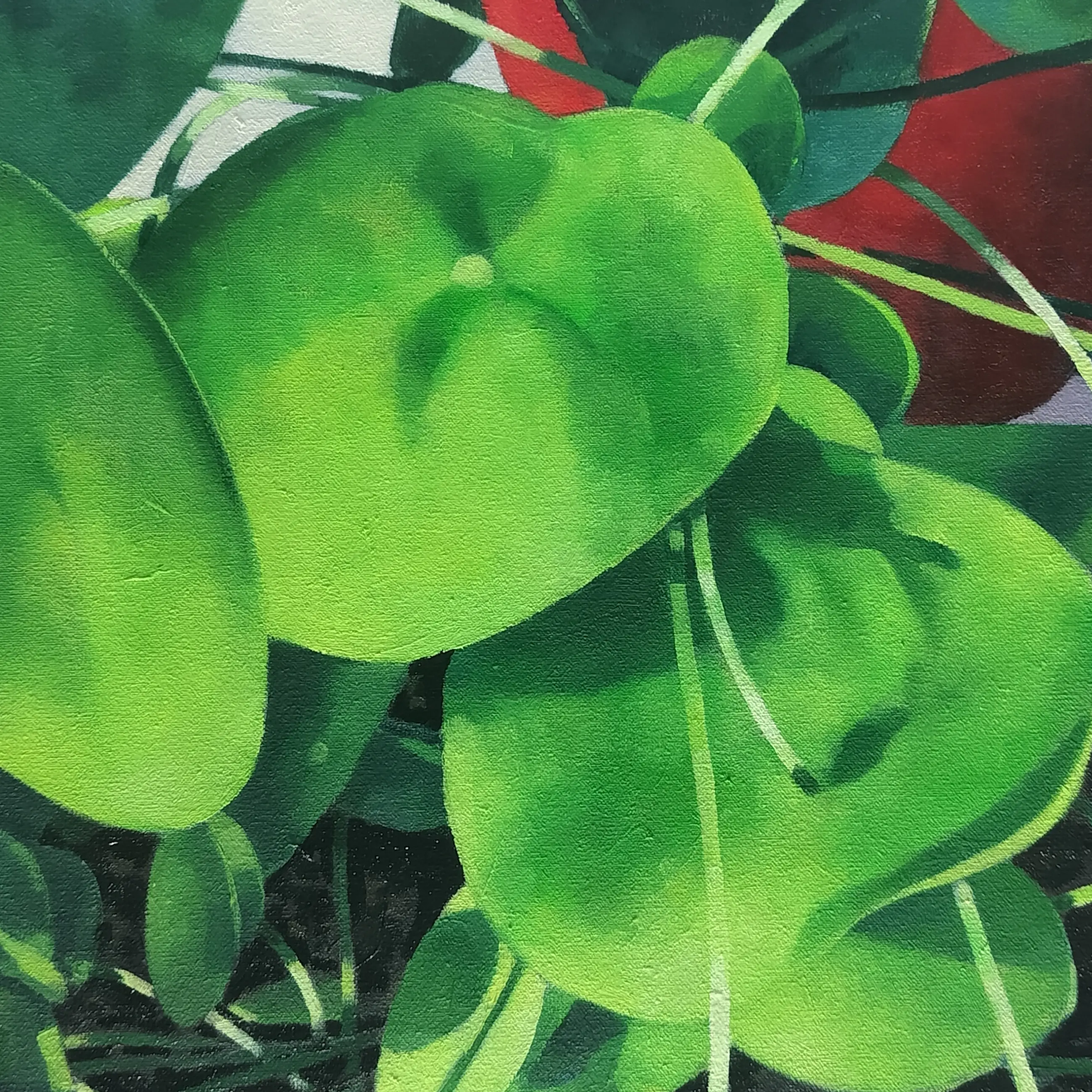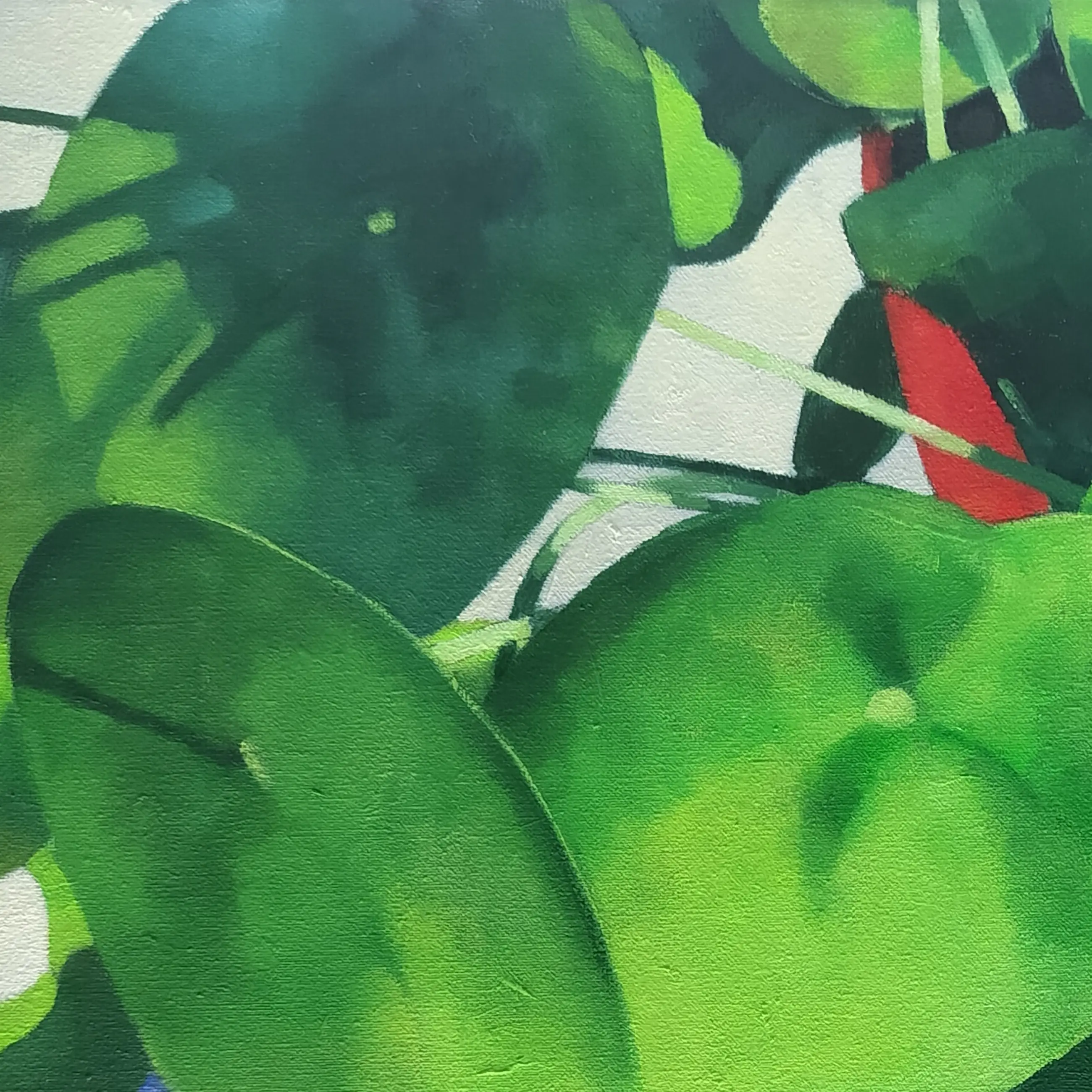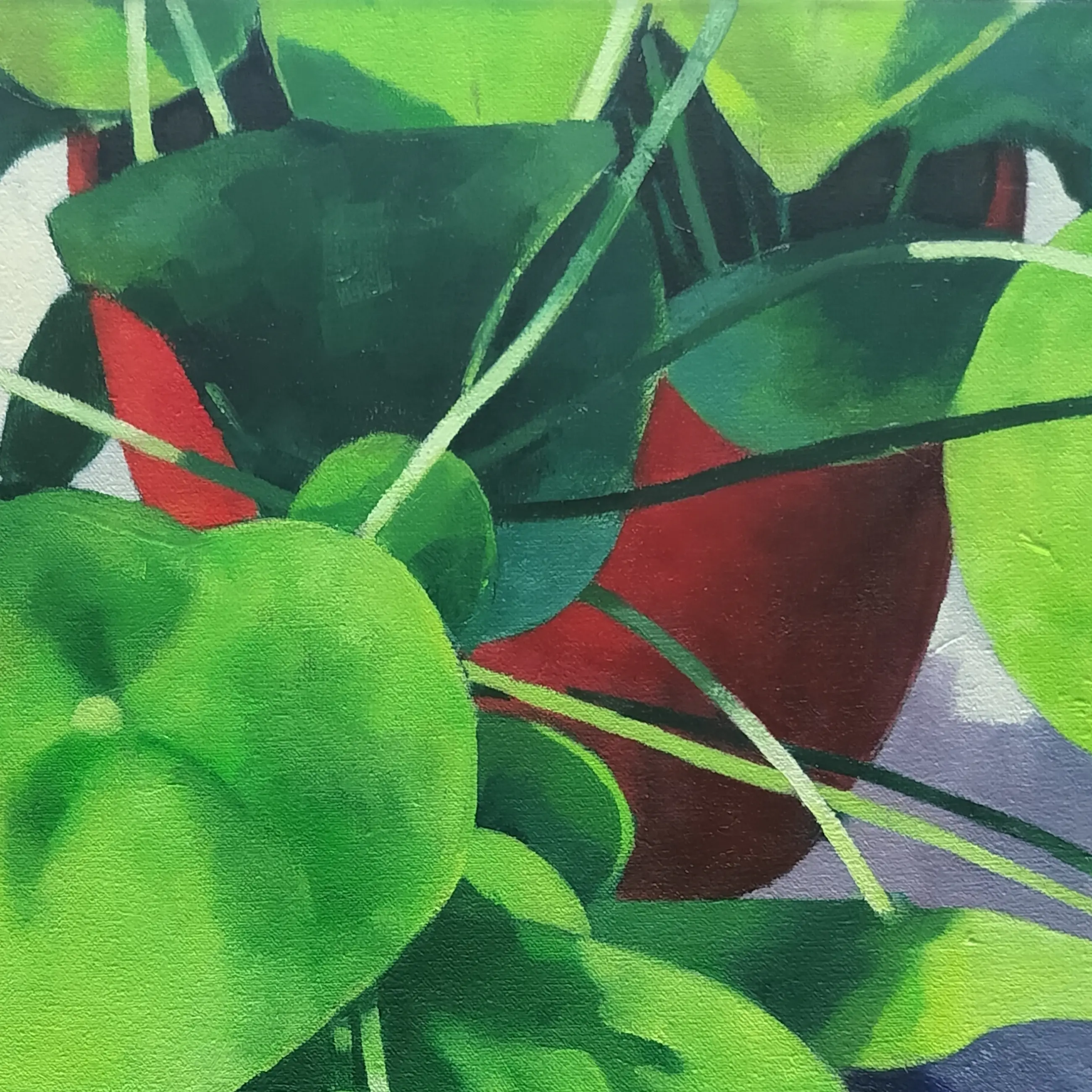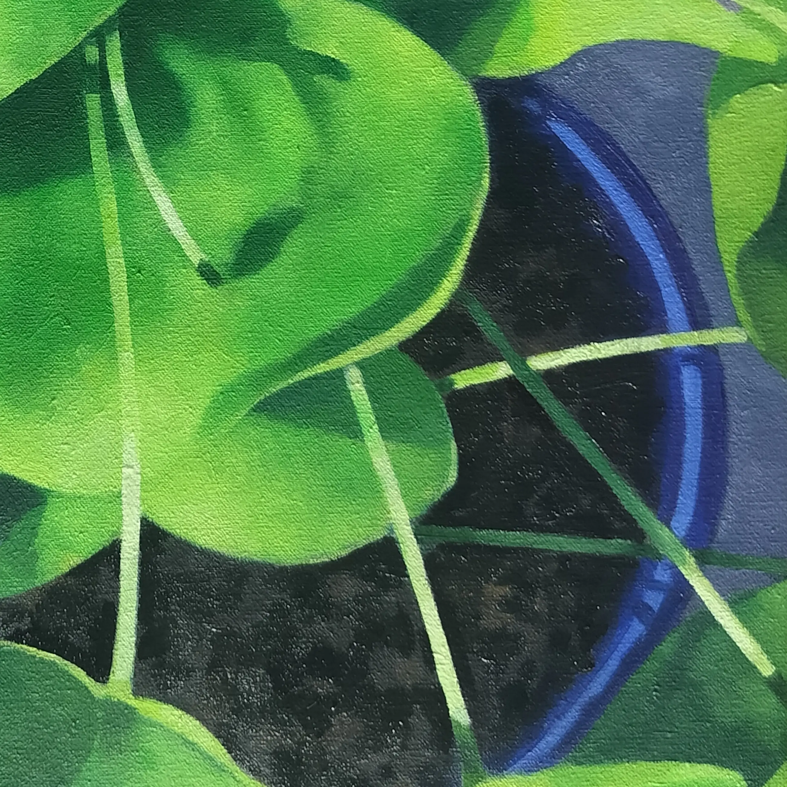 Dit schilderij heeft als onderwerp de pannenkoekplant. De pannenkoekenplant is een plant uit de brandnetelfamilie, oorspronkelijk afkomstig uit China. Ze hebben opvallend grote ronde bladeren en vlezige stengels. De bladeren hebben een doorsnede van ongeveer 10 cm en staan iets uit het midden op de bladsteel.