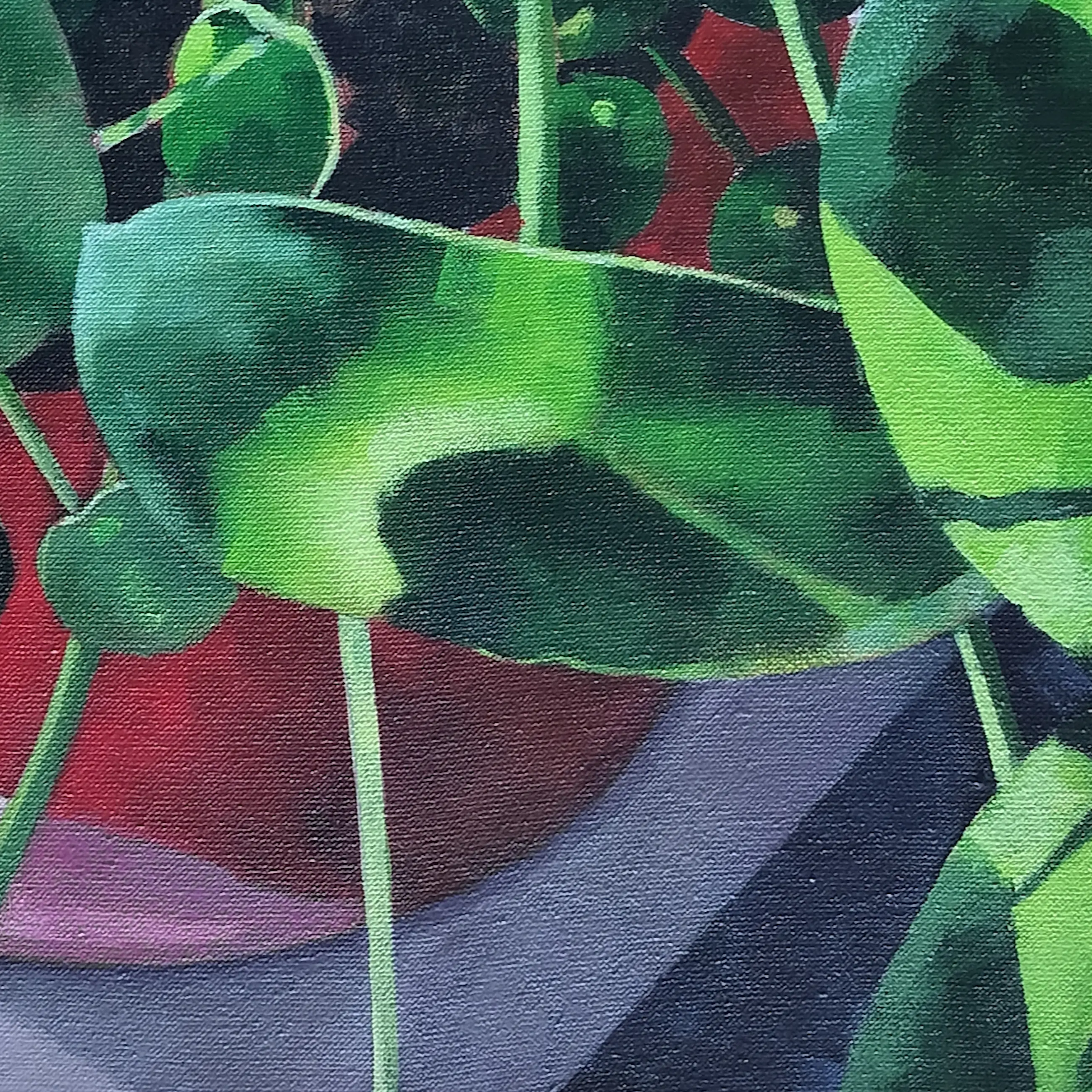 Dit schilderij heeft als onderwerp de pannenkoekplant. De pannenkoekenplant is een plant uit de brandnetelfamilie, oorspronkelijk afkomstig uit China. Ze hebben opvallend grote ronde bladeren en vlezige stengels. De bladeren hebben een doorsnede van ongeveer 10 cm en staan iets uit het midden op de bladsteel.