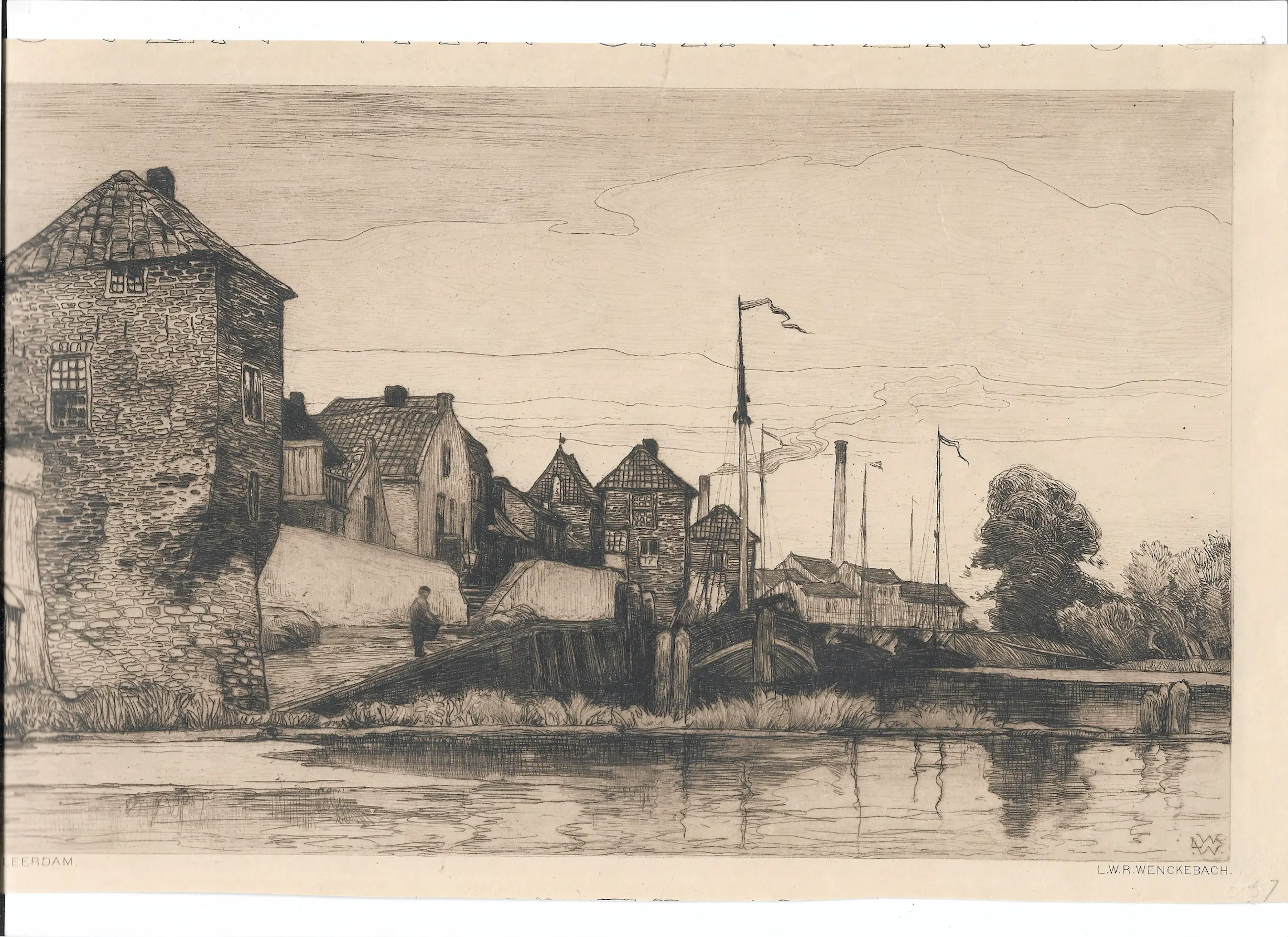 Willem Wenckebach (1860-1937) heeft diverse Leerdamse stadsgezichten getekend, geschilderd en geëtst. Waarom juist Leerdam ? ... " ... waar niemand komt als hij er niet wezen moet ..." maar van de andere kant ook een stadje ... " ... zéér behaaglijk voor het schildersoog ..."