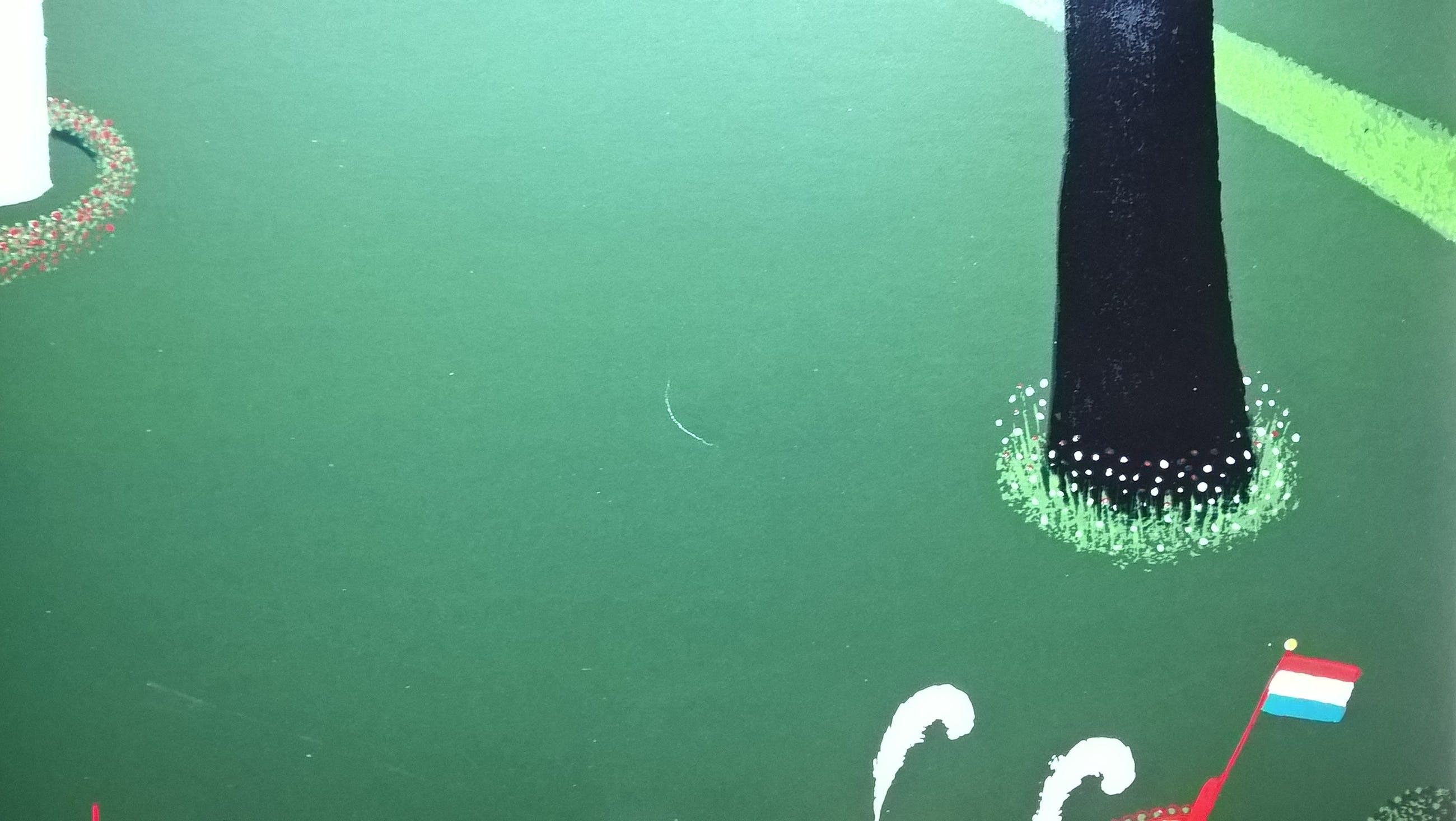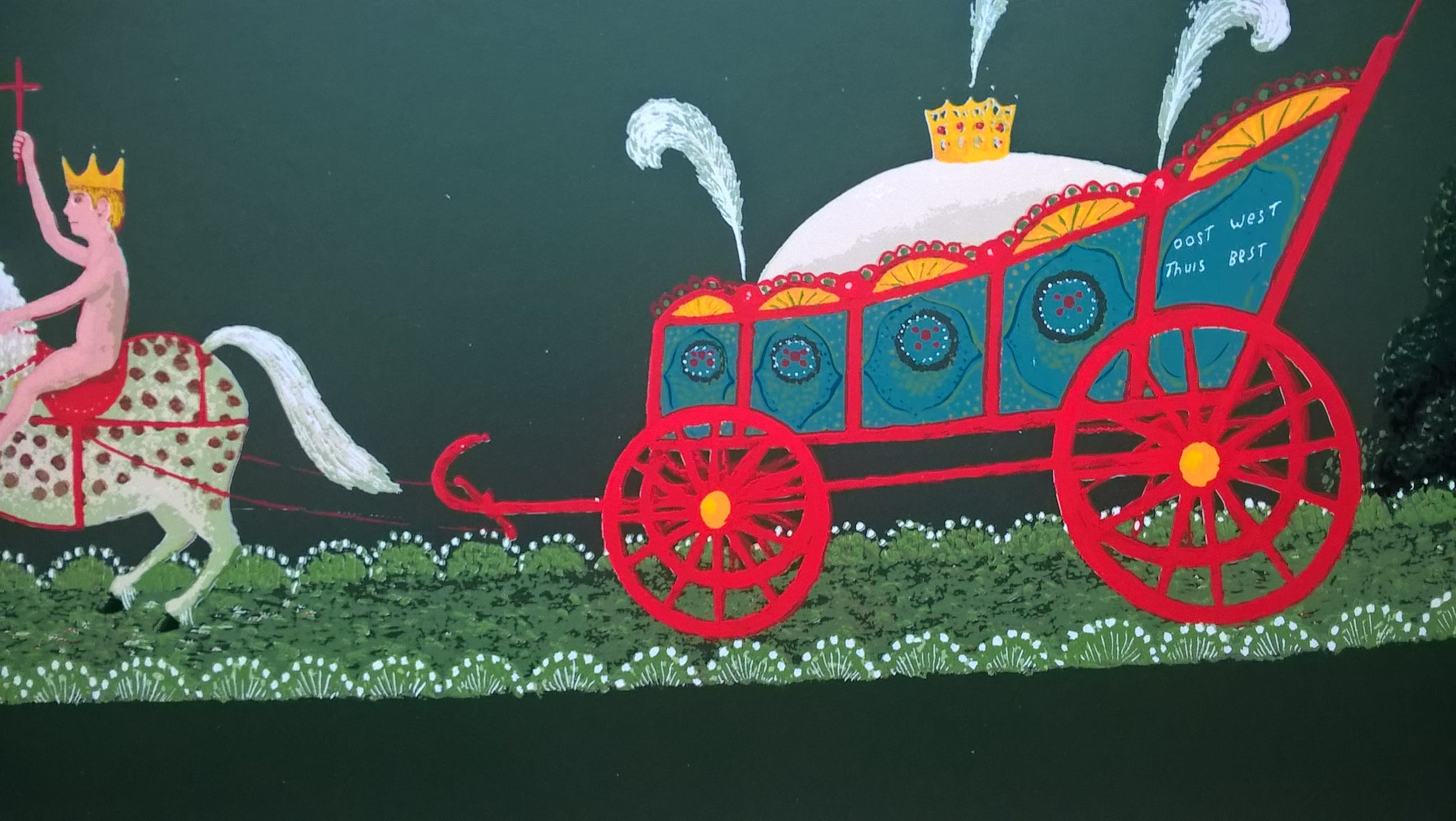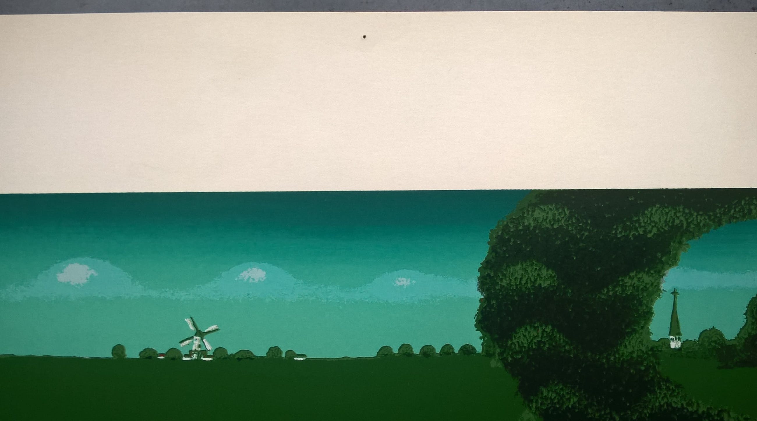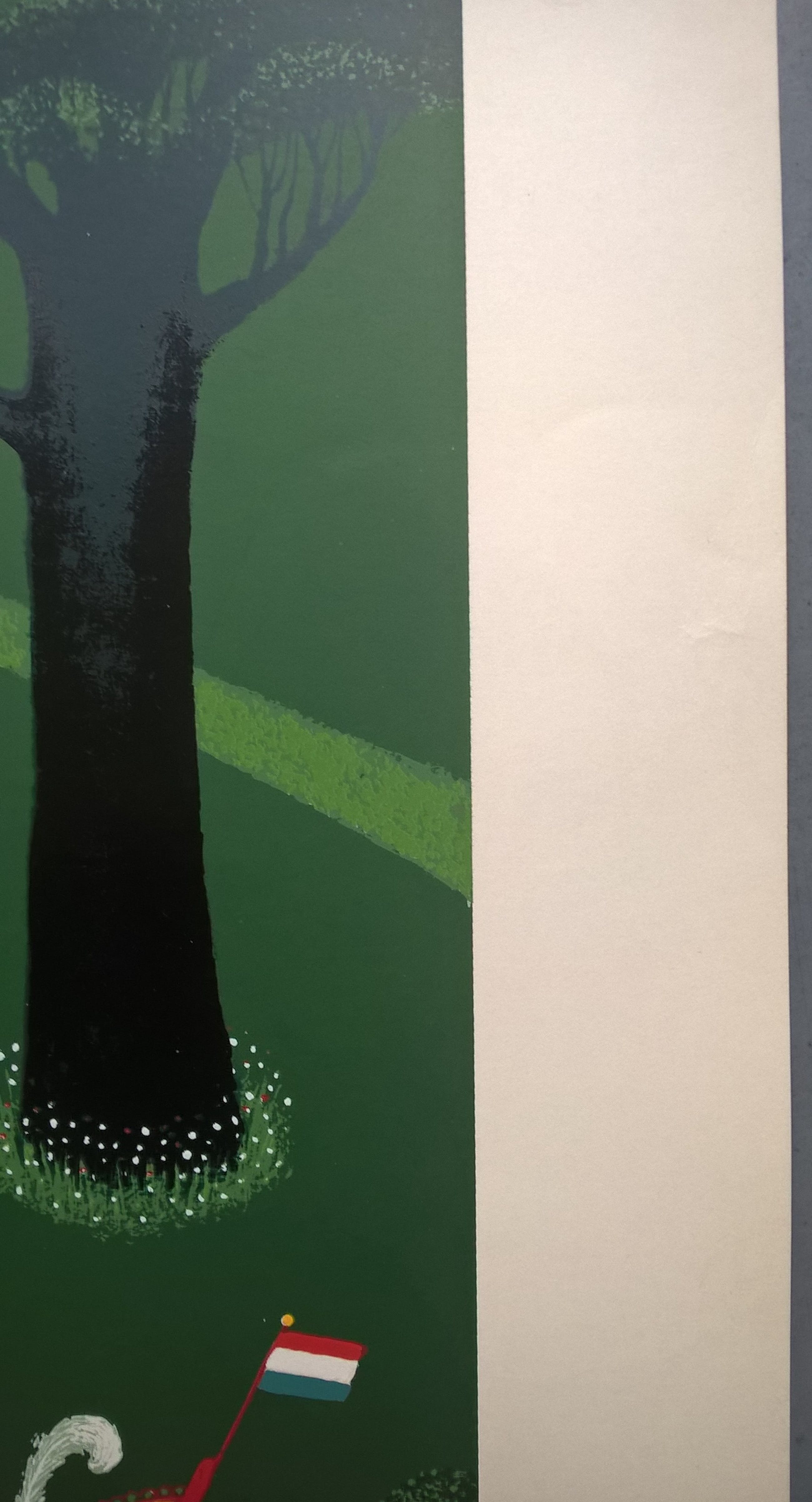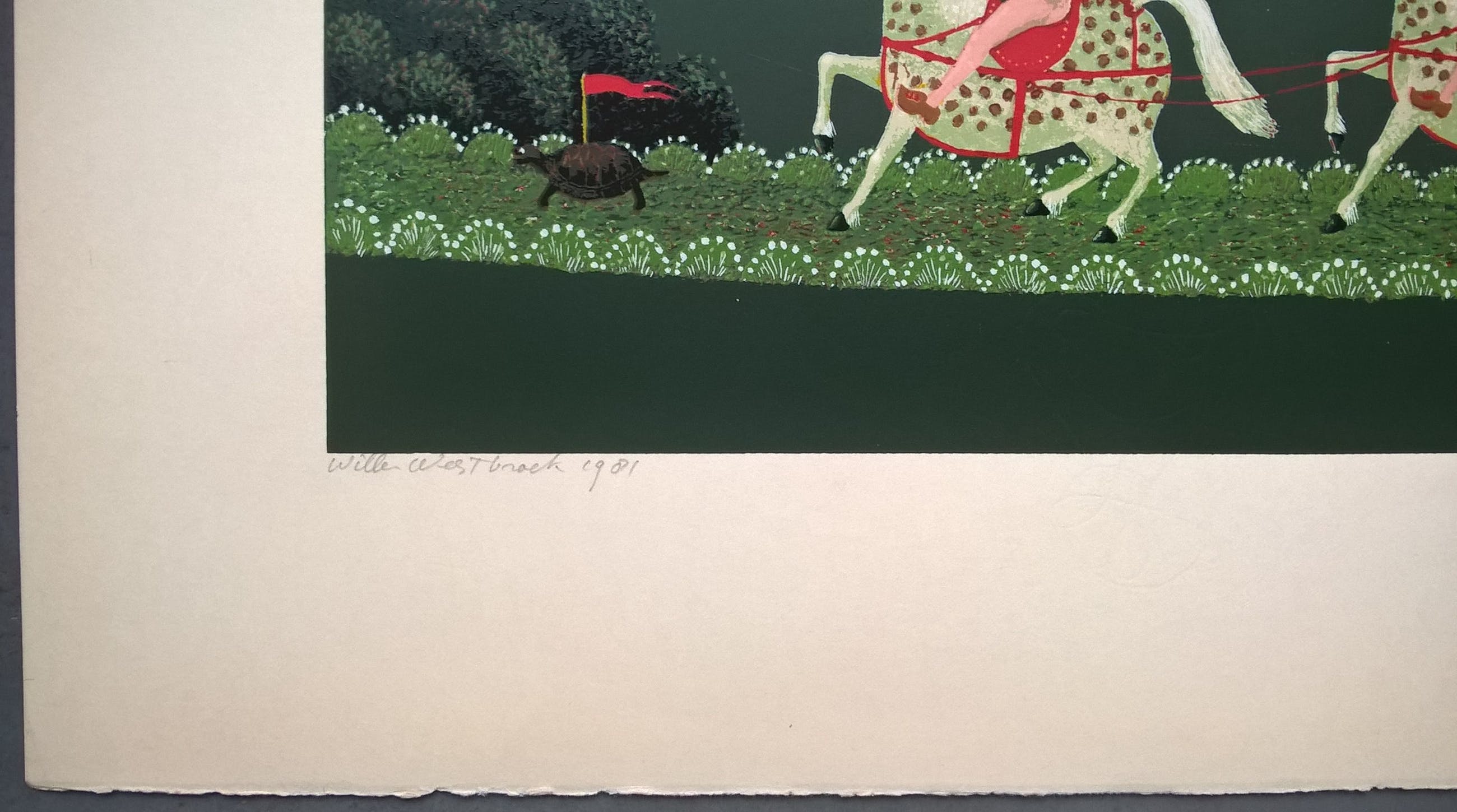Zeefdruk van de kunstenaar Willem Westbroek. Linksonder is het werk gesigneerd in potlood met Willem Westbroek 1981. Het werk is niet genummerd. Beeldmaat 50 x 60 cm. Papiermaat 63 x 72 cm. In beeld zitten een krasje van 2 cm in het papier. In de wit marge zit hier en daar een vlekje en links aan de rand is het papier licht gekreukt. Boven in het midden zit een punaise gaatje. Verder goed.