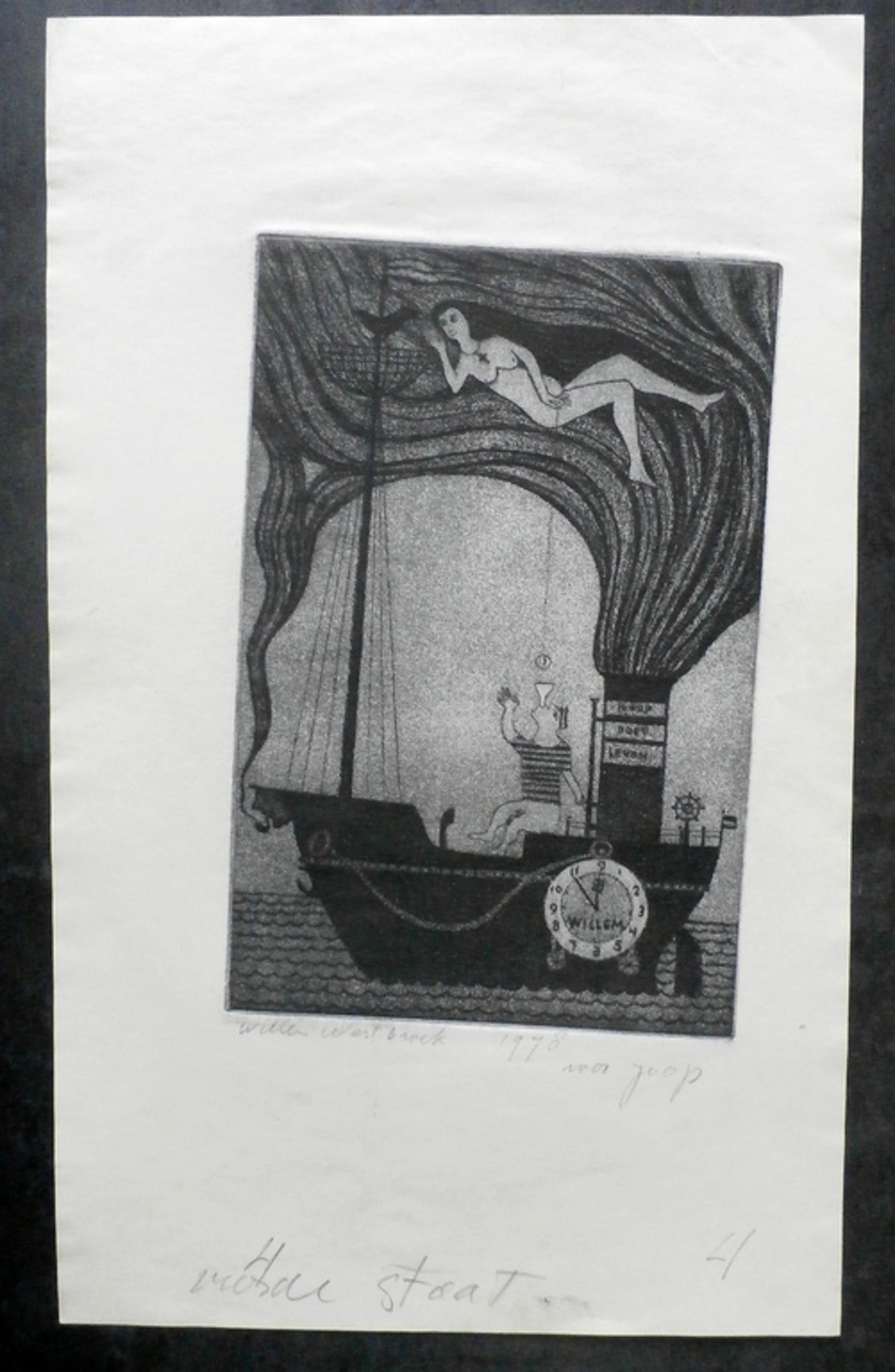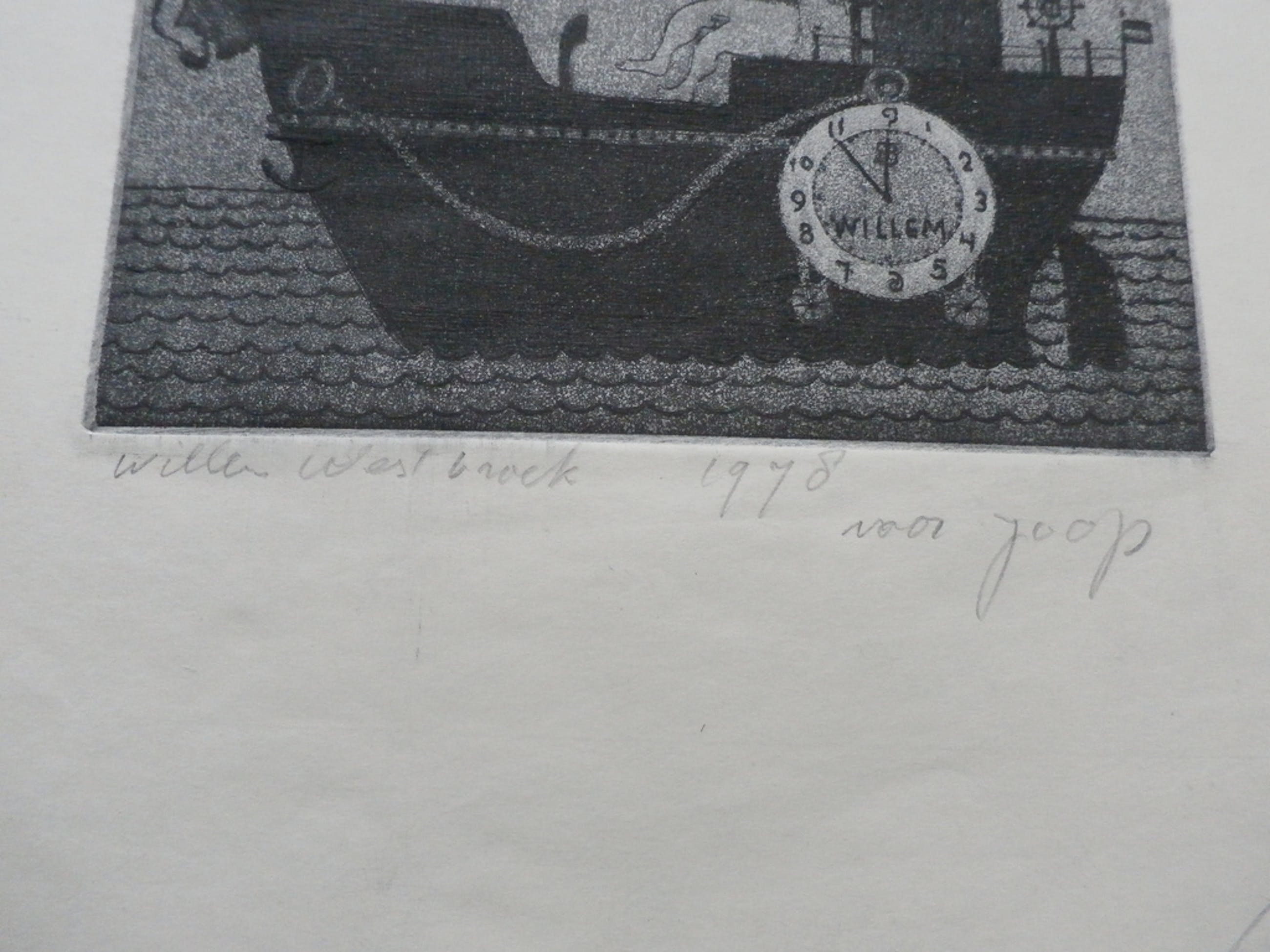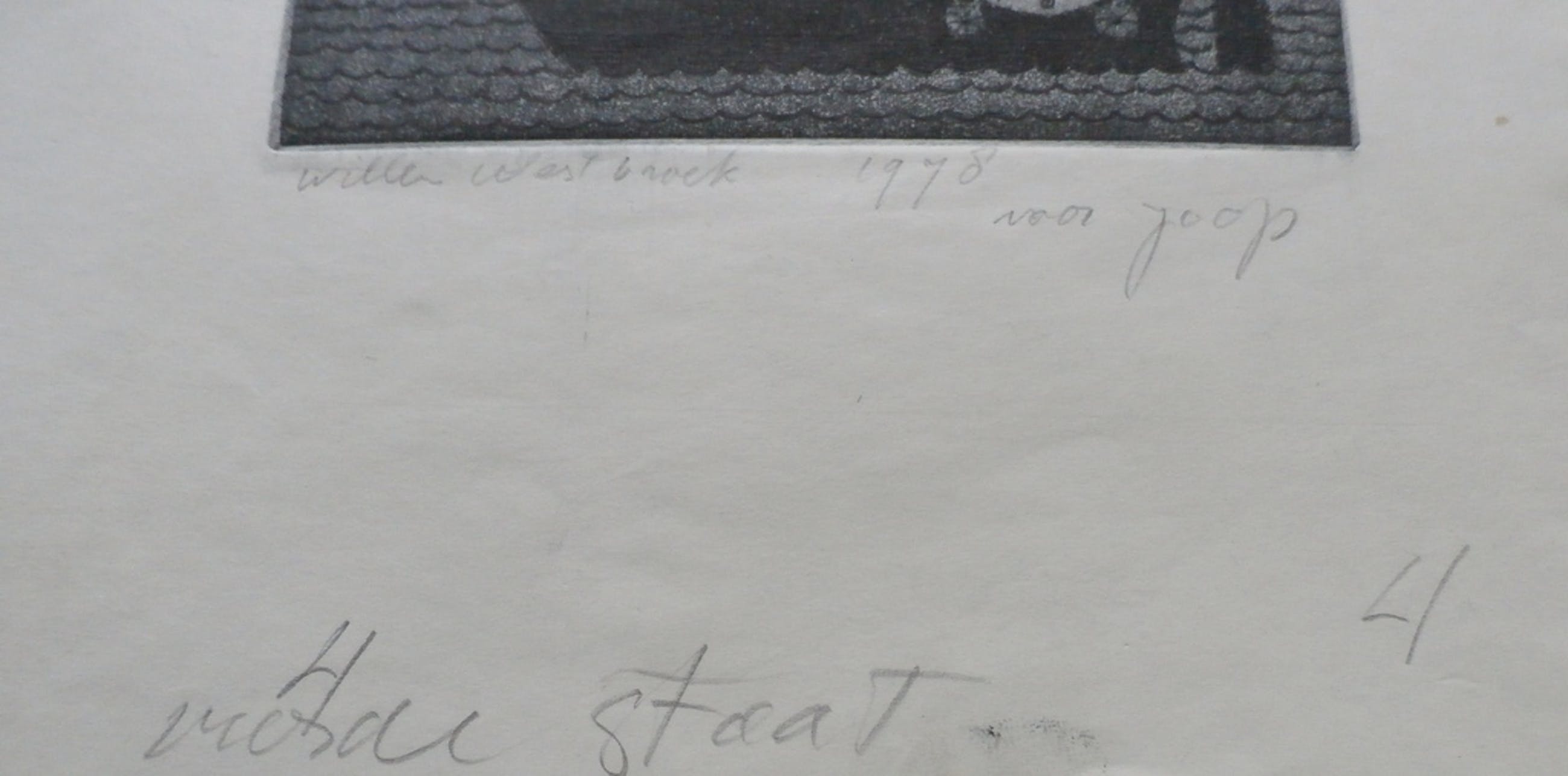 Ets van Willem Westbroek uit 1978. Druk: 4e staat. De ets is linksonder, met potlood, gesigneerd door de kunstenaar. Opdracht: Voor Joop. Afmetingen blad: H33 x b20,5 cm. Afmetingen ets: H19,5 x b13 cm. Conditie: in goede staat. De authenciteit van deze werken wordt volledig gegarandeerd. Een certificaat van echtheid kan, op aanvraag, worden meegeleverd.