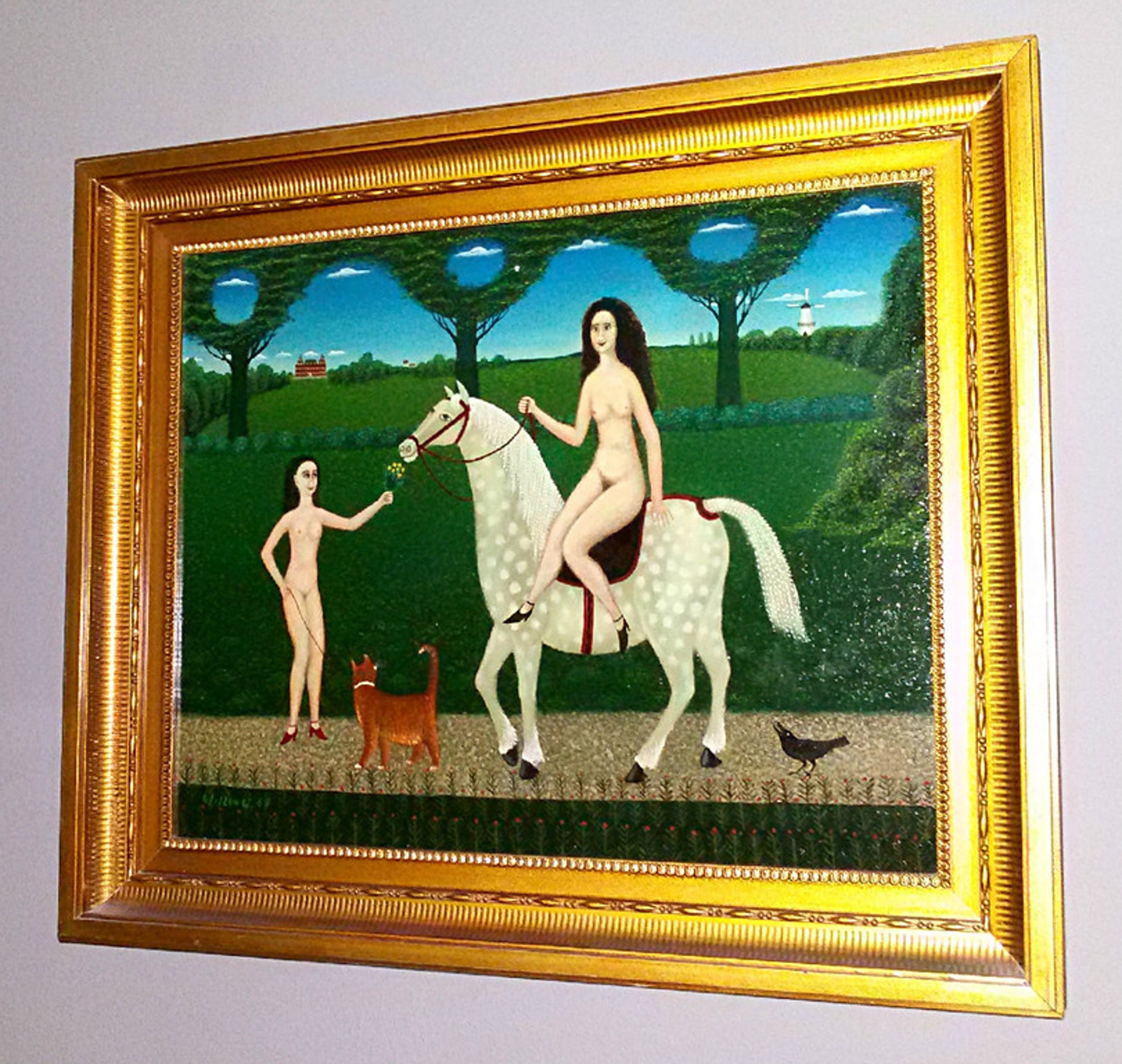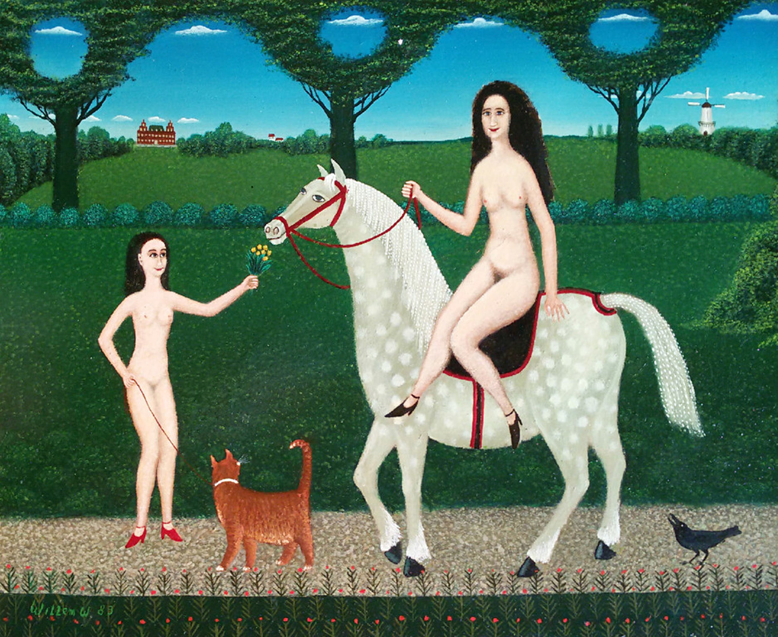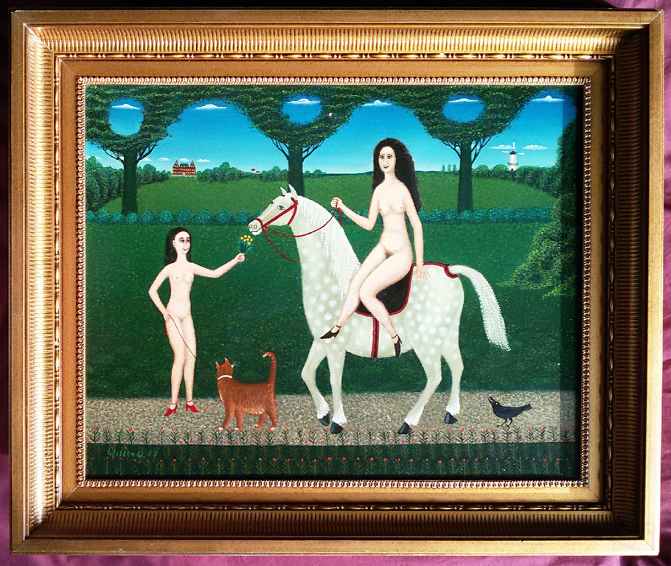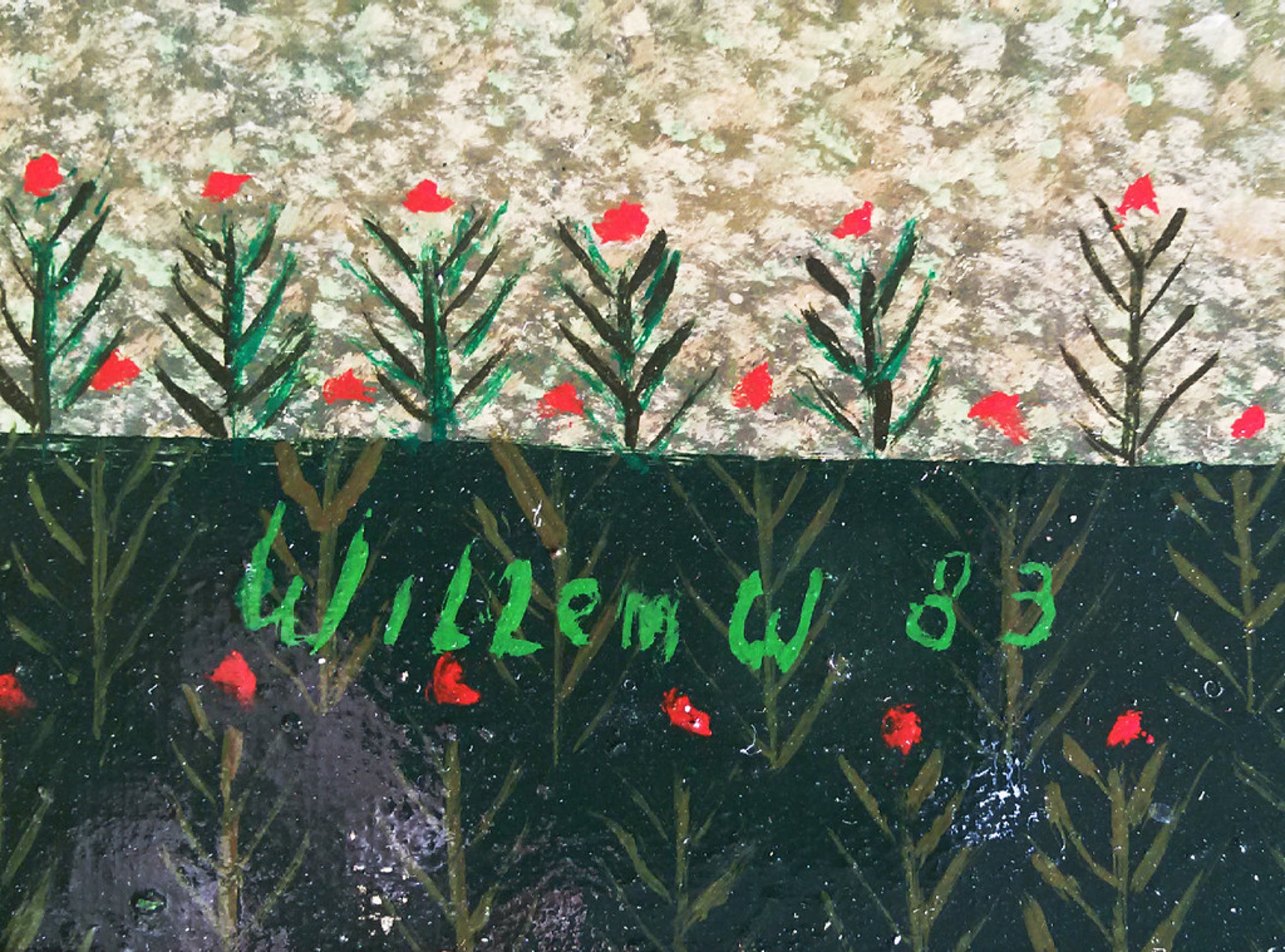Uiterst herkenbaar werk van de Rotterdamse kunstenaar Willem Westbroek. Olieverf op doek, linksonder gesigneerd en gedateerd (’83), in nette lijst. In uitstekende conditie. Het enige wat er op het werk is aan te merken is dat er een minuscuul stukje verf ontbreekt, net rechts van de ronde opening in het gebladerte van de middelste boom (orde van grootte: mm2); eenvoudig te restaureren.
