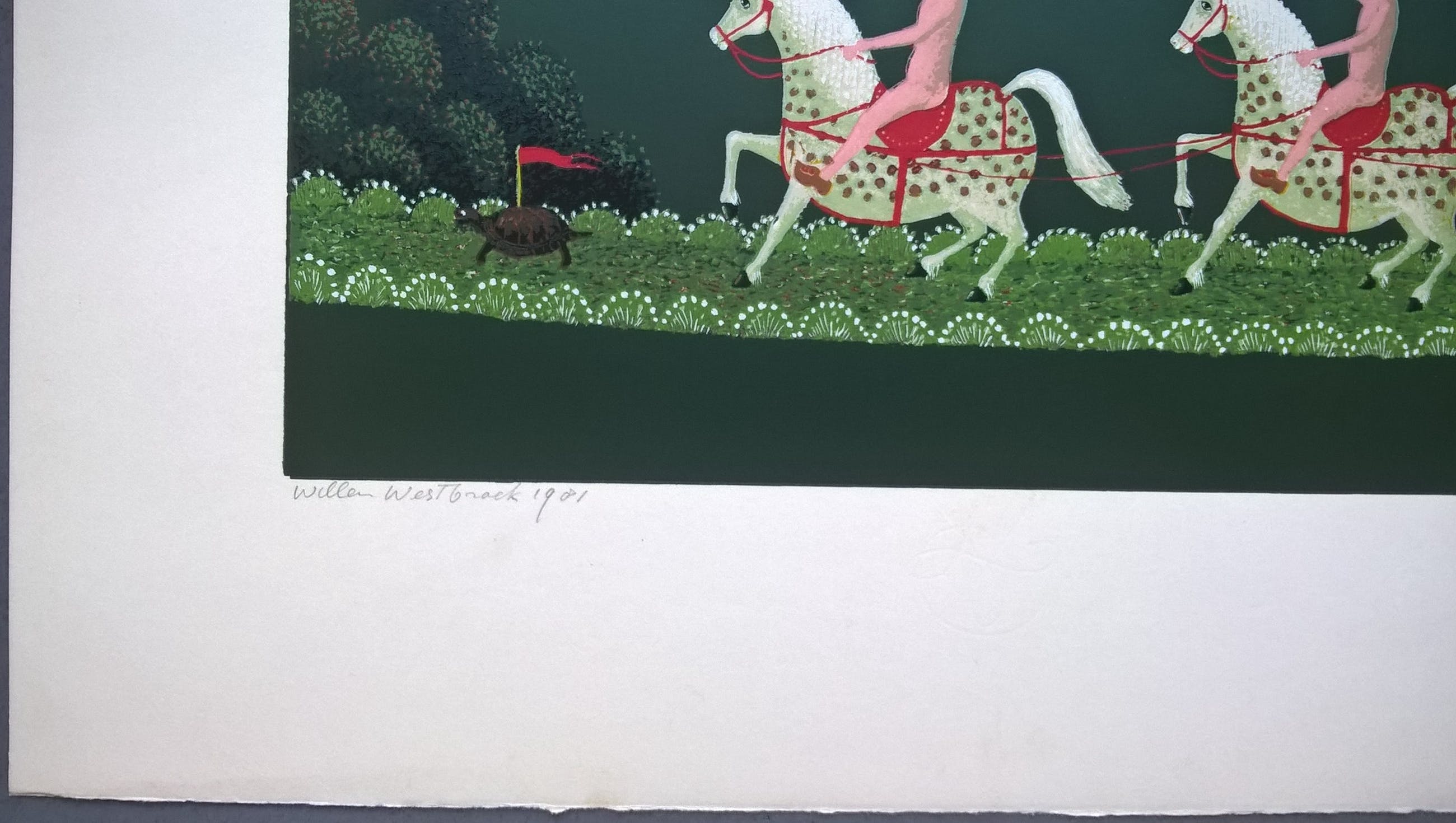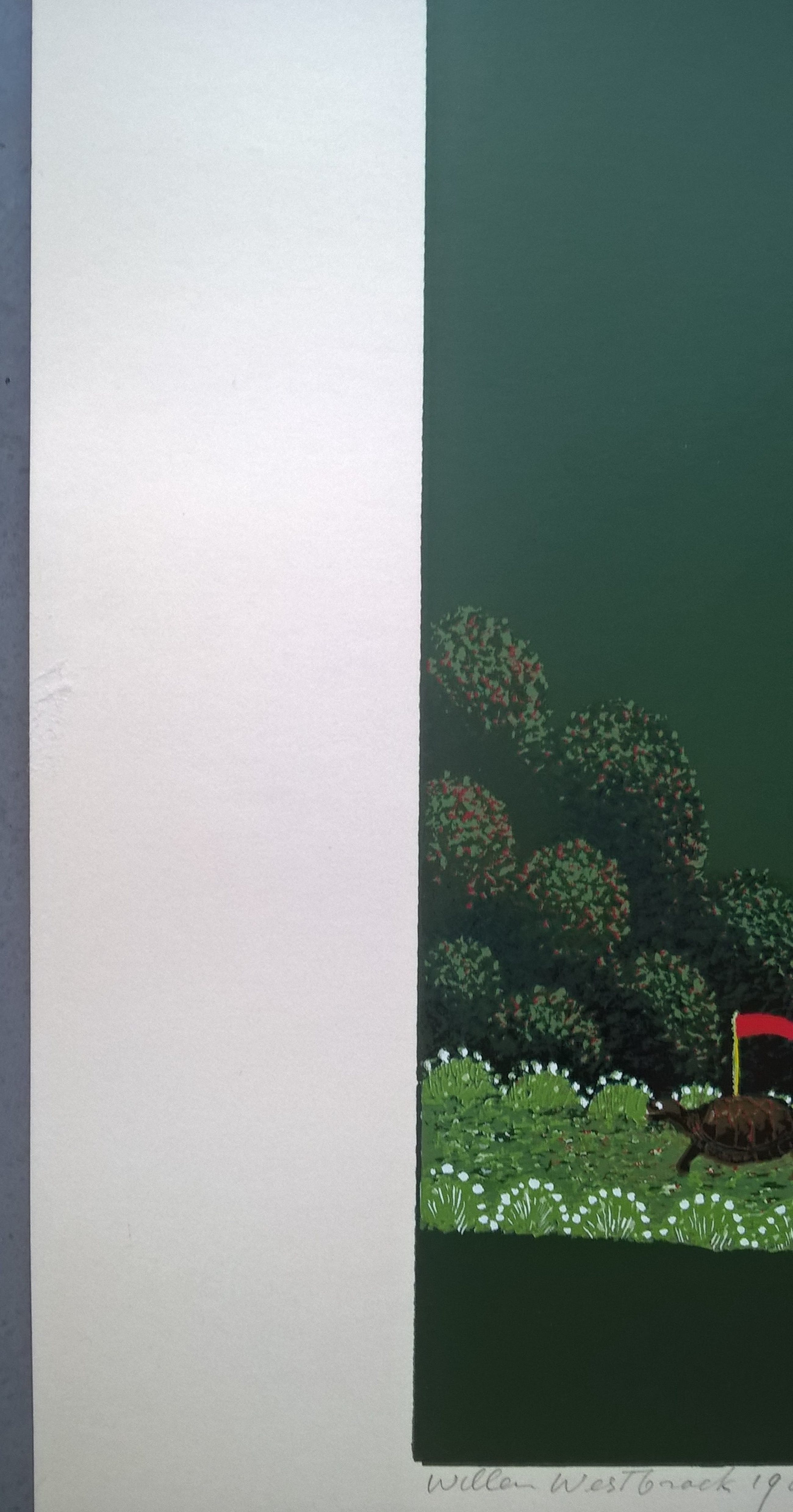 Zeefdruk van de kunstenaar Willem Westbroek. Linksonder is het werk gesigneerd in potlood met Willem Westbroek 1981. Werk is niet genummerd. Beeldmaat 50 x 60 cm. Papiermaat 63 x 72 cm. In beeld zitten een aantal oneffenheden in het papier.(nauwelijks zichtbaar) In de wit marge zit hier en daar een vlekje en links aan de rand is het papier licht beschadigd. Verder goed.