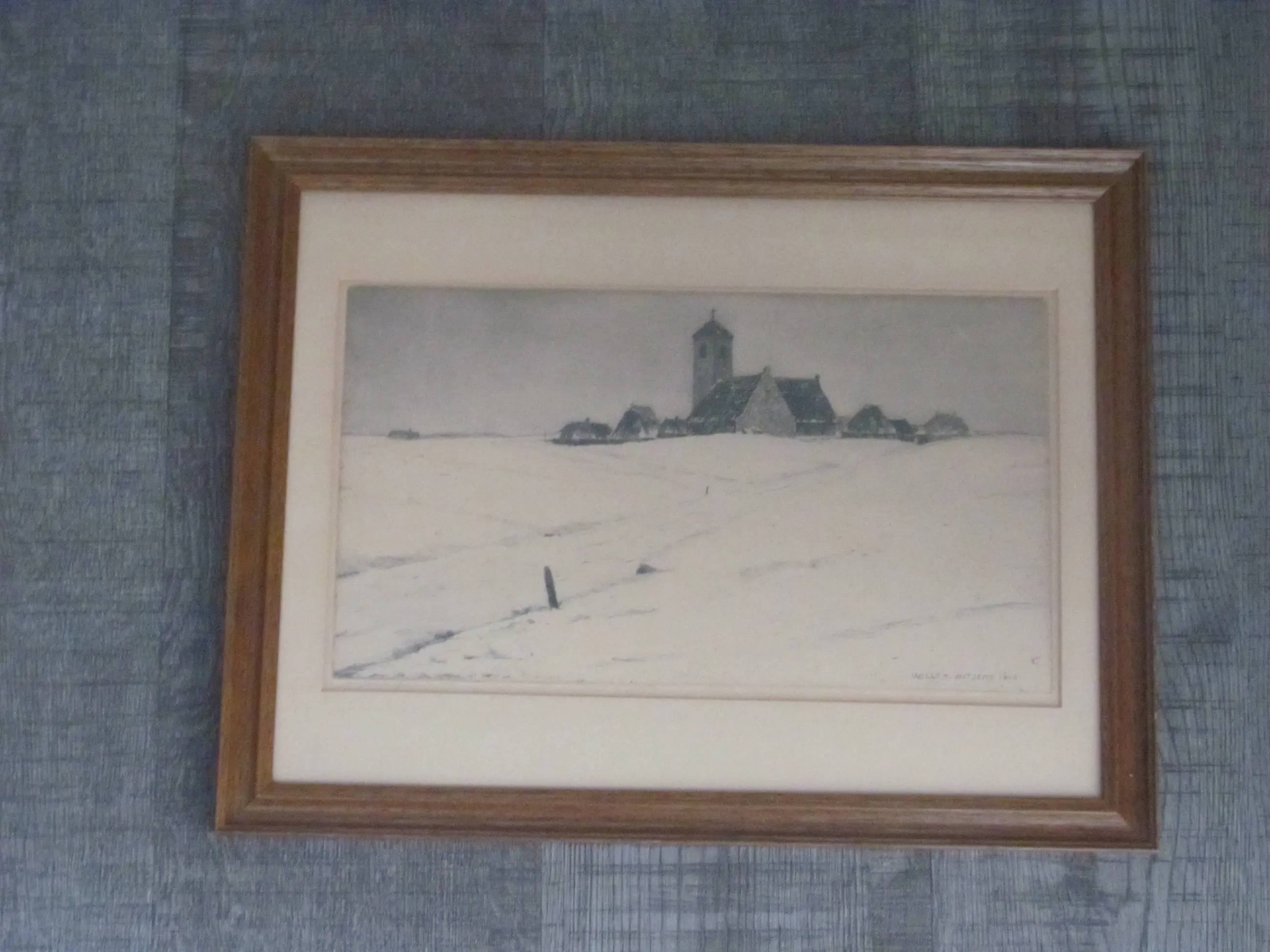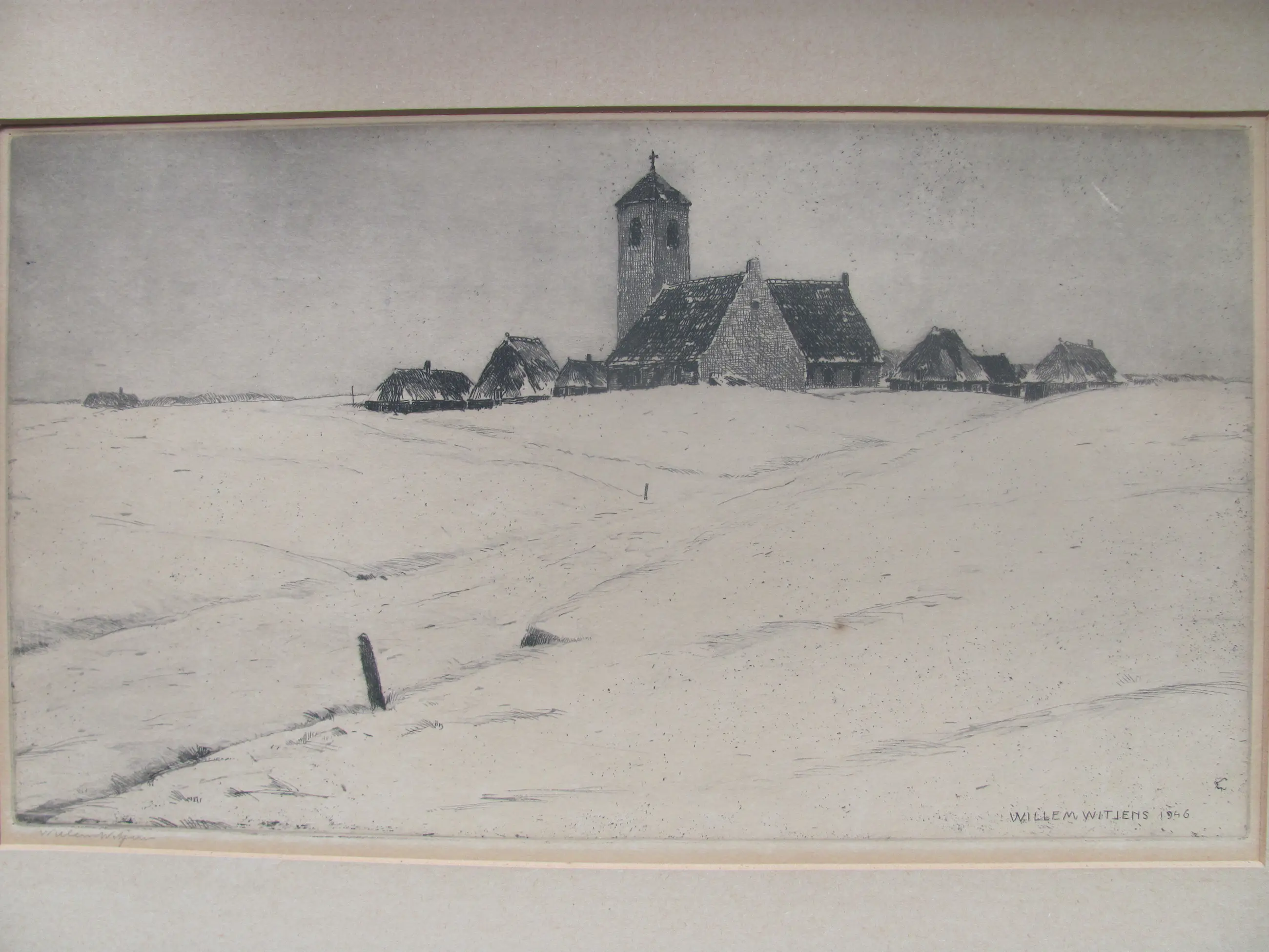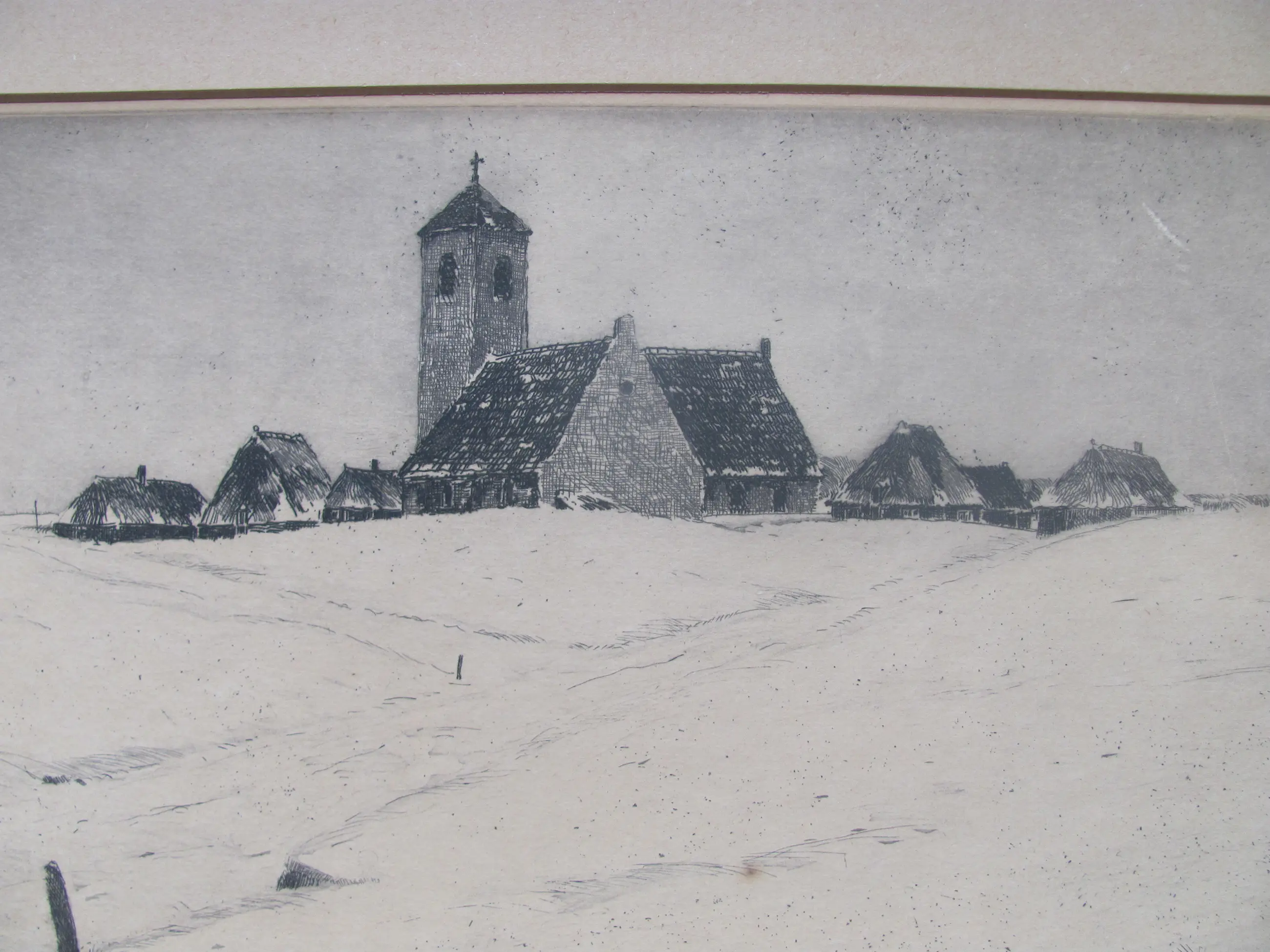 Ets van Willem Witjens van een dorp in de sneeuw.