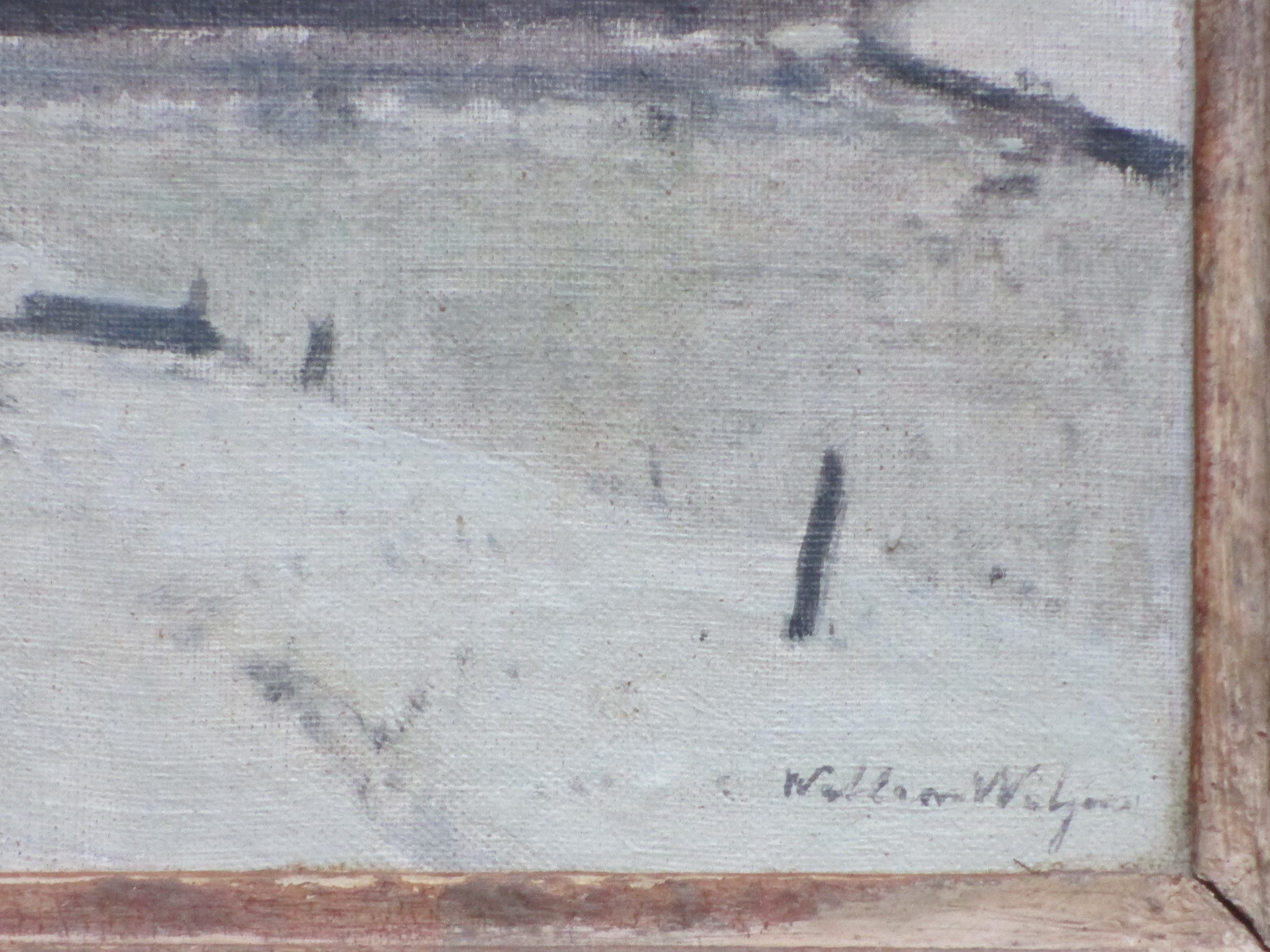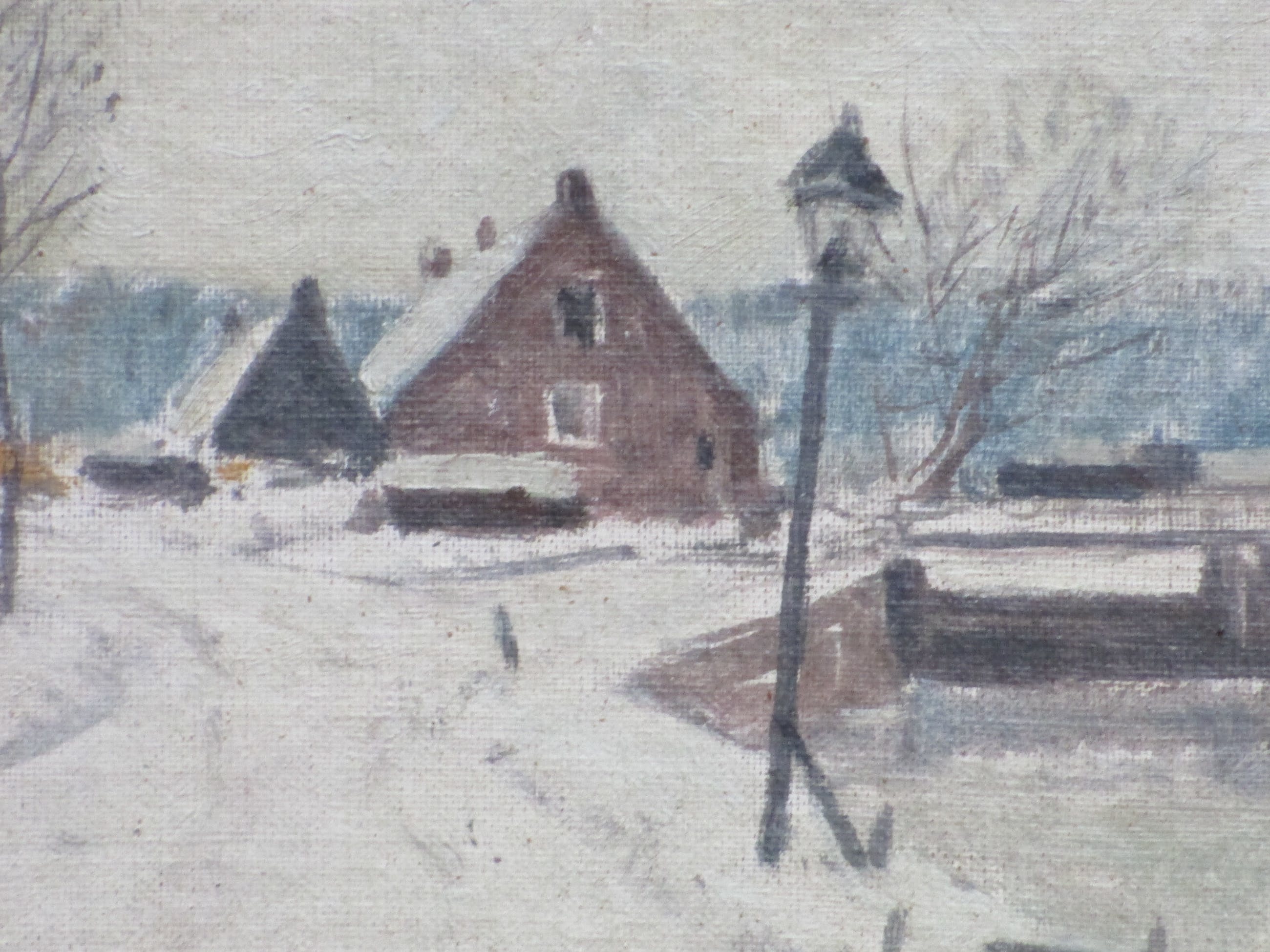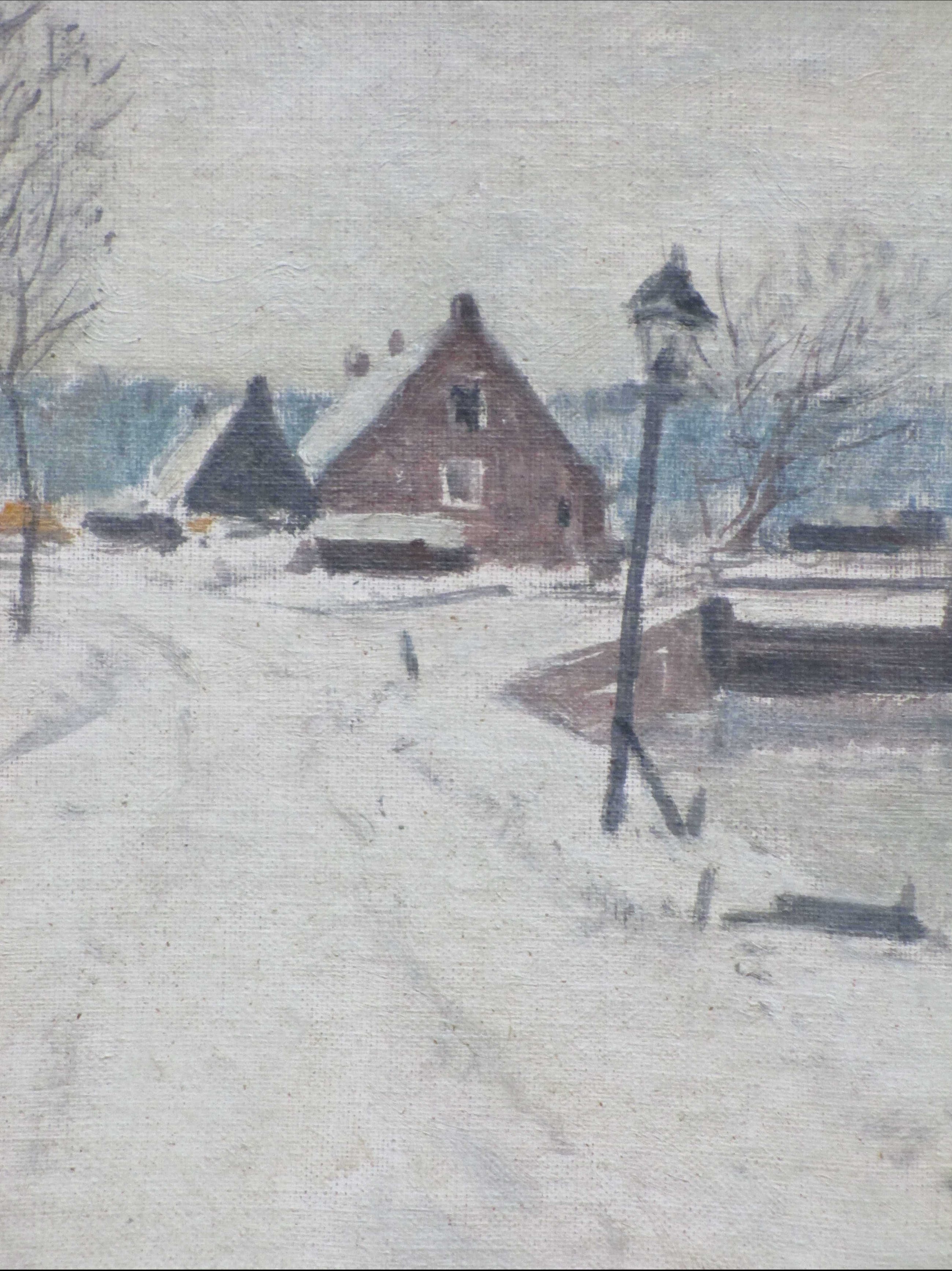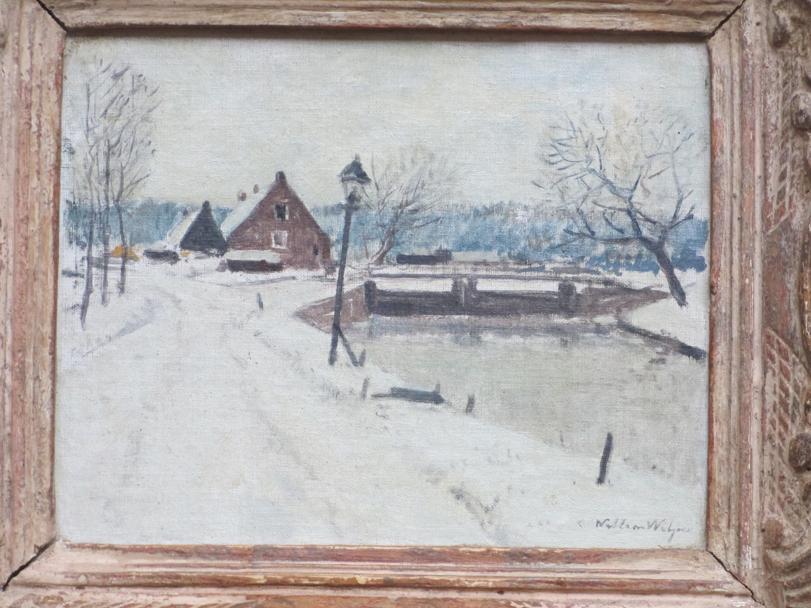 Olieverf op doek op paneel door Willem Witjens. Voorstelling van een wintergezicht bij een sluis met boerderij en lantaarnpaal. Met name door deze wintertaferelen is Witjens bekend geworden. Van dit onderwerp bestaat eveneens een ets van zijn hand. Gelijst, beeldmaat 24x31, lijstmaat 34x40 Gesigneerd rechtsonder: 'Willem Witjens' Tevens gesigneerd en annotatie op achterzijde: 'Willem Witjens, Het Oude Huis, Berne' Eveneens mogelijke titel: 'Oost.....? (slecht leesbaar) Authenticiteit volledig gegarandeerd