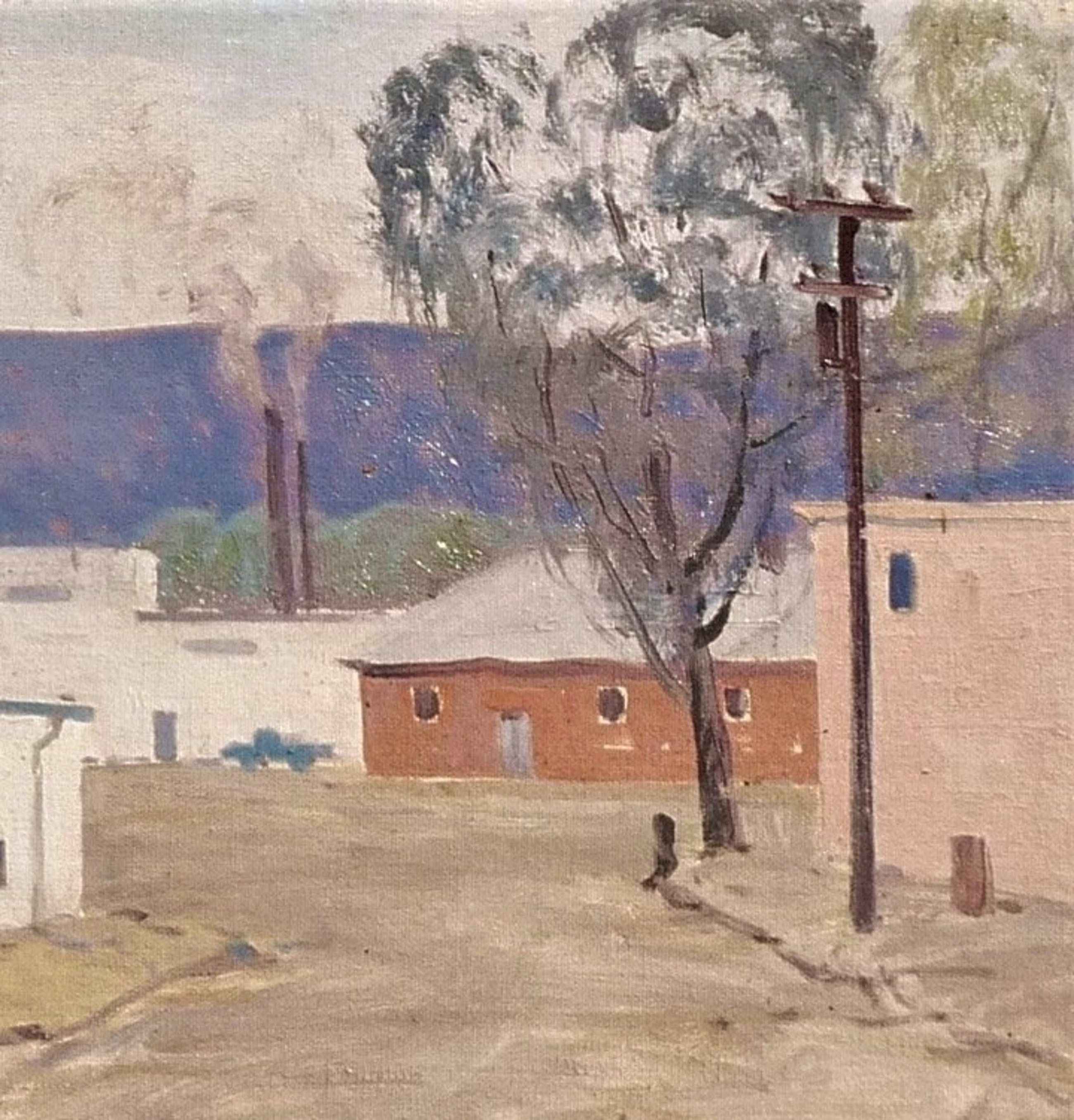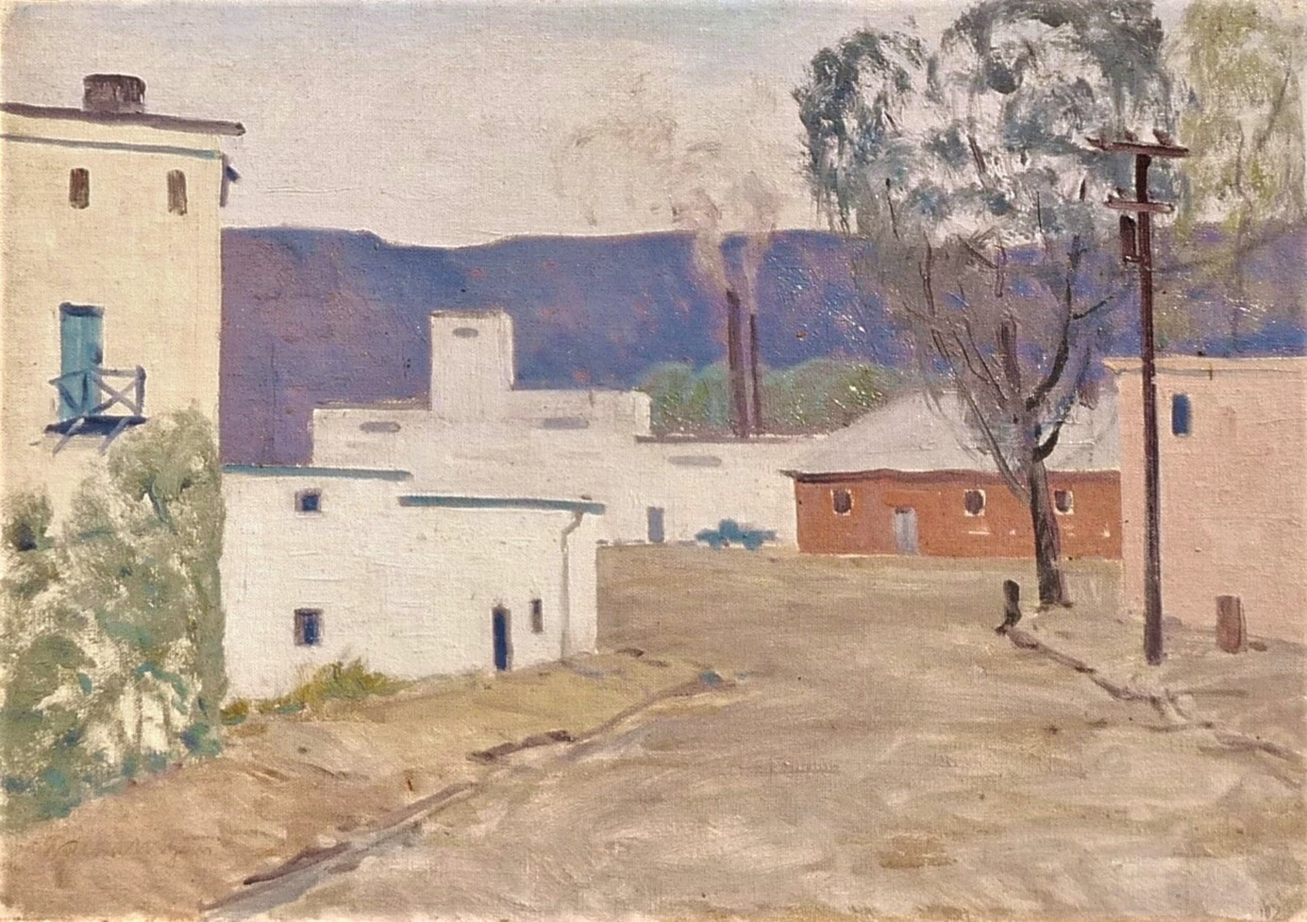 *Leuk werk van fabrieken in een bergachtig landschap in lichte tinten door de Nederlandse kunstenaar Willem Witjens. Betreft een maroufle (olieverf op doek op board verlijmd).