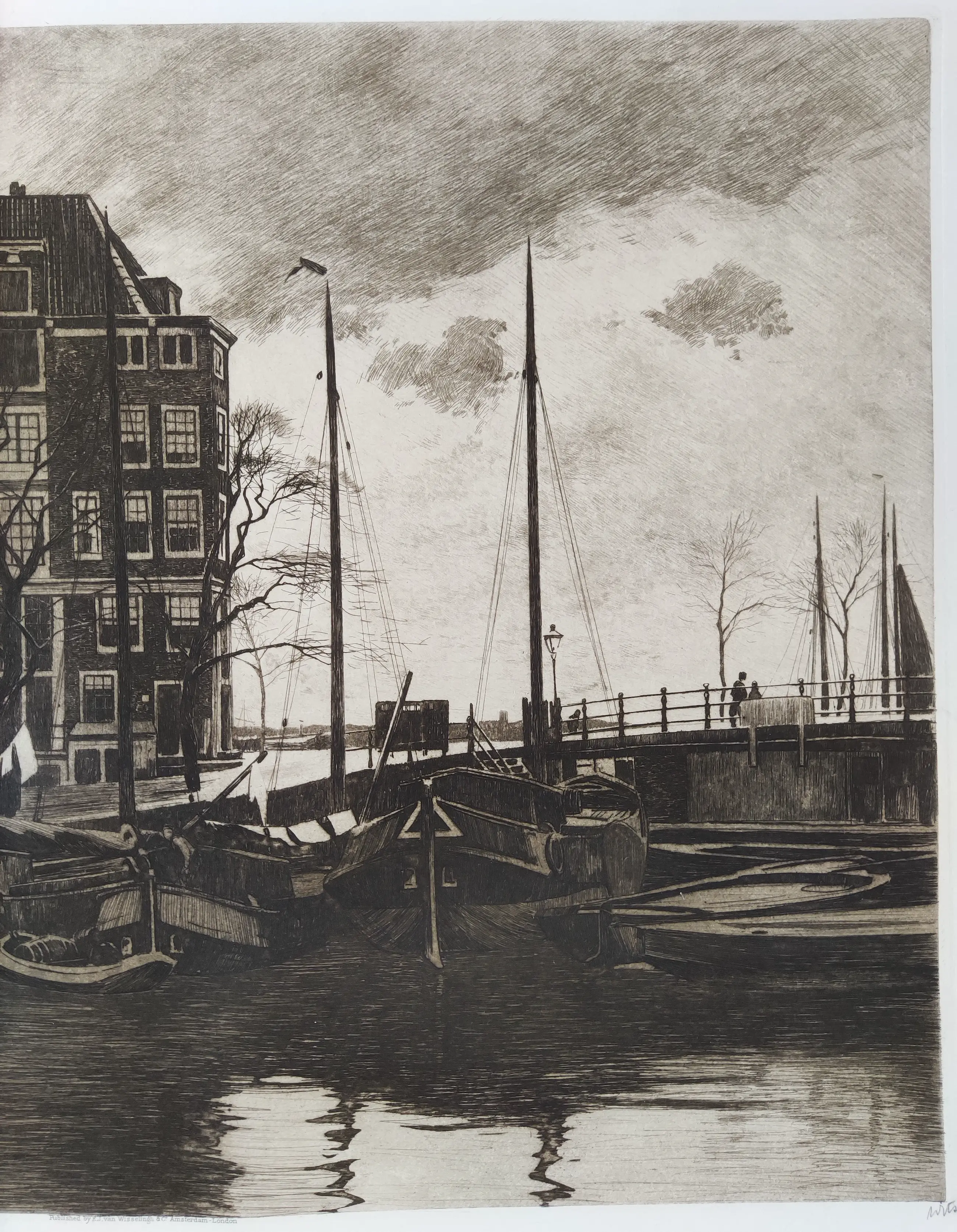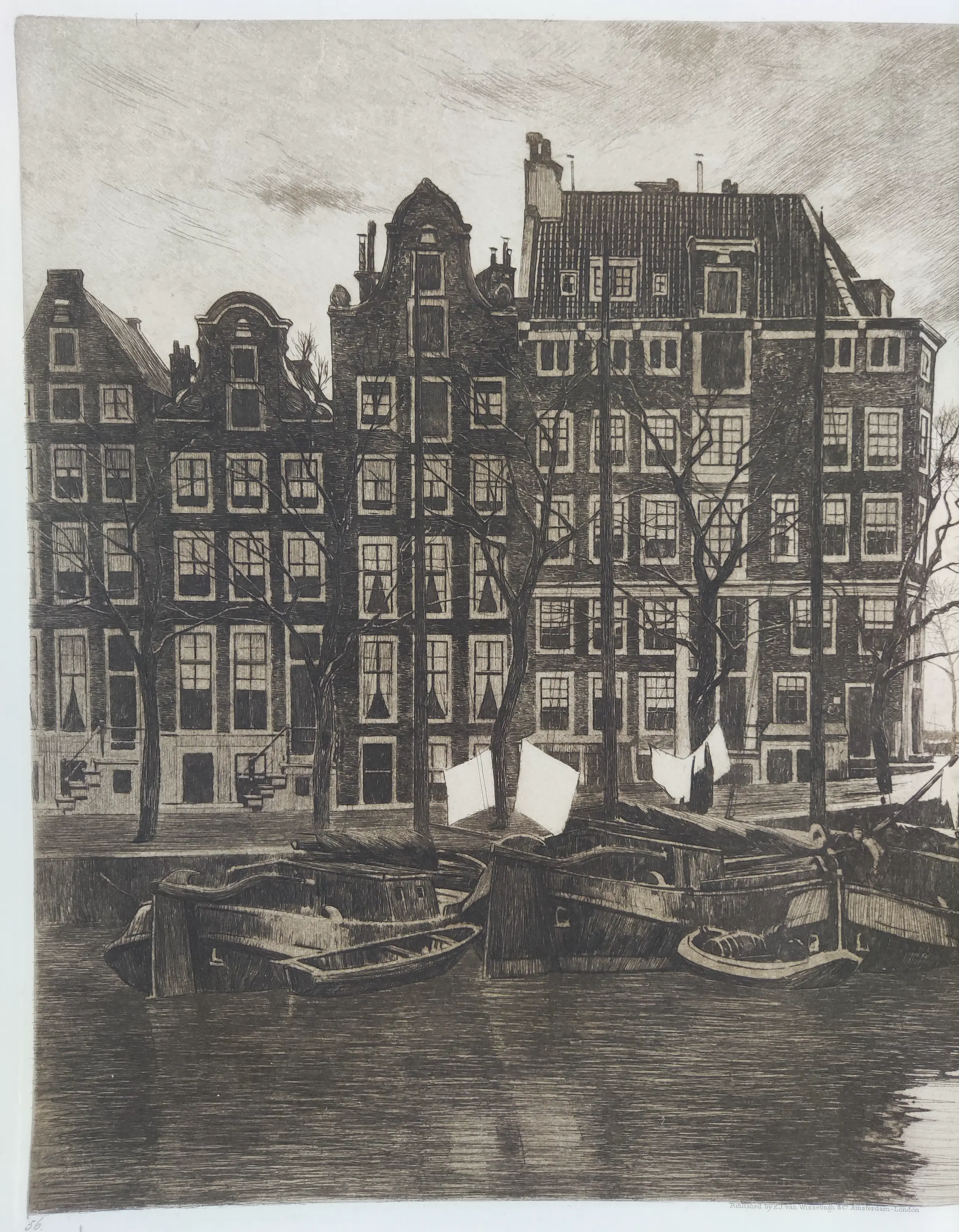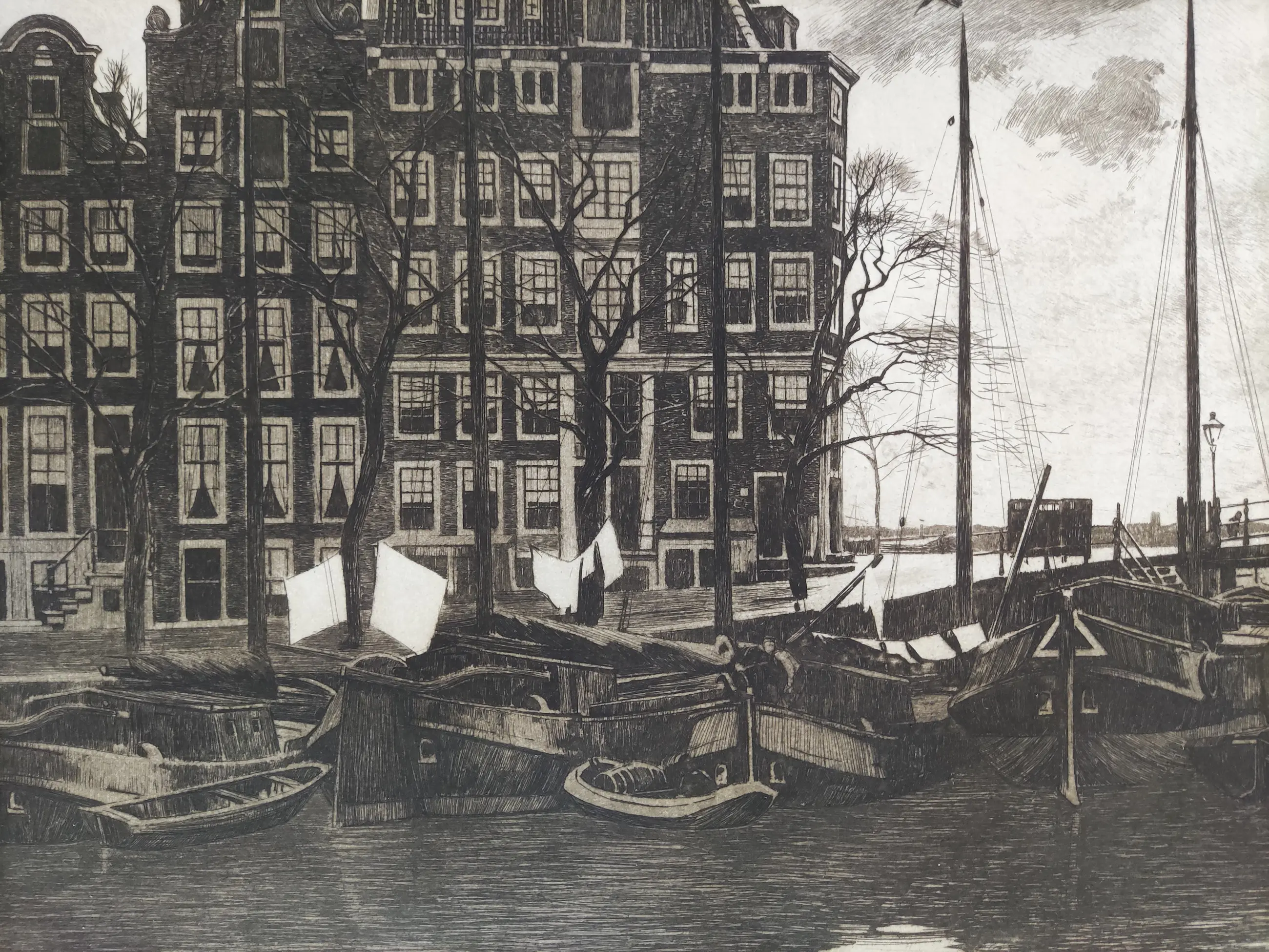 Prachtige ets met de voorstelling "Binnenkant, met wapperende was op de schepen".