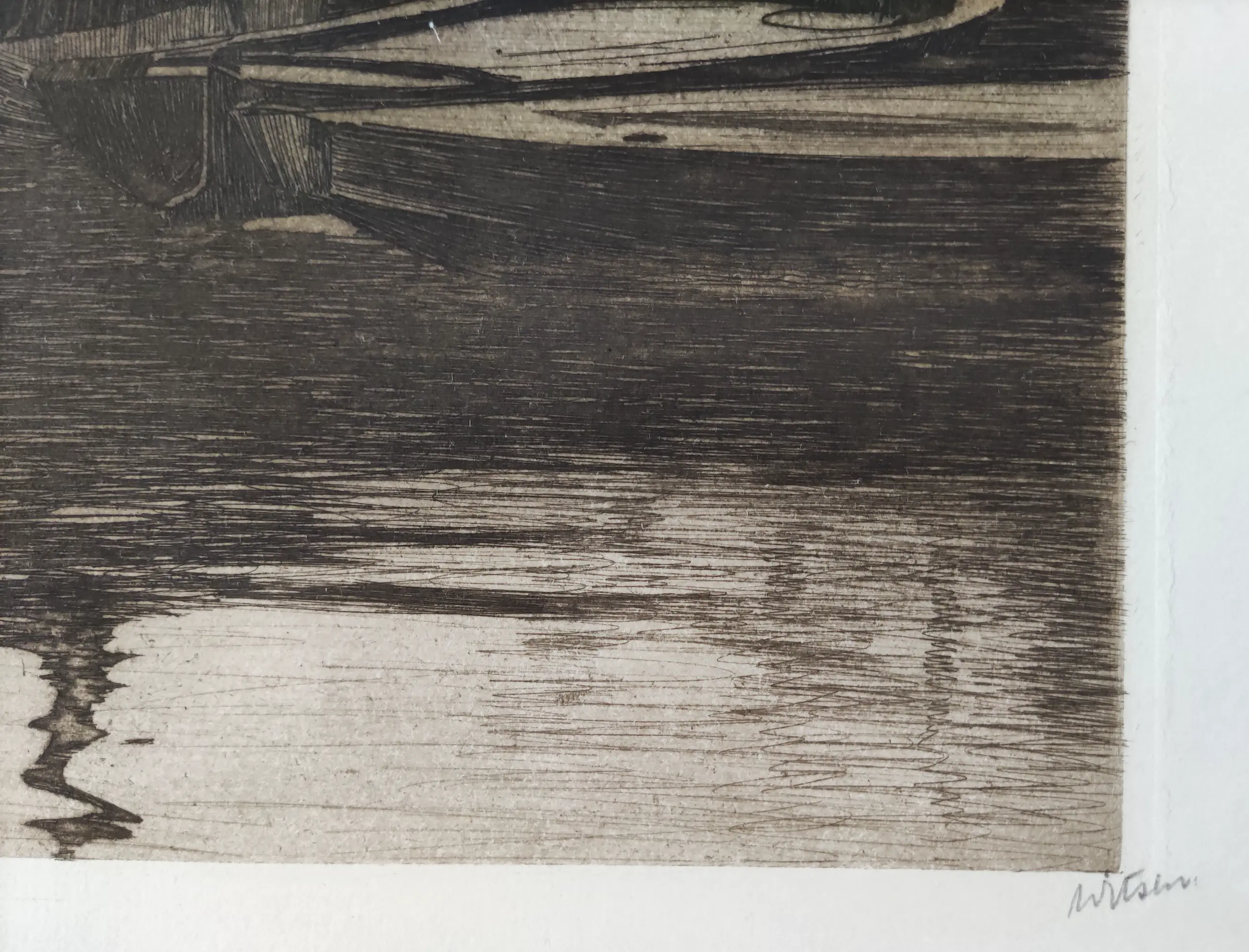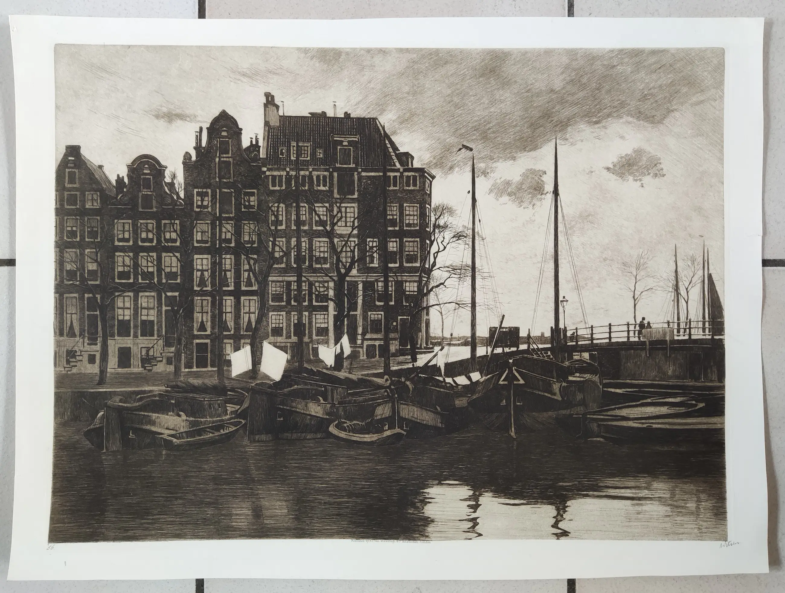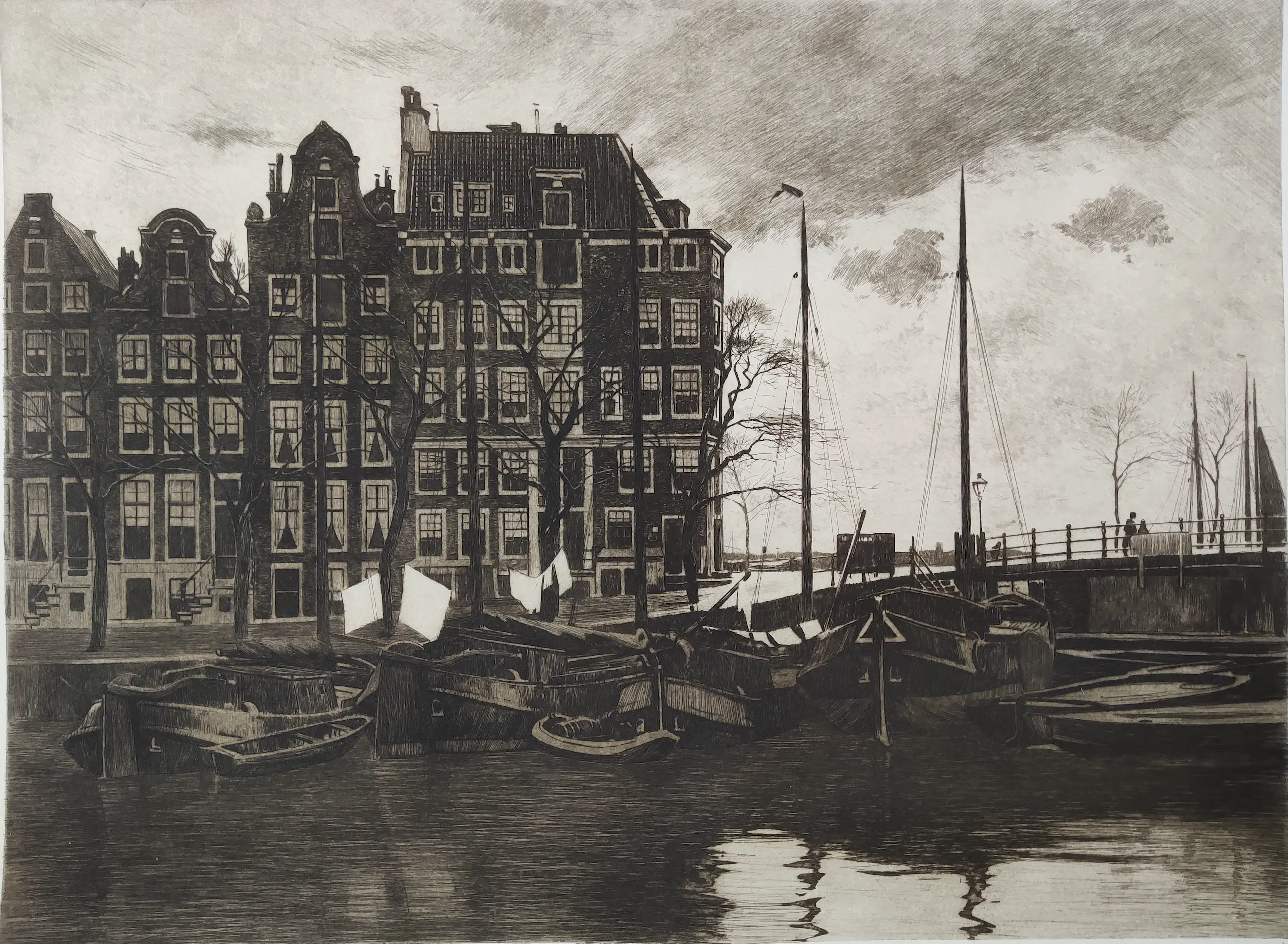 Prachtige ets met de voorstelling "Binnenkant, met wapperende was op de schepen".
