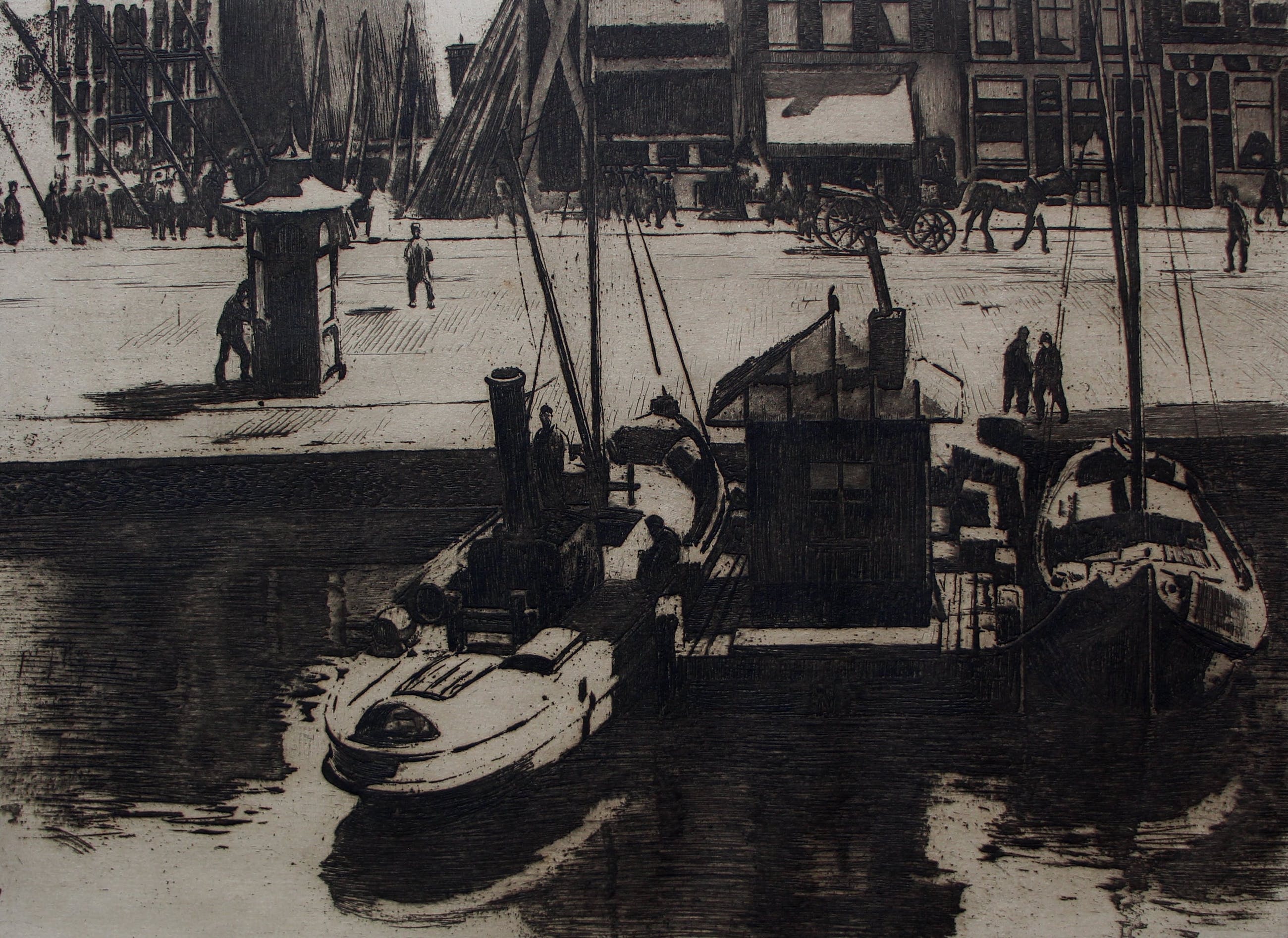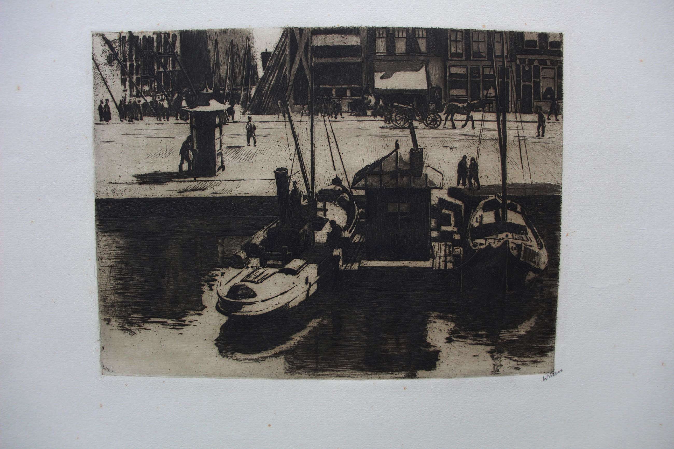 Ets van Willem Witsen. Titel: Damrak met gezicht op een steiger en een bouwput. Afmetingen blad incl passepartout: H52.5 x b68.5cm. Afmetingen voorstelling: H24 x B32cm.
