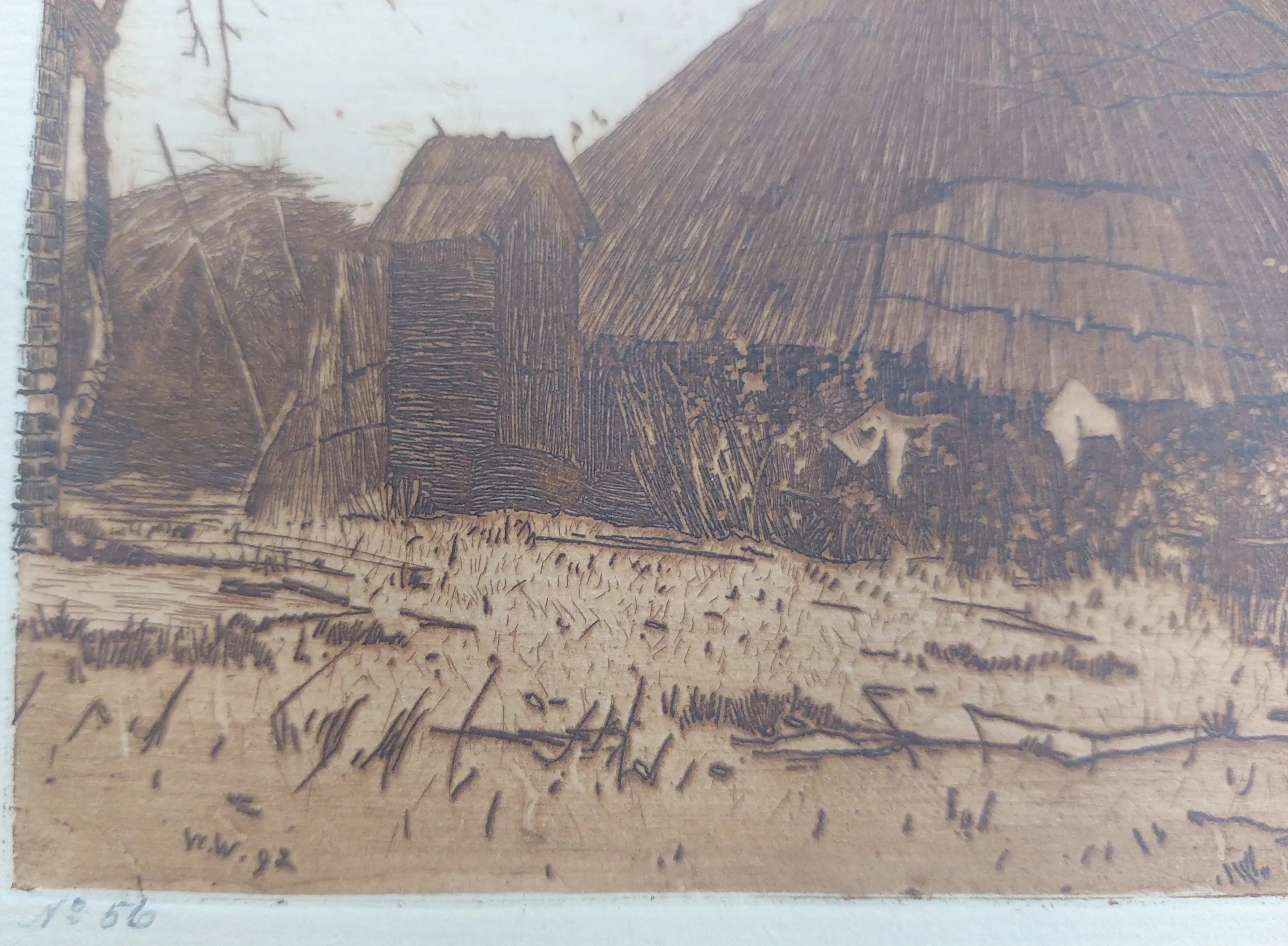Mooie ets en aquatint van Willem Witsen waarop een boerderij in Brabant is afgebeeld. Handgesigneerd rechtsonder in potlood en genummerd linksonder no. 56. In de plaat staat W. W. 92, wat correspondeerde met een soortgelijke ets in de collectie van het Rijksmuseum.