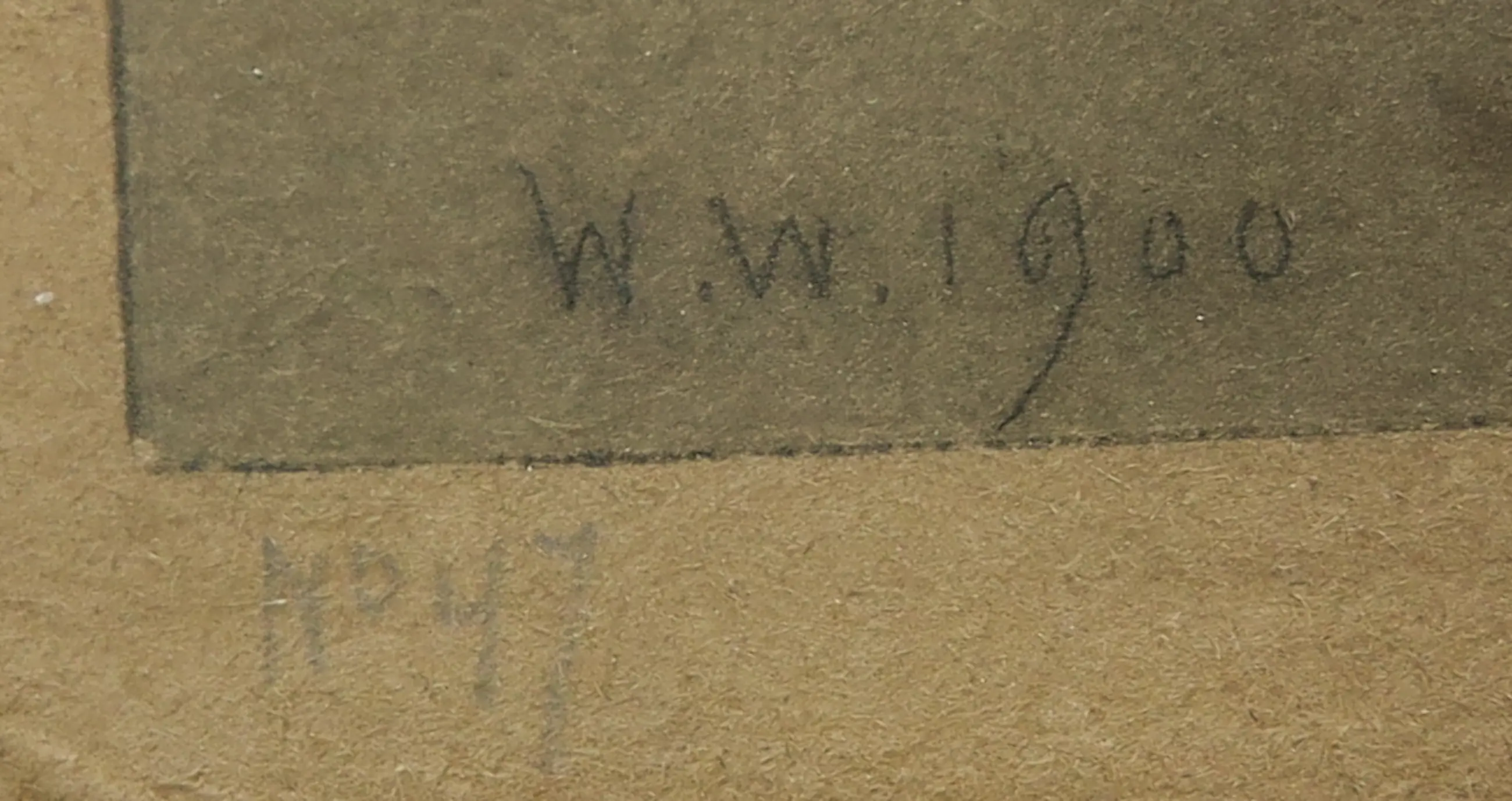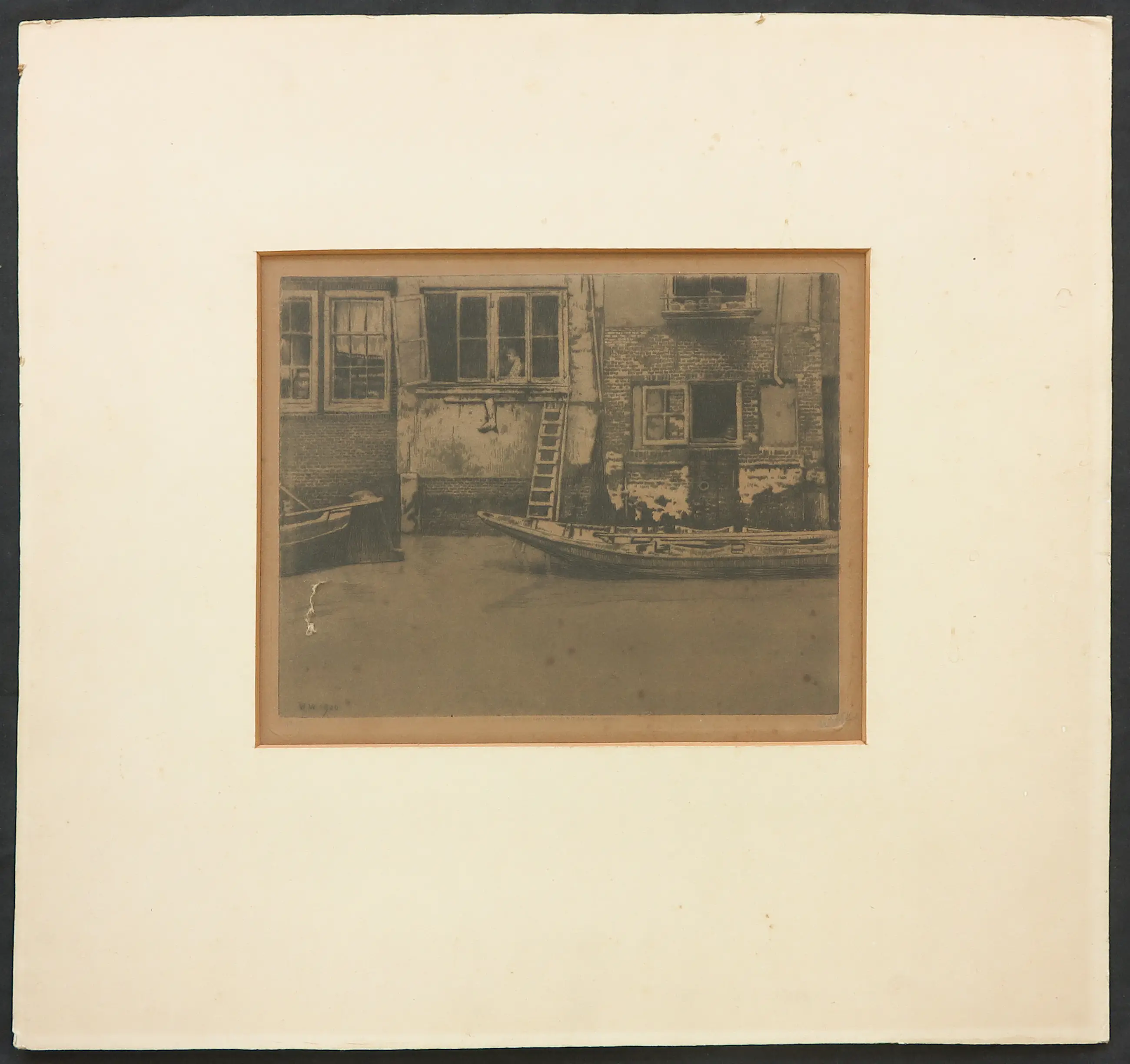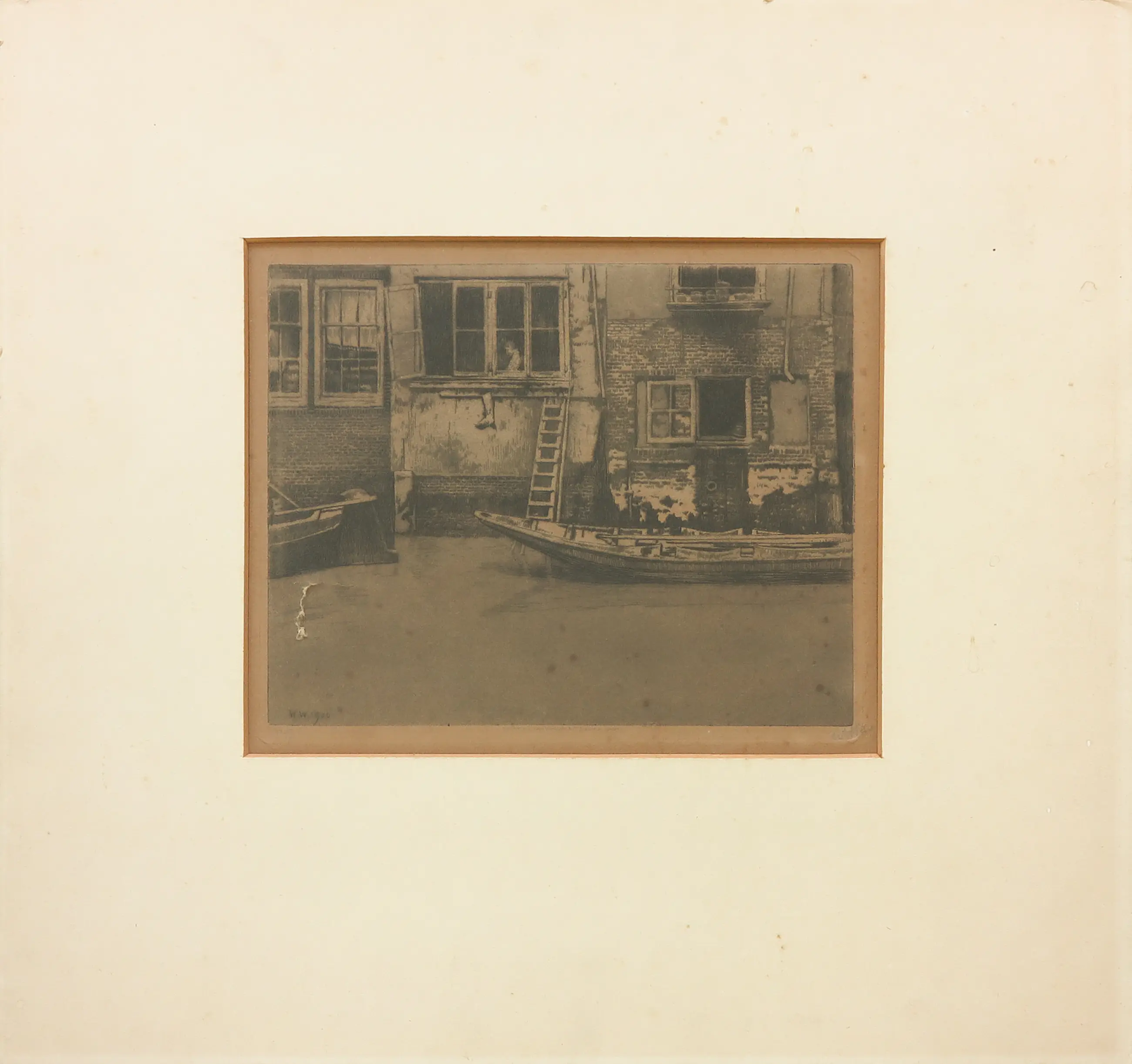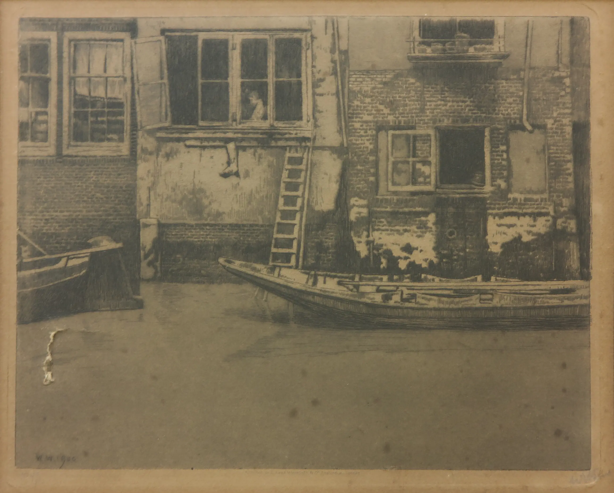 Het betreft een ets van kunstenaar Willem Witsen, handgesigneerd in de rechter benedenhoek. Eveneens voorzien van intitalen in de etsplaat. In 1898 vertrok Witsen naar Dordrecht, waar hij enige perioden verbleef. Daar had hij beschikking tot zijn eigen roeiboot, waarmee hij door de Wijnhaven en de Voorstraatshaven voer.Daar maakte Witsen een reeks schetsen met kleurnotities die hij gebruikte als basis voor een serie van twaalf prenten en voor diverse aquarellen en schilderijen. Ze zijn vrijwel allemaal te situeren langs de Voorstraatshaven. Deze prent bevindt zich in het Rijksprentenkabinet: RP-P-OB-25.646