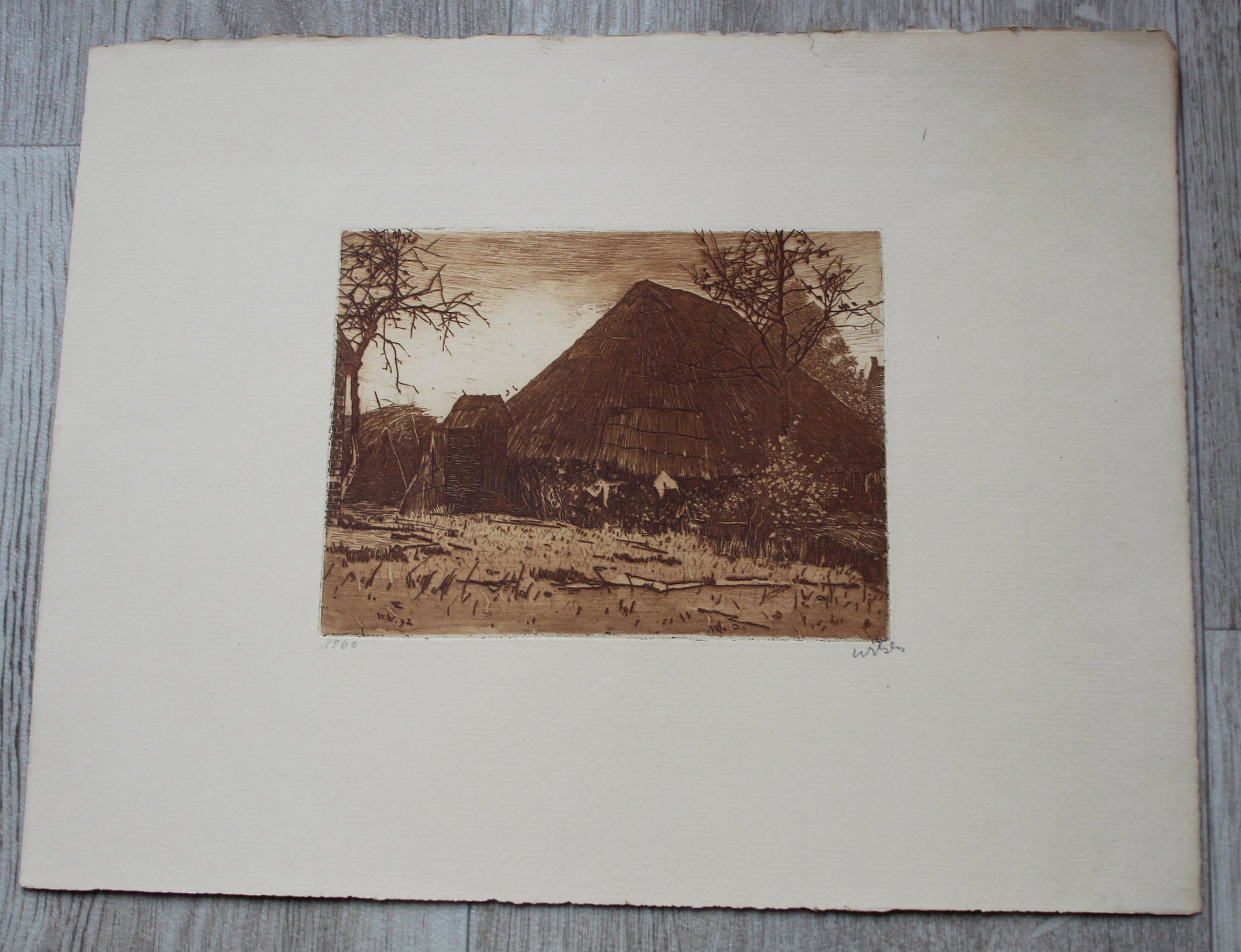 Ets/aquatint van Willem Witsen. Titel: Achterkant van een schuur/Avond Brabant. Jaar: 1892. Afmetingen blad: H25 x b32.5 cm. Afmetingen voorstelling: H12 x b16 cm. Het werk is rechtsonder, met potlood, gesigneerd door de kunstenaar. De authenticiteit van het aangeboden werk wordt voor 100% gegarandeerd. Een certificaat van echtheid kan, op aanvraag, worden meegestuurd. Het werk is in goede staat.