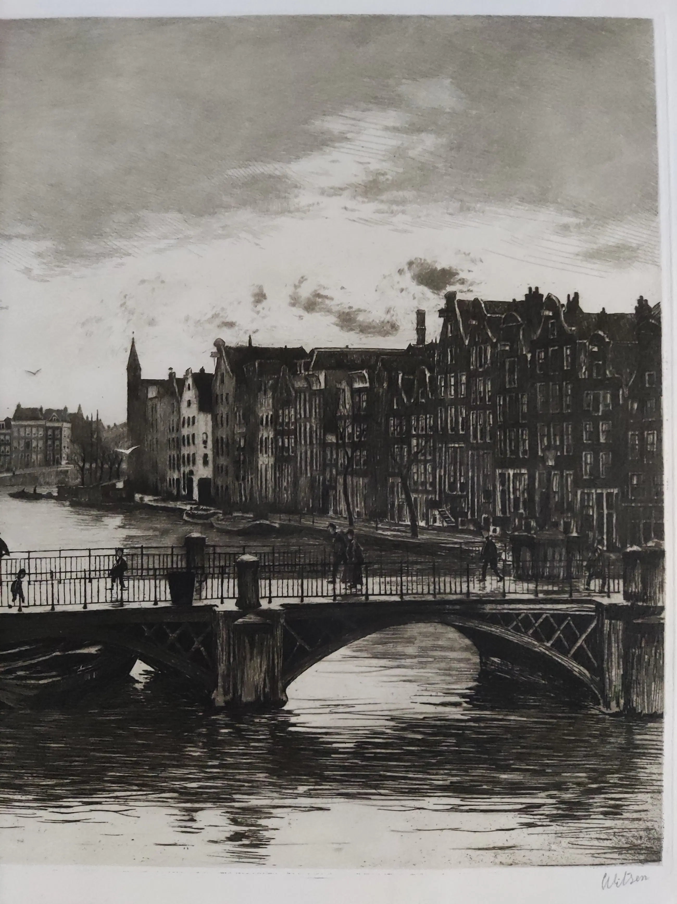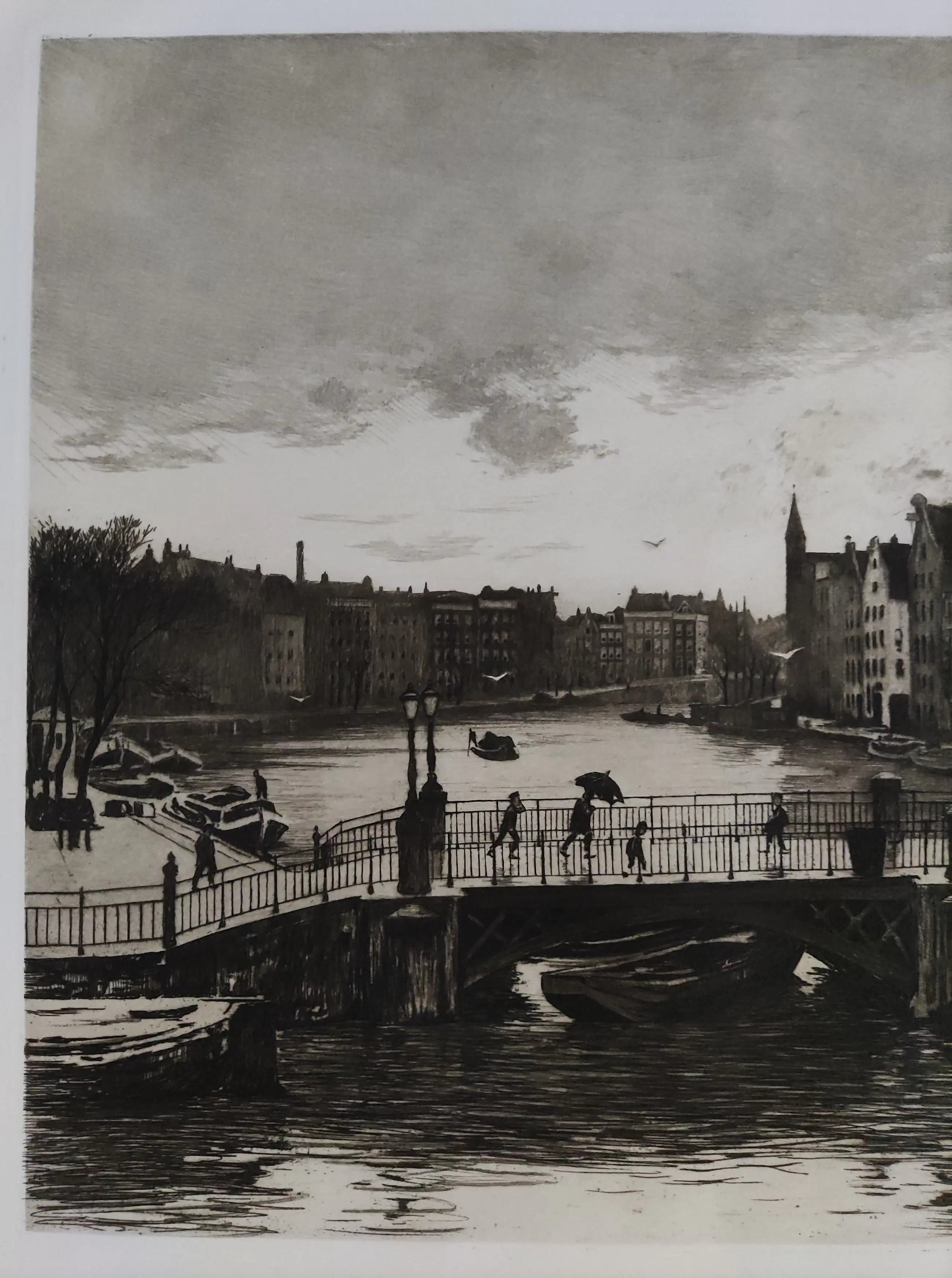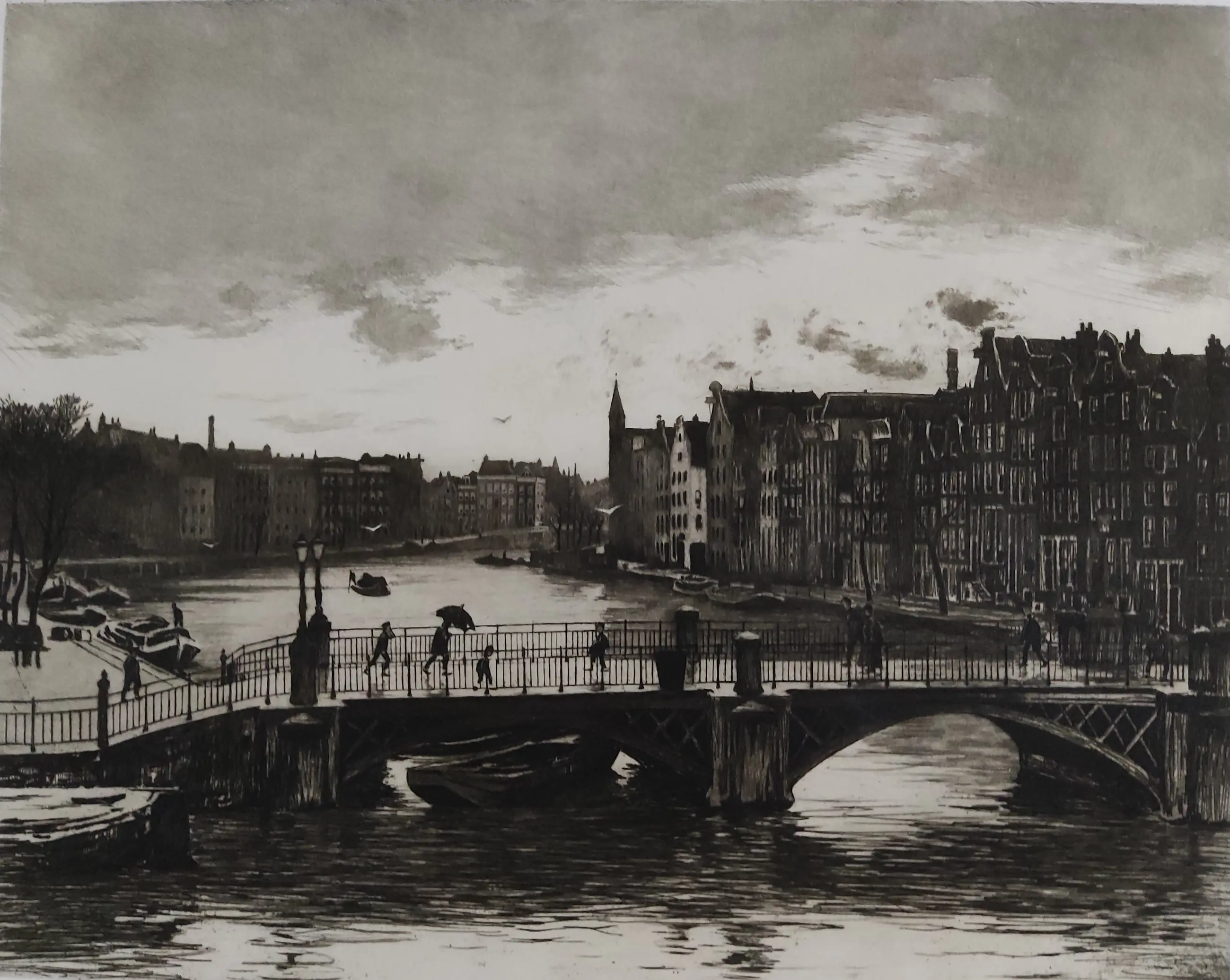 Mooie zeldzame Amsterdamse ets en aquatint voorstellende een gezicht op de Binnen-Amstel en de Halvemaansteegbrug vanuit de zalen aan de achterkant van het veilinghuis Frederik Muller aan de Doelenstraat. Rechts de huizen aan de Erwtenmarkt, op de achtergrond het Waterlooplein.
