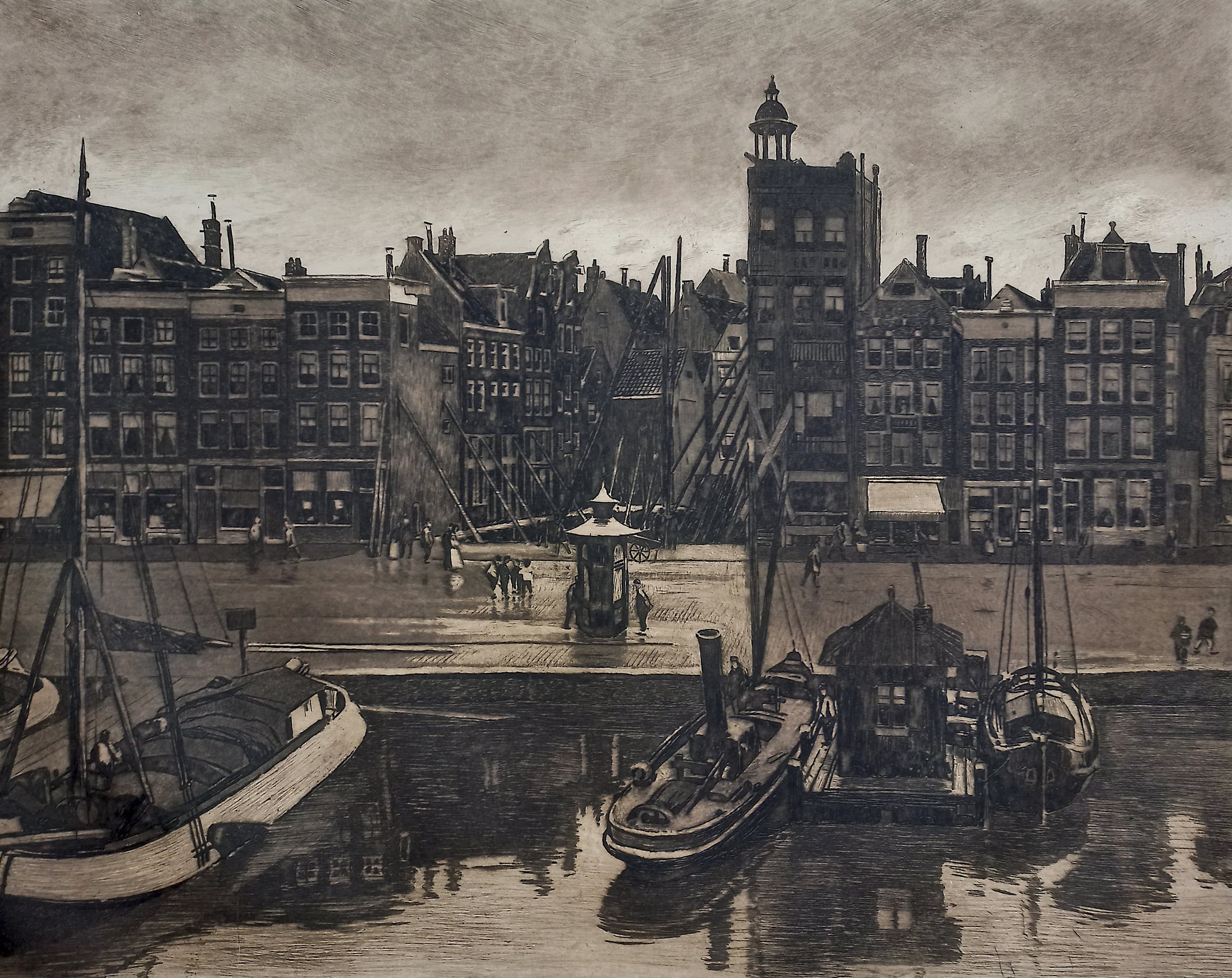 Grote, karakteristieke ets van Willem Witsen uit 1905/1906. Gezicht op het Damrak, met twee steigers en een bouwput. Aquatint ets op Van Gelder & Zonen papier, met potlood gesigneerd rechtsonder en genummerd linksonder (“No 93”). In zeer goede conditie, voor een werk dat meer dan een eeuw oud is kan de ets zelfs als uitstekend omschreven worden. Literatuur: De Groot 118 (VI), Boon 112, Van Wisselingh 444.