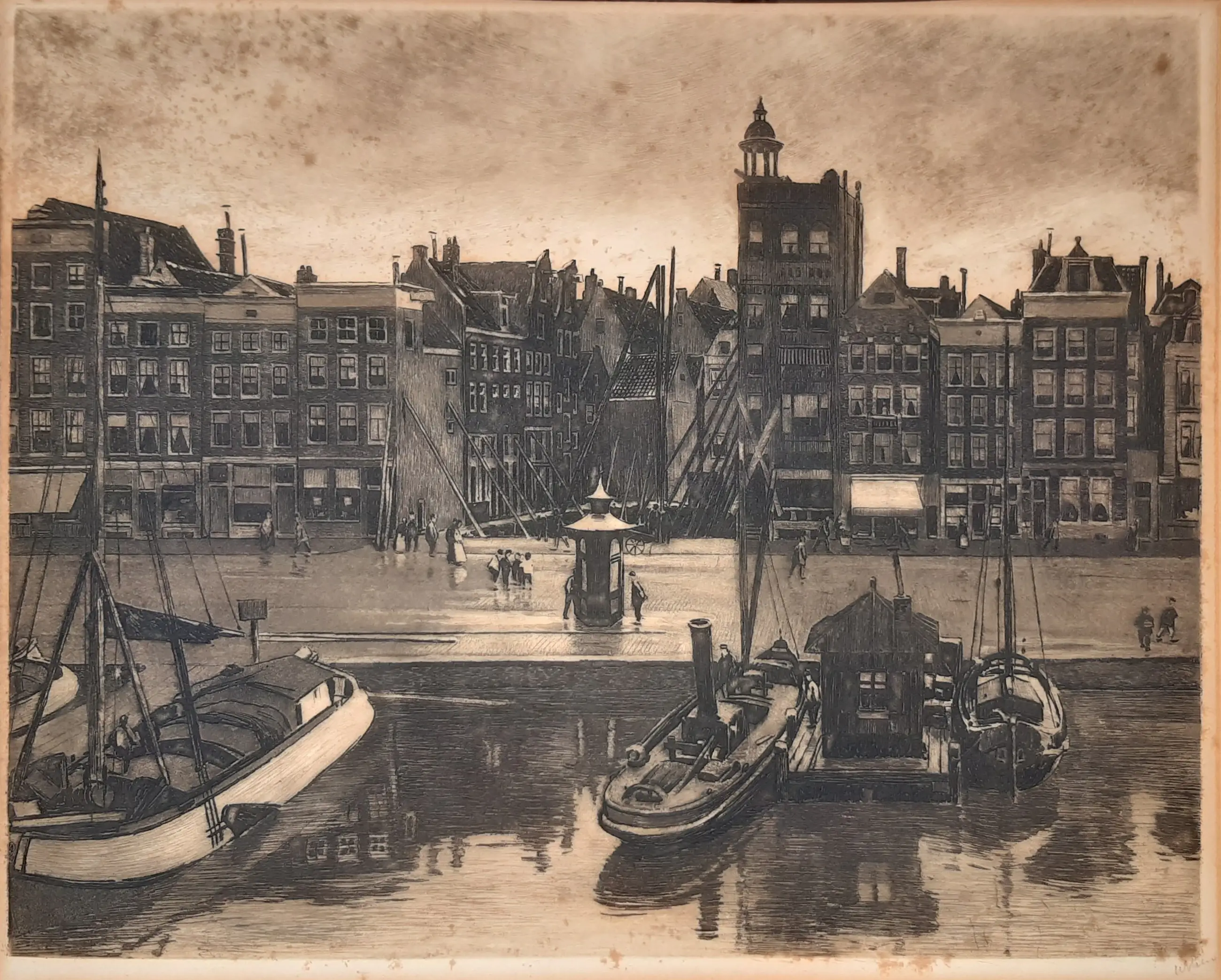 Grote ets van Willem Witsen - Gezicht op het Damrak Ets is verwijderd uit de lijst. Ets kan in bijbehorende lijst geleverd worden. Deze lijst heeft wel enkele beschadigingen (zie foto's 3, 7 en 8).