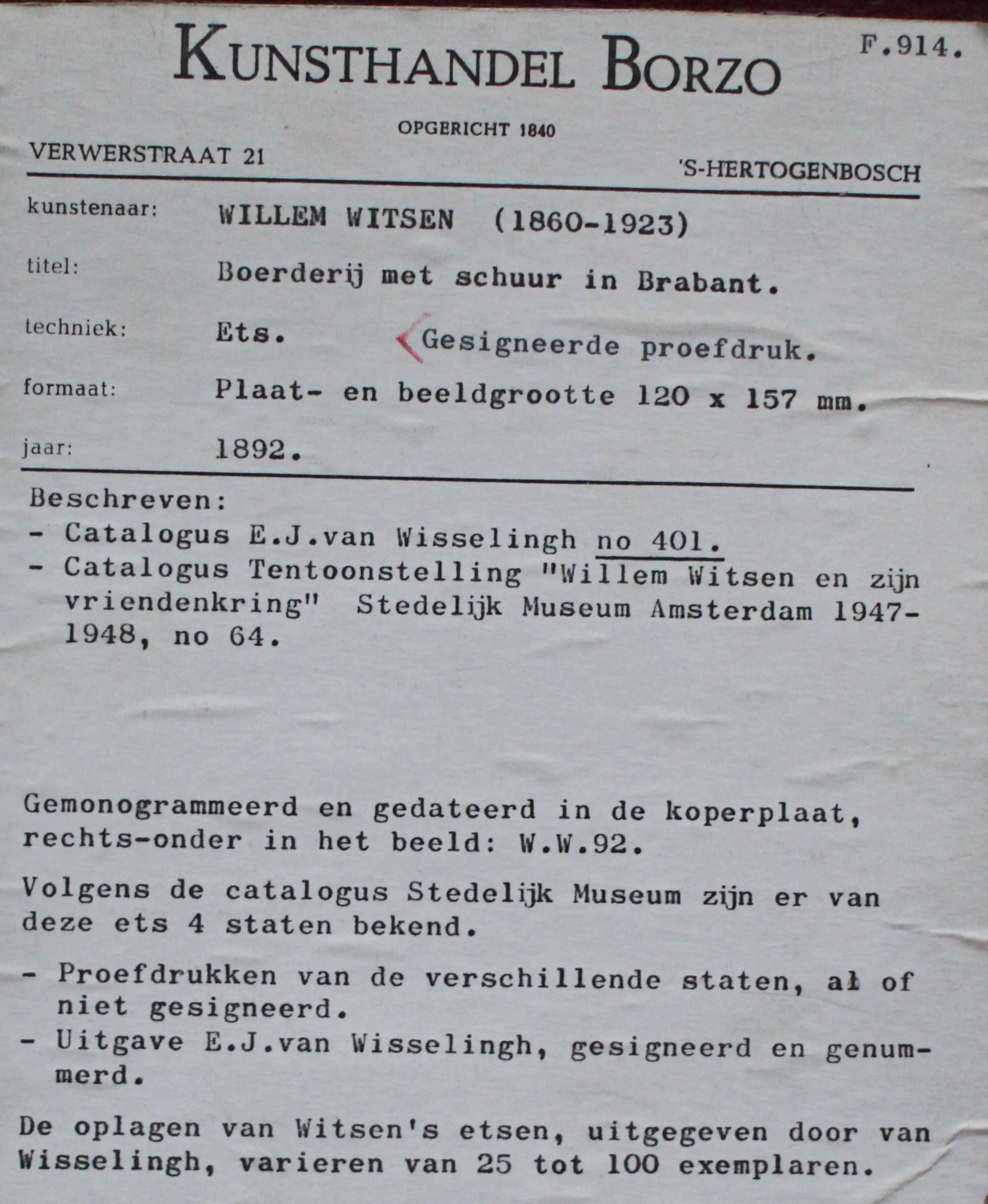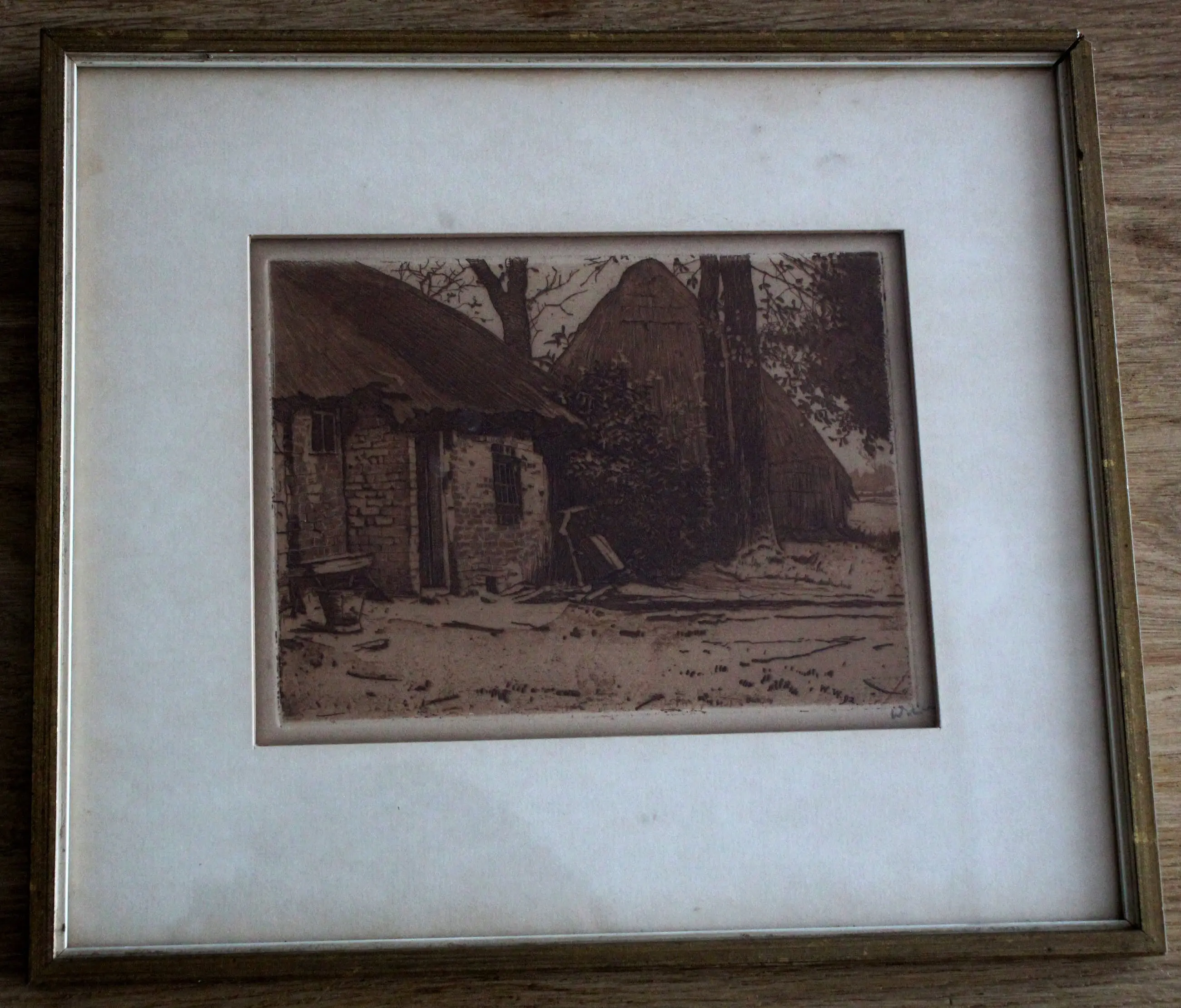 Ets van Willem Witsen uit 1892. Titel: Boerderij met schuur in Brabant. Literatuur: nummer 401, Willem Witsen, schilderijen, tekeningen, prenten, foto's. 1860/1923. Afmetingen incl lijst: H24 x b27.5cm. Afmetingen voorstelling: H12 x B16cm.