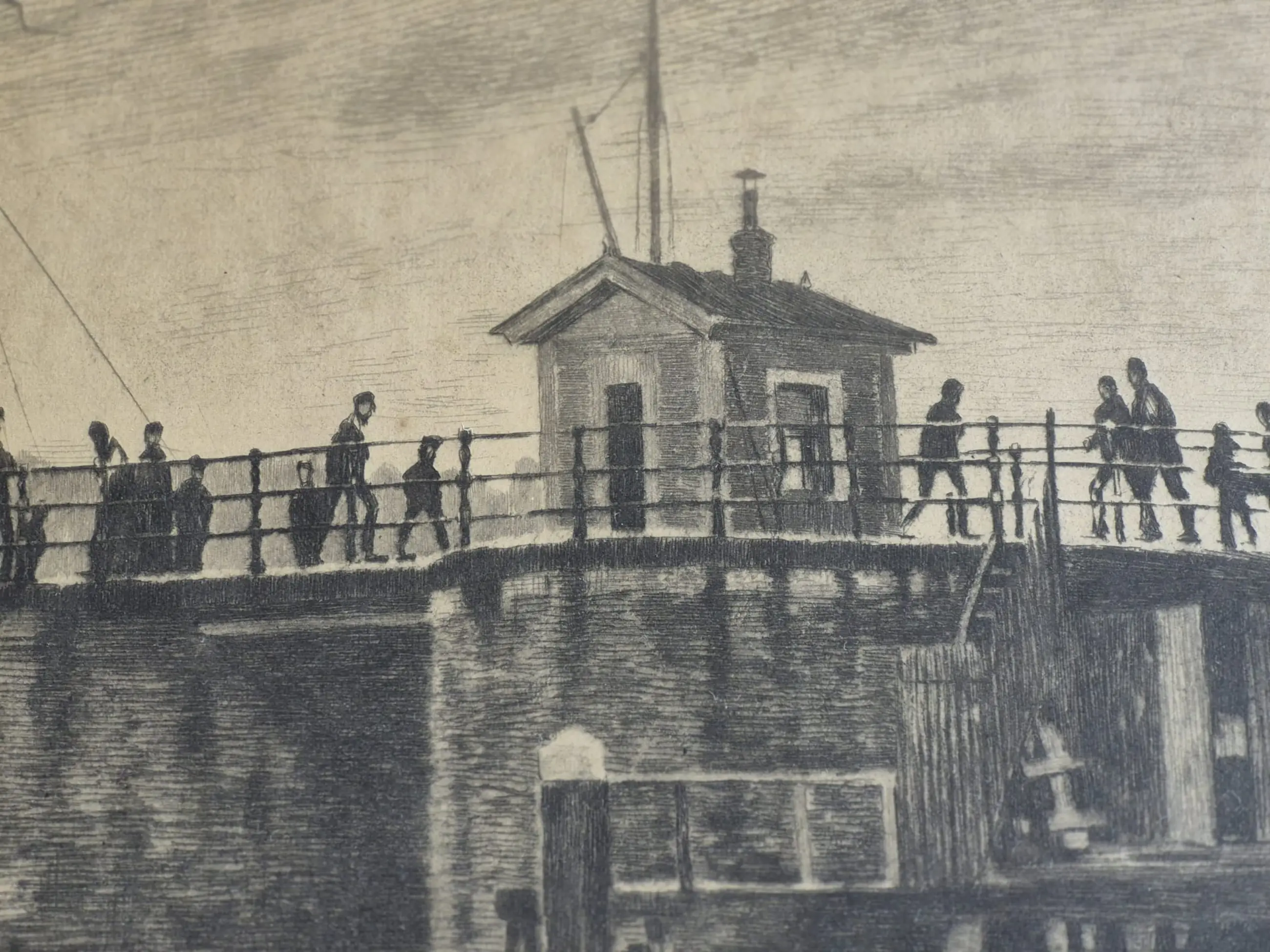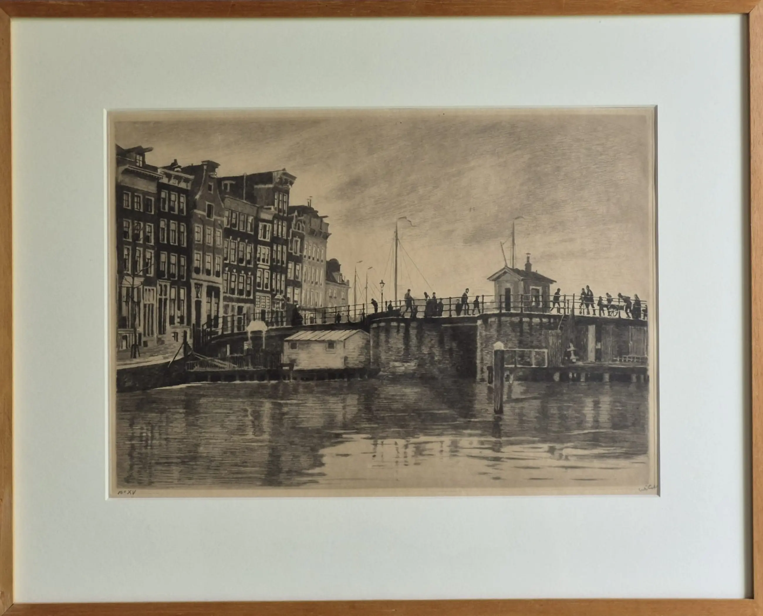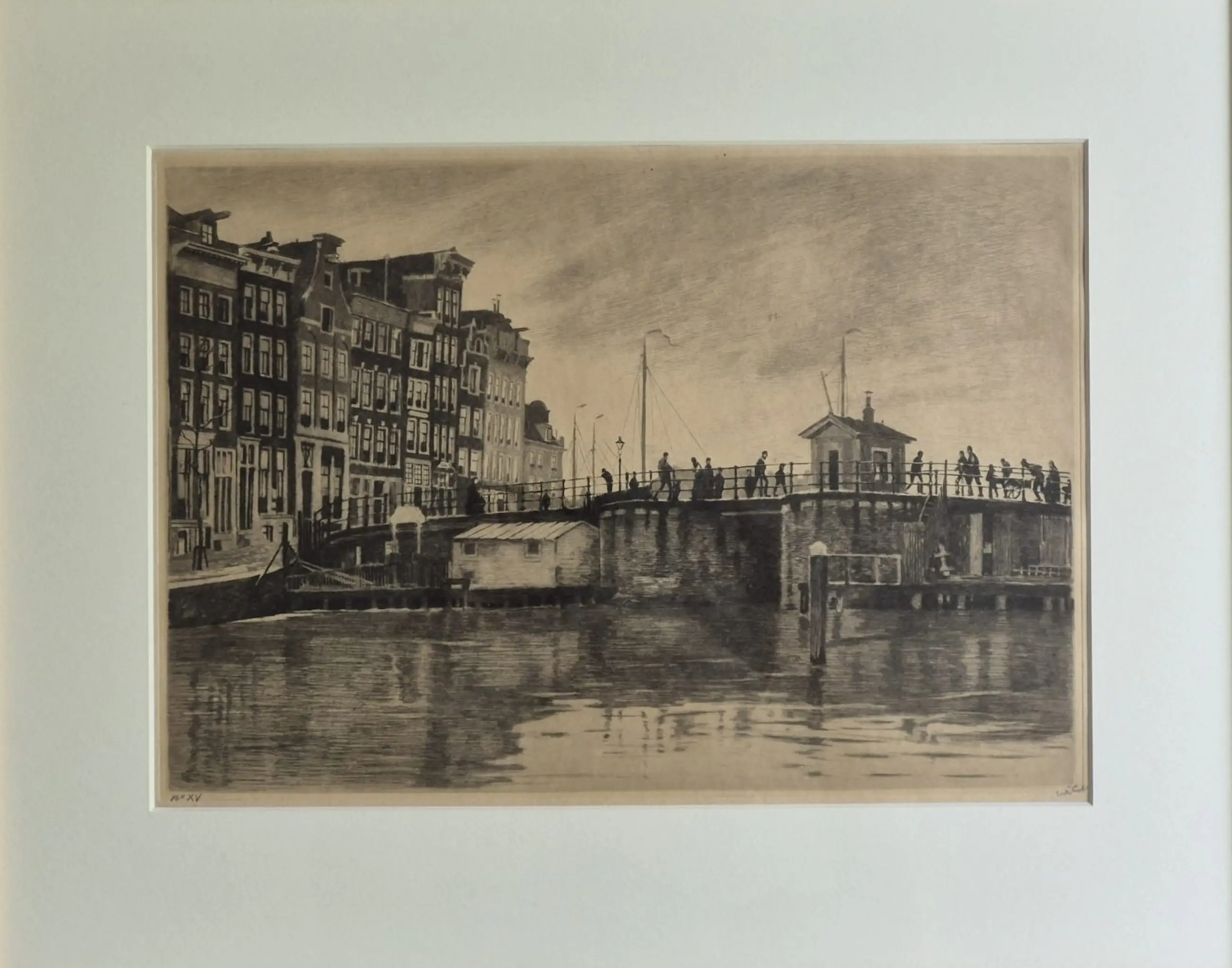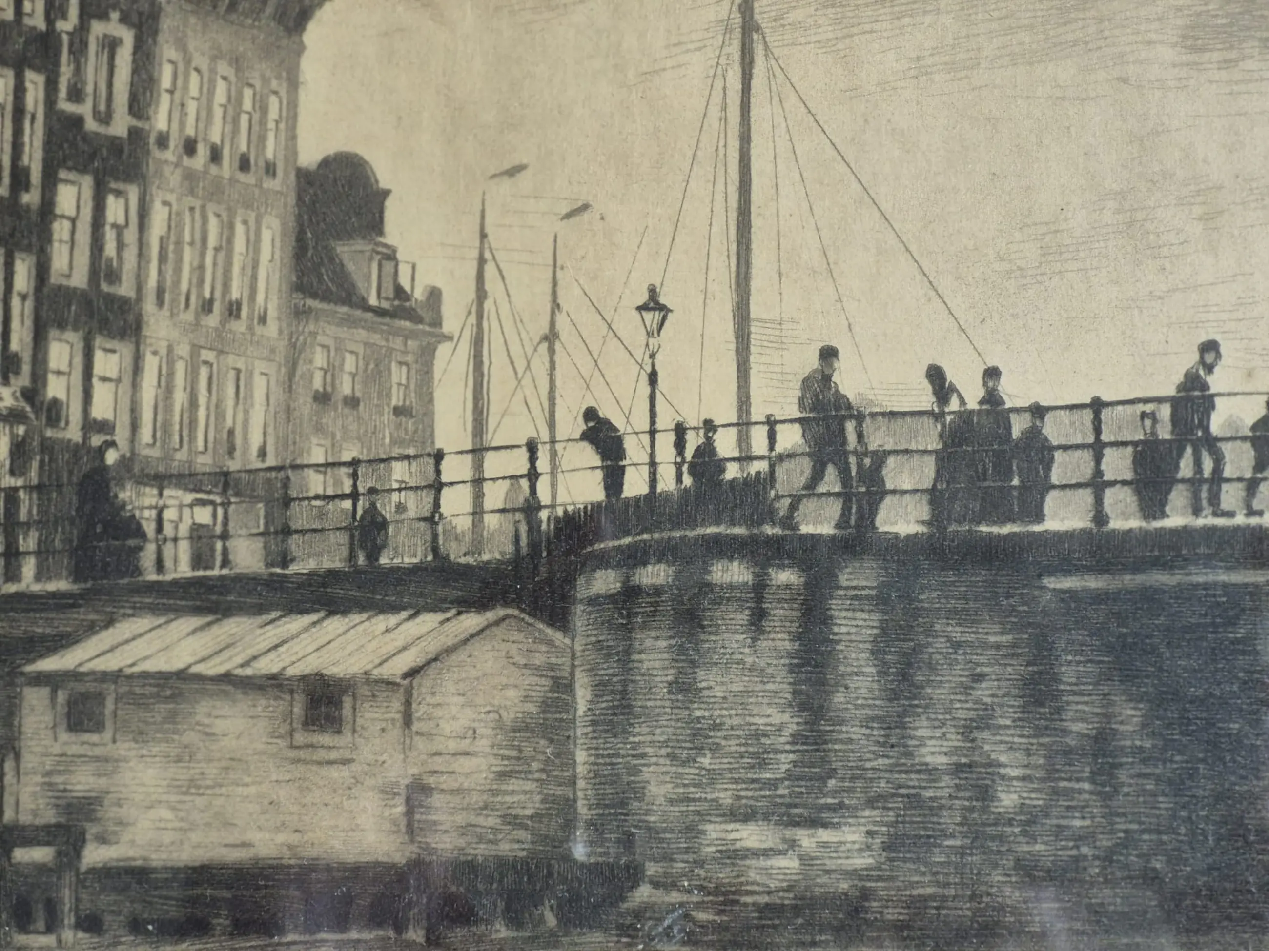 Ets/Aquatint van de Kraansluis in Amsterdam, door Willem Witsen (1860-1923) . Op de ets is de Kraansluis te zien, samen met enkele huizen aan de Prins Hendrikkade (nr 99) en de Kromme Waal (nr 1-8). Dit is de enige ets die Witsen maakte van de Kraansluis die niet spiegelbeeldig is.