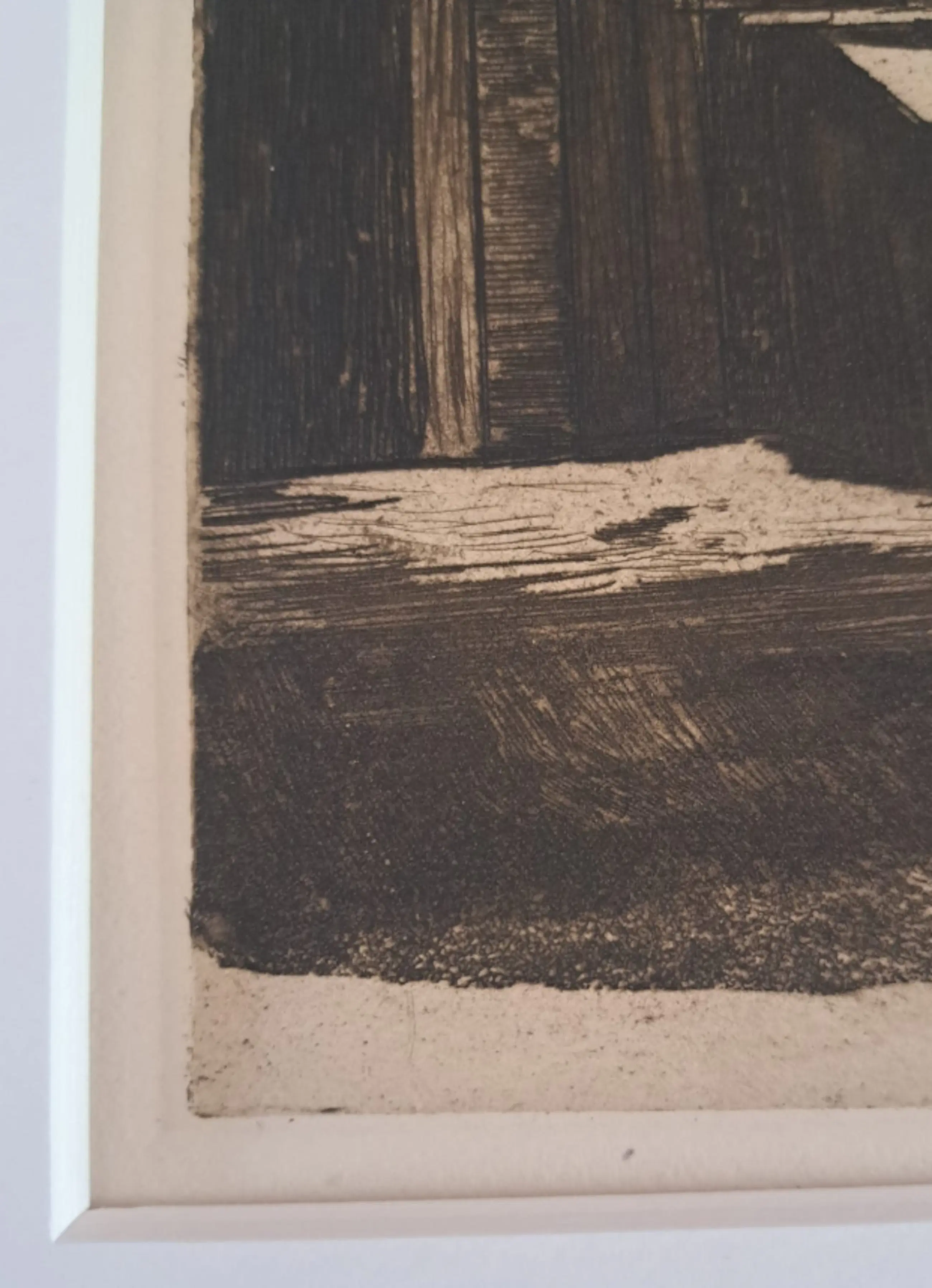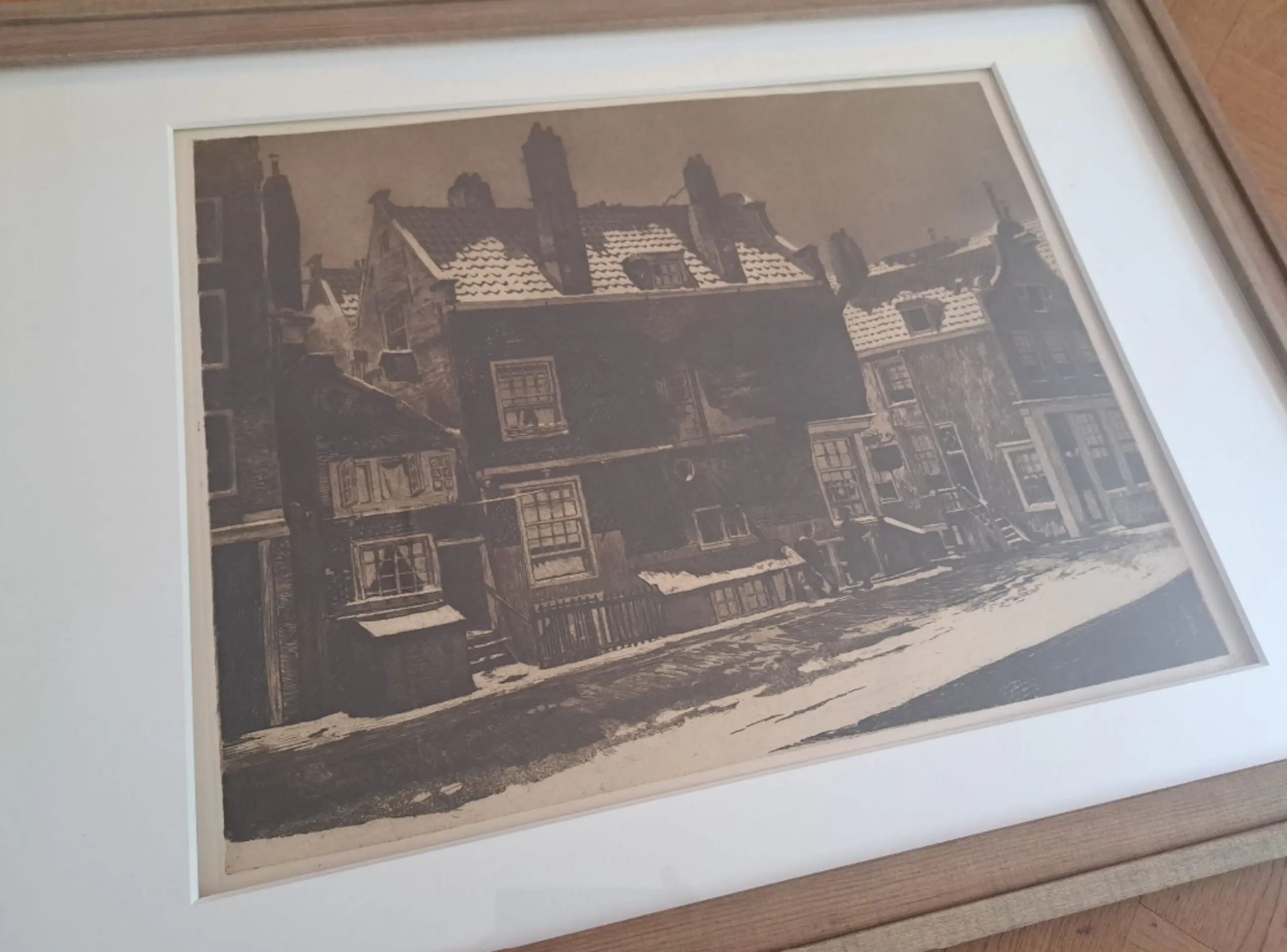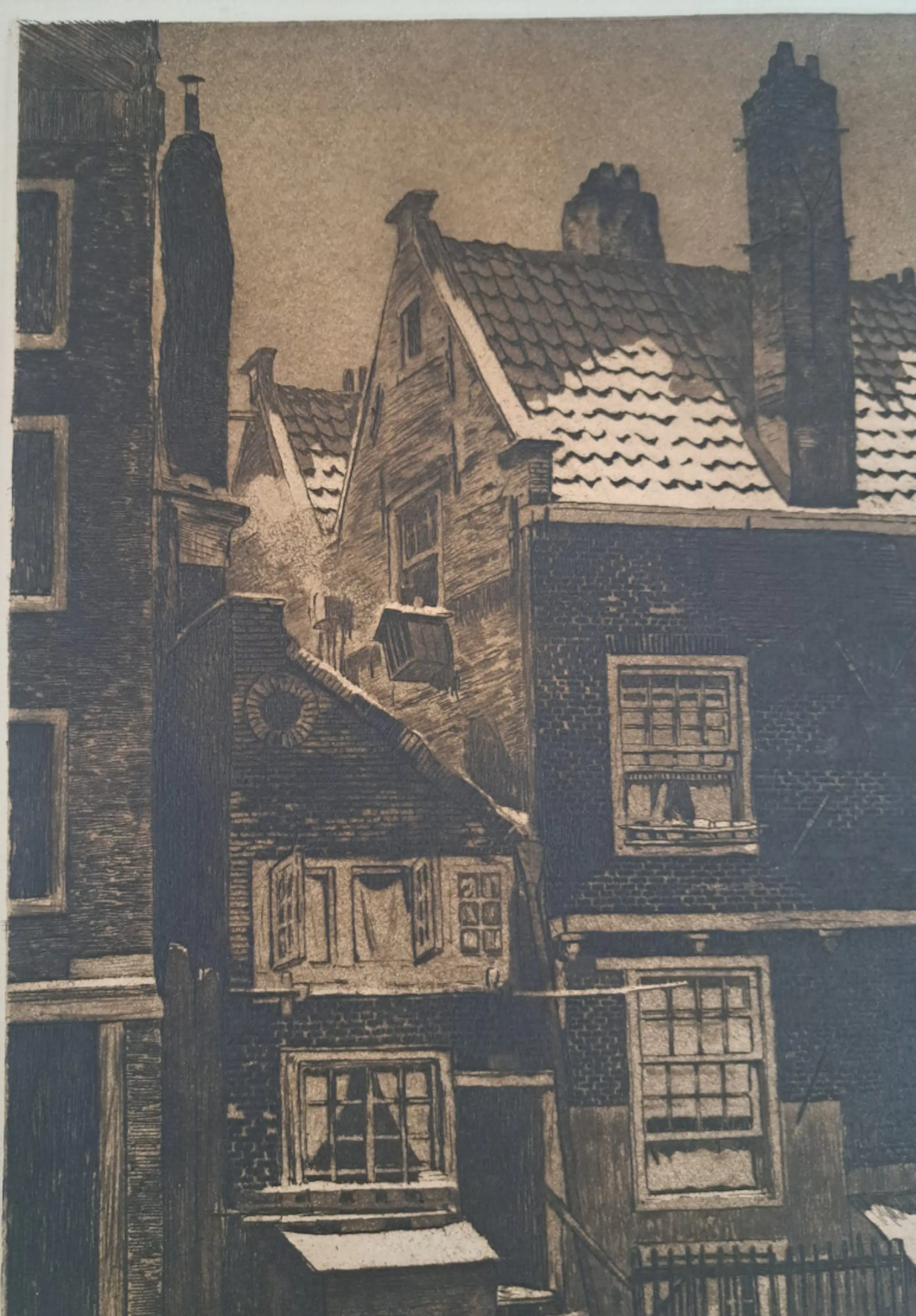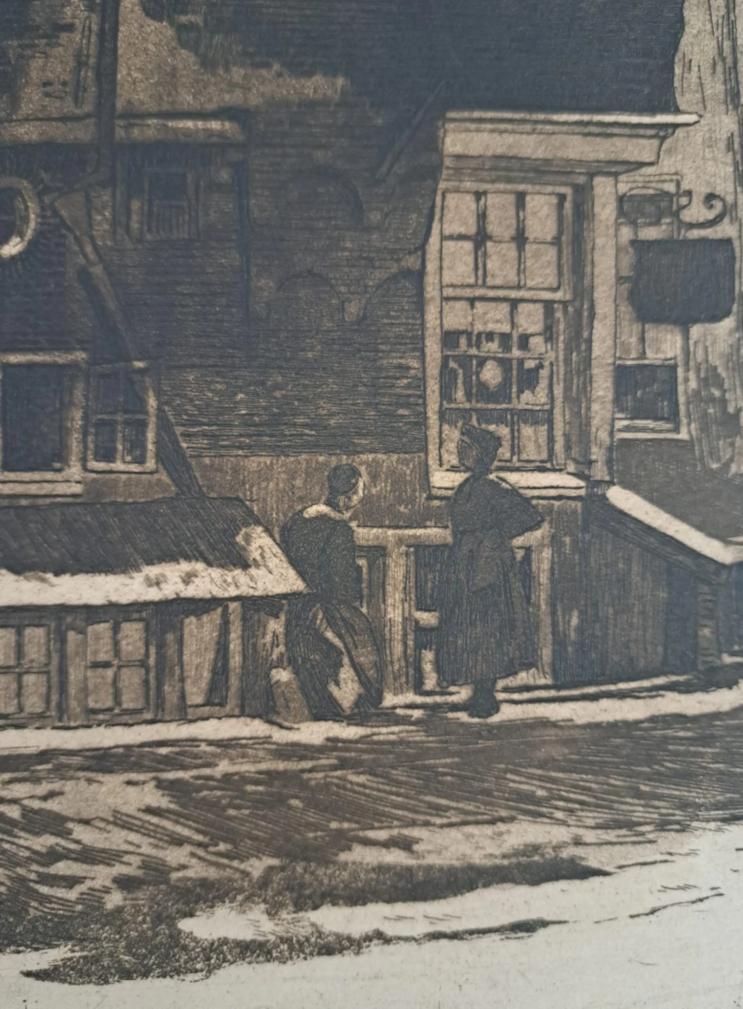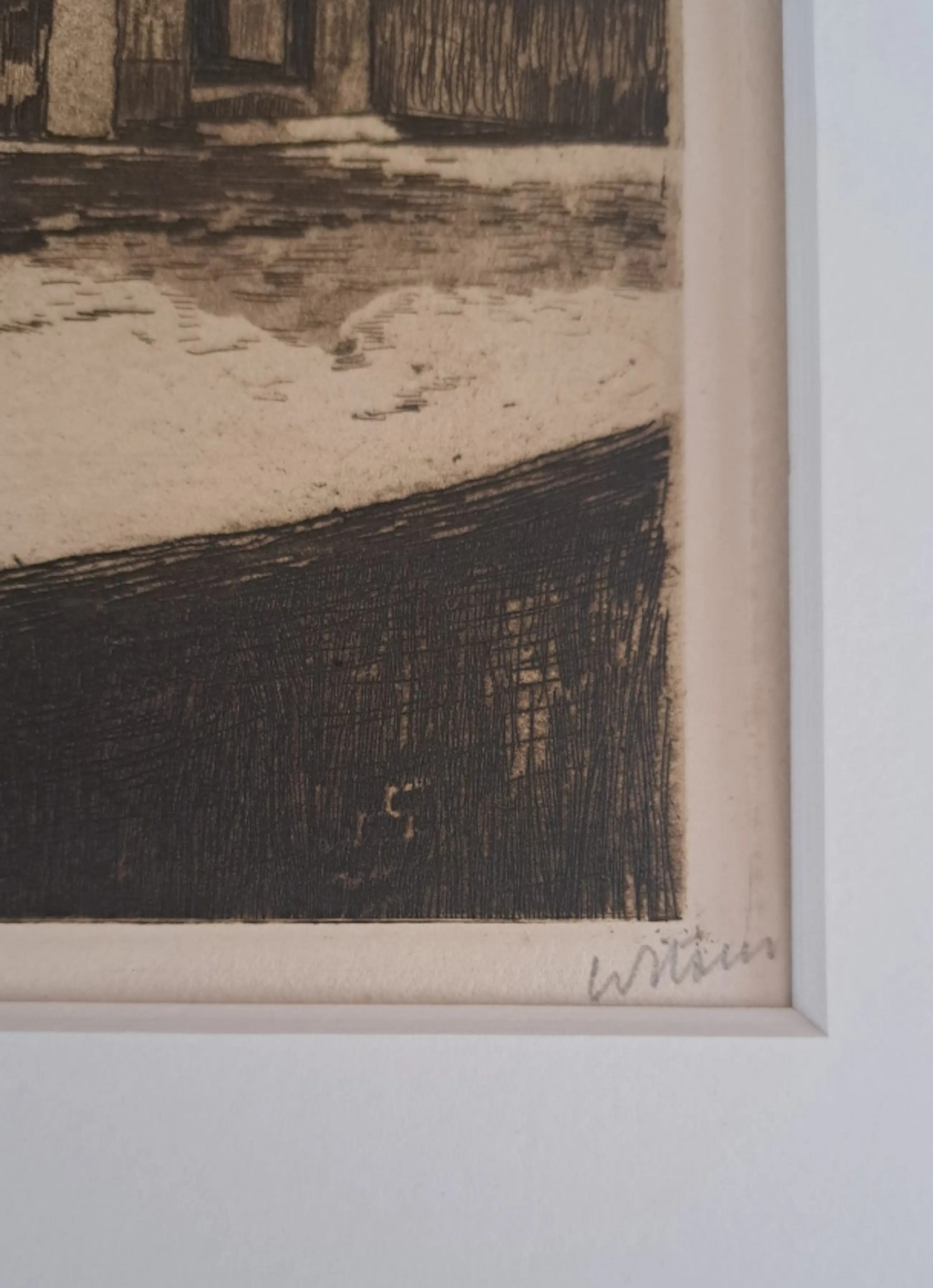Ets/Aquatint van Krom Boomssloot in Amsterdam (1907-1908, 3de staat) door Willem Witsen (1860-1923) . Witsen was een Nederlands schilder, tekenaar, etser, fotograaf en schrijver. Hij was lid van De Tachtigers: een groep kunstenaars aan het einde van de 19de eeuw waartoe ook o.a. Breitner, Israëls, Veth, Gorter en Kloos behoorden.