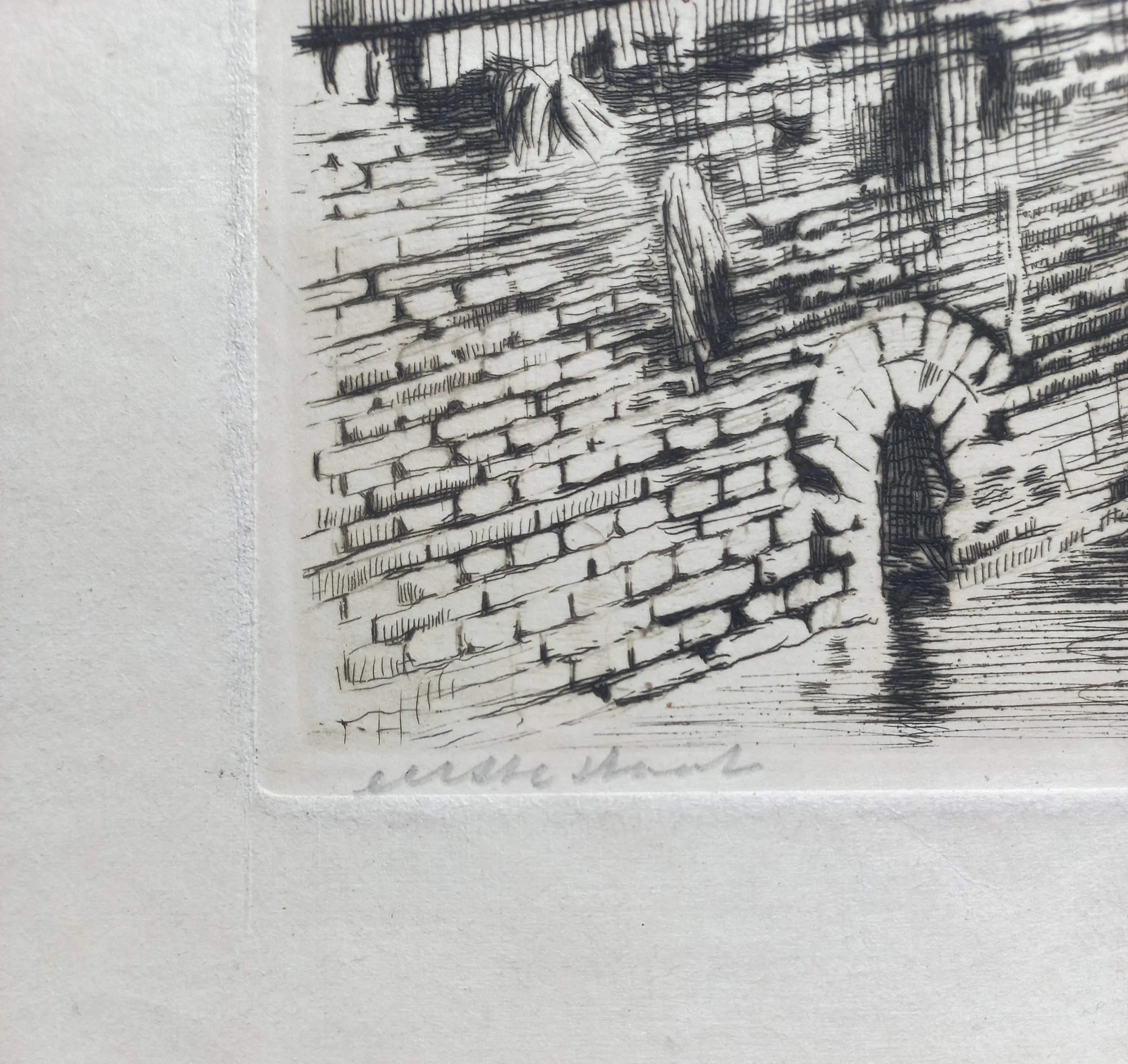 De uiterste randen van het blad links en rechts zijn beduimeld maar de ets en een zeer ruime marge eromheen zijn in prima conditie. Ingelijst met passe-partout is het werk zeer goed.
