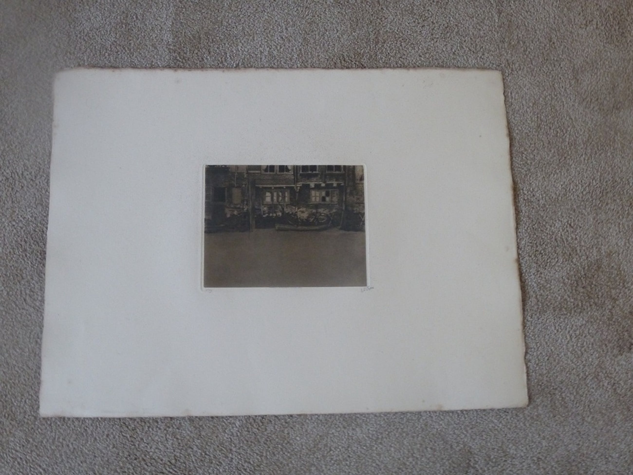 Het gaat hier om een originele ets. Deze etsen zijn allemaal gedrukt op dun papier aan de bovenkant is bevestigd (meestal in de hoeken) op een groot vel dik papier om iedere ets op gelijk formaat in de bundel te kunnen opnemen. Dit blad wordt in principe niet gebruikt als u het werk laat inlijsten en de conditie van het achterblad wordt dan ook niet beschreven en is bij dit portfolio vaak gevlekt (is vaak zo onder invloed van de tijd/vocht op dit papier). We beschrijven dus alleen de ets/etsblad.