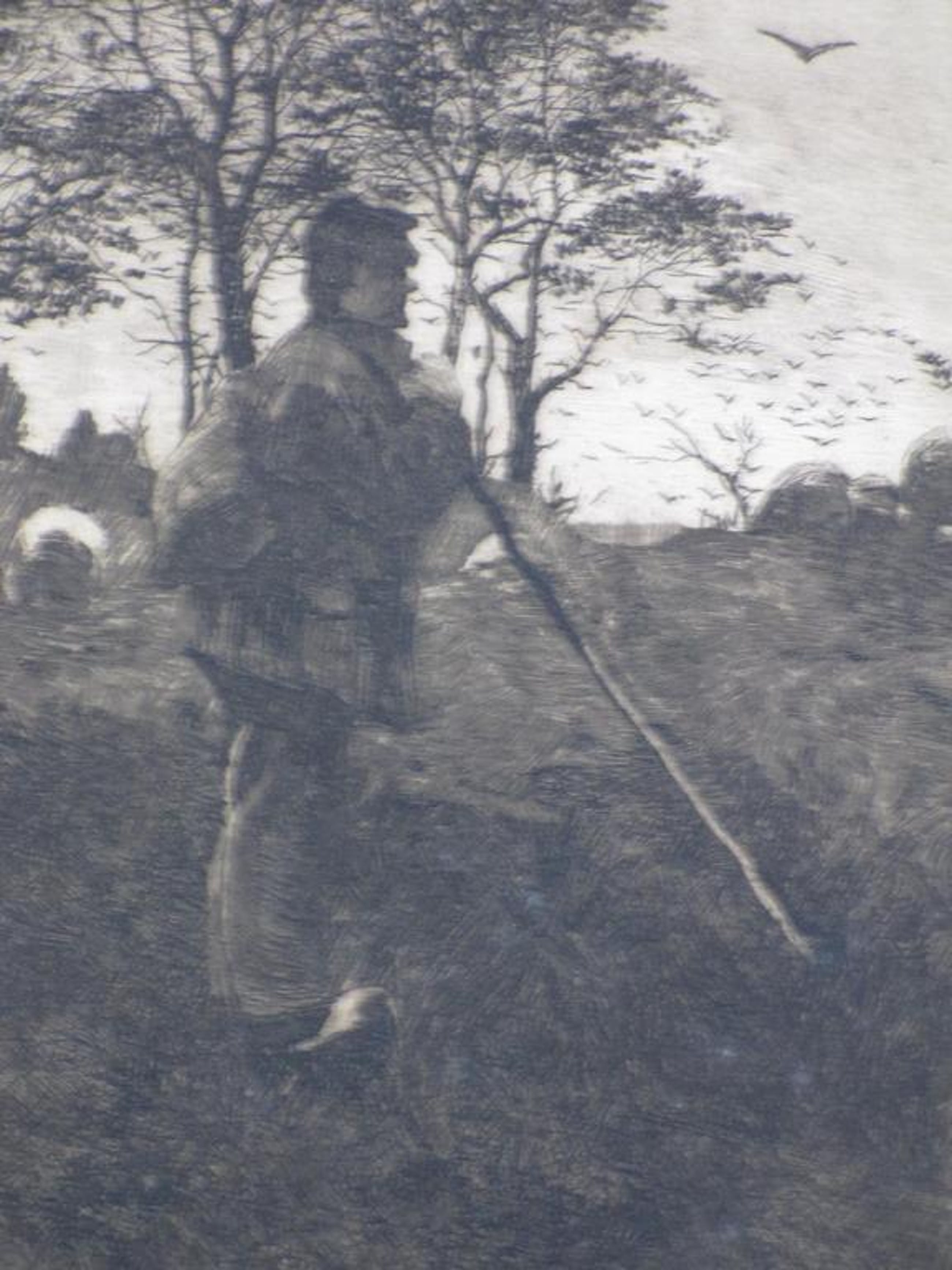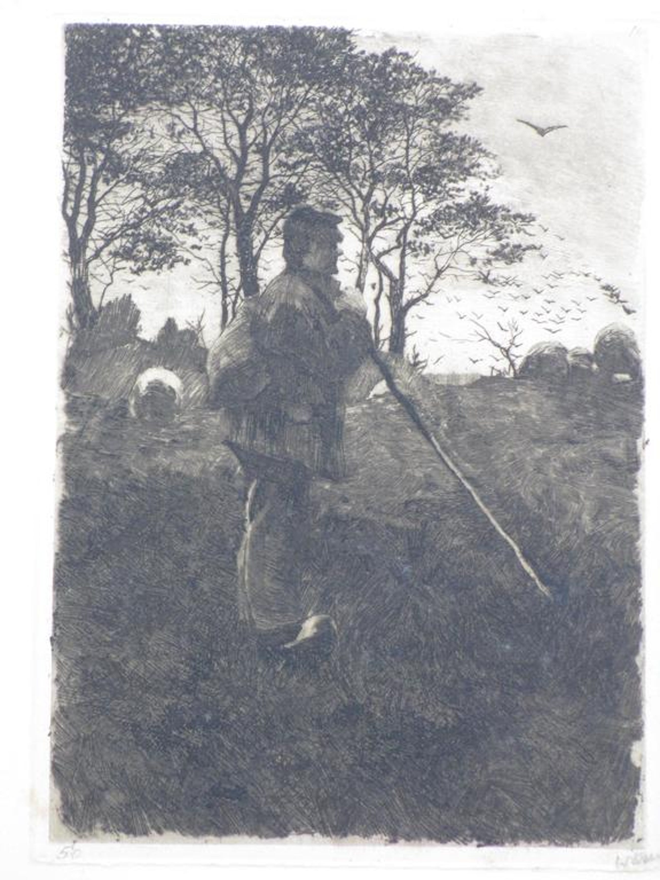 Voorstelling van een staande schaapherder, leunend op zijn staf en kijkend naar rechts.