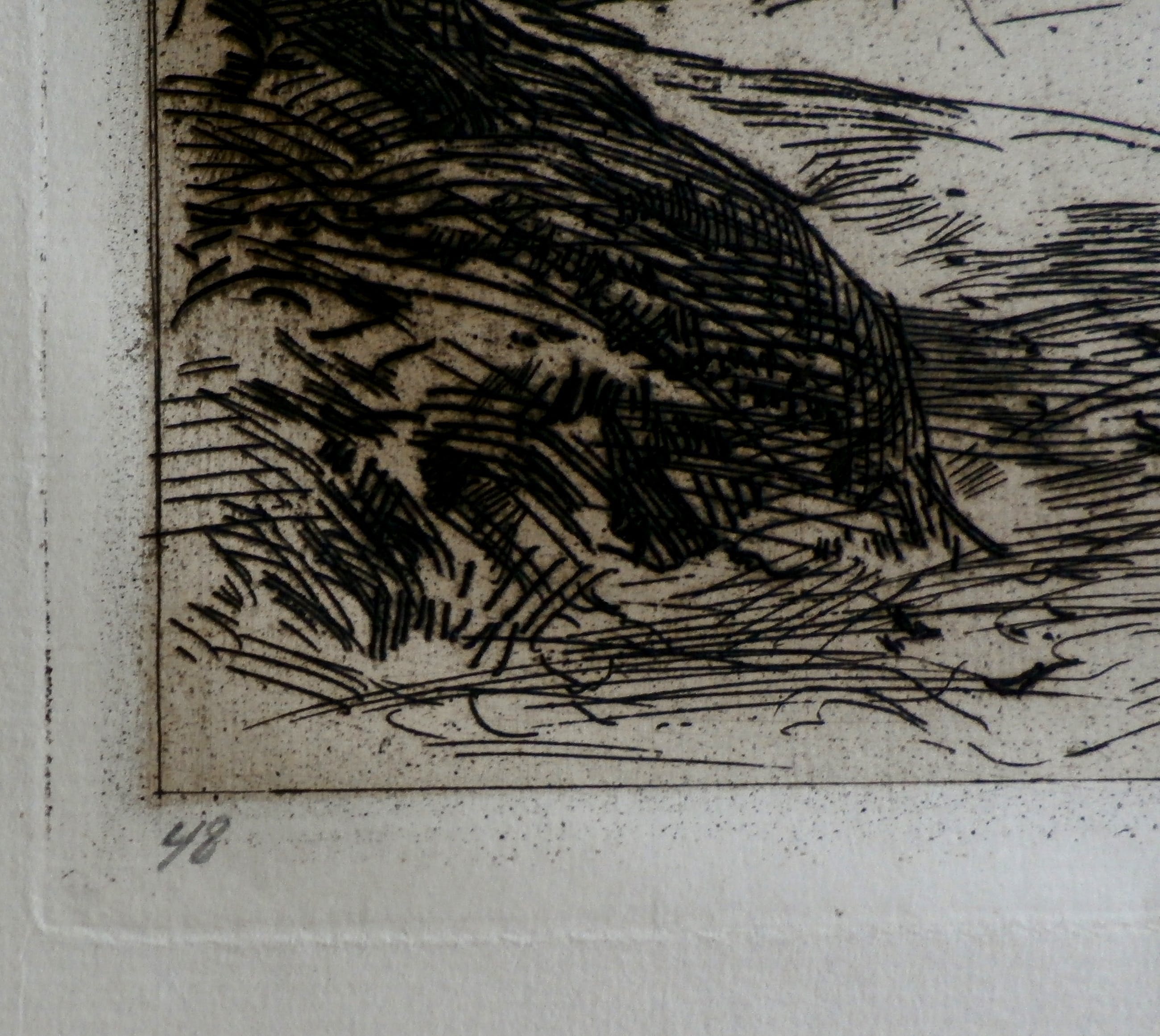 | De ets is in zeer goede staat. Op de achterzijde zitten wat plakresten van een vorige inlijsting. Wat vergeling en kreukjes op de witte rand om het werk heen. | |||