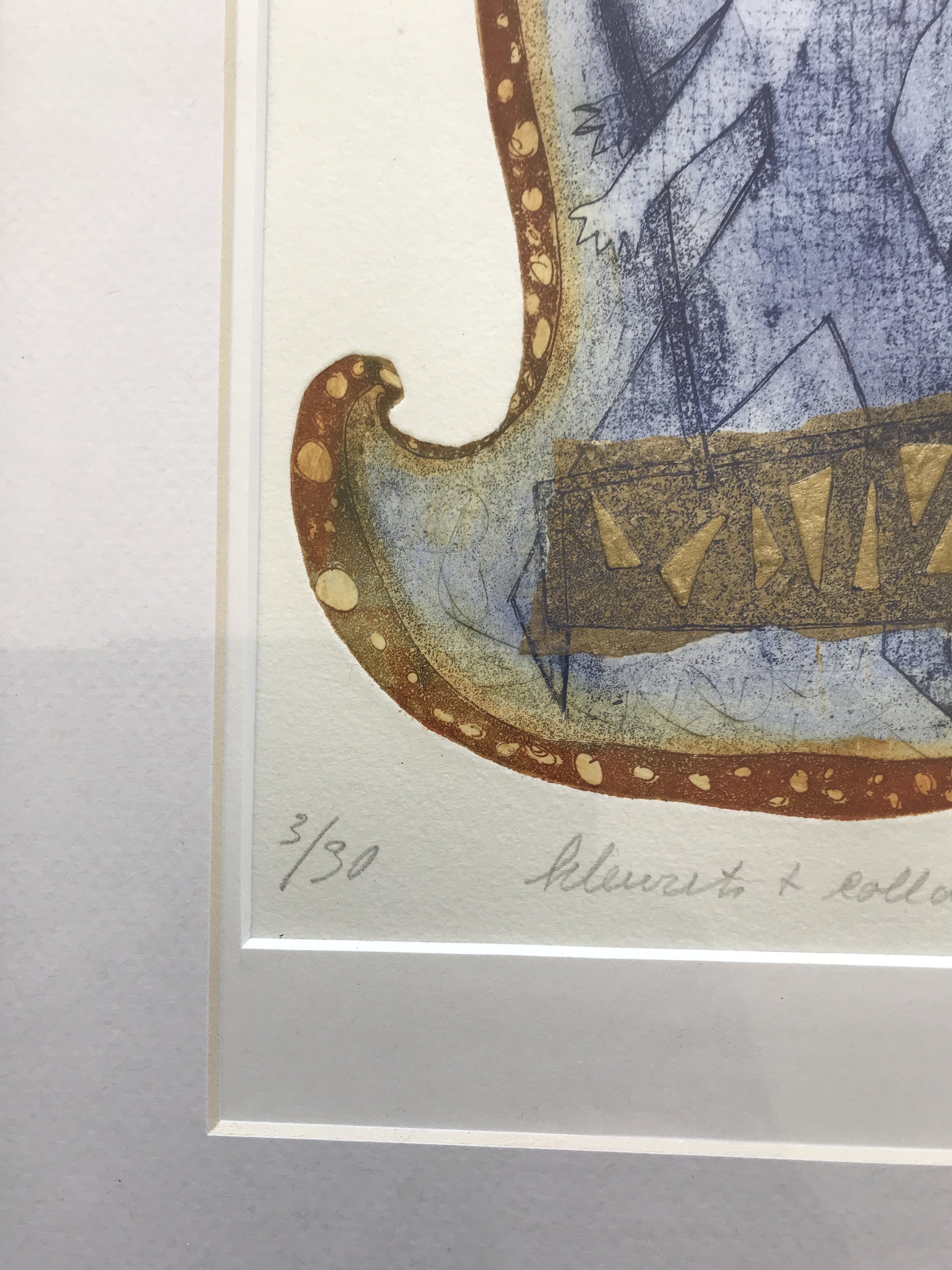 Mooie ets op gedeeltelijk collage werk. Nr 3 van 30. Mooi helder werk. Met een lopen vrouwenfiguur. Dubbele passe-partour in mooie lijst.