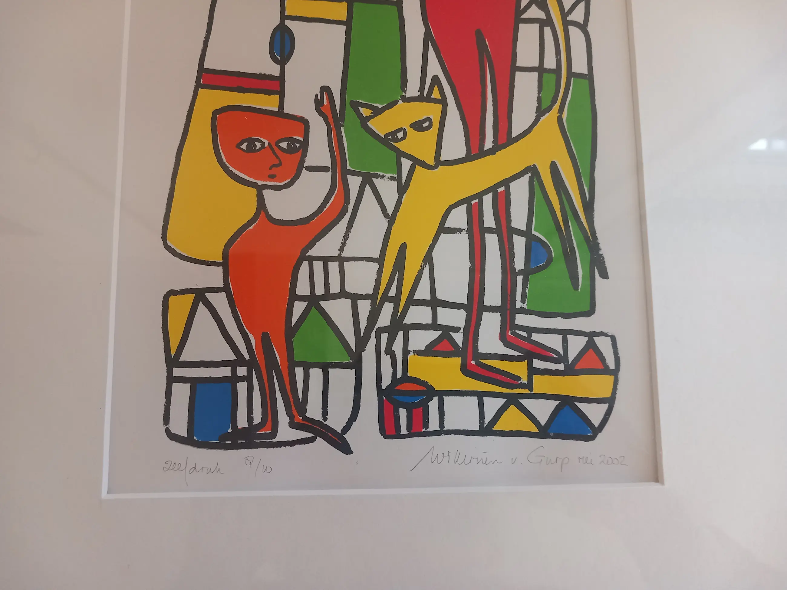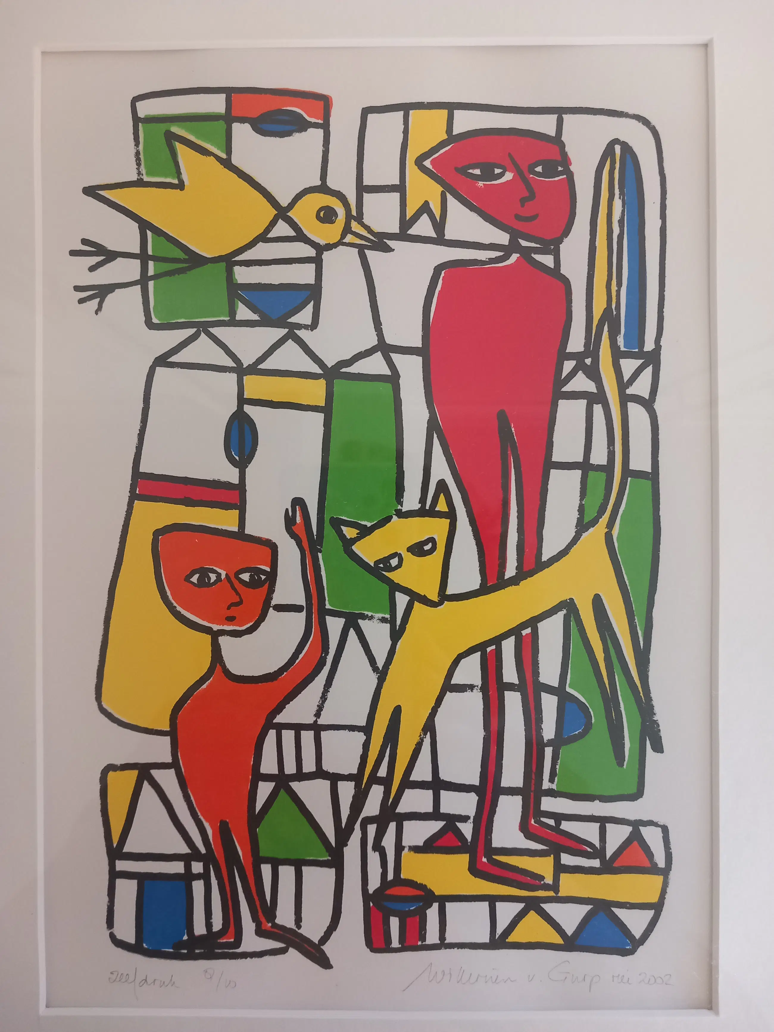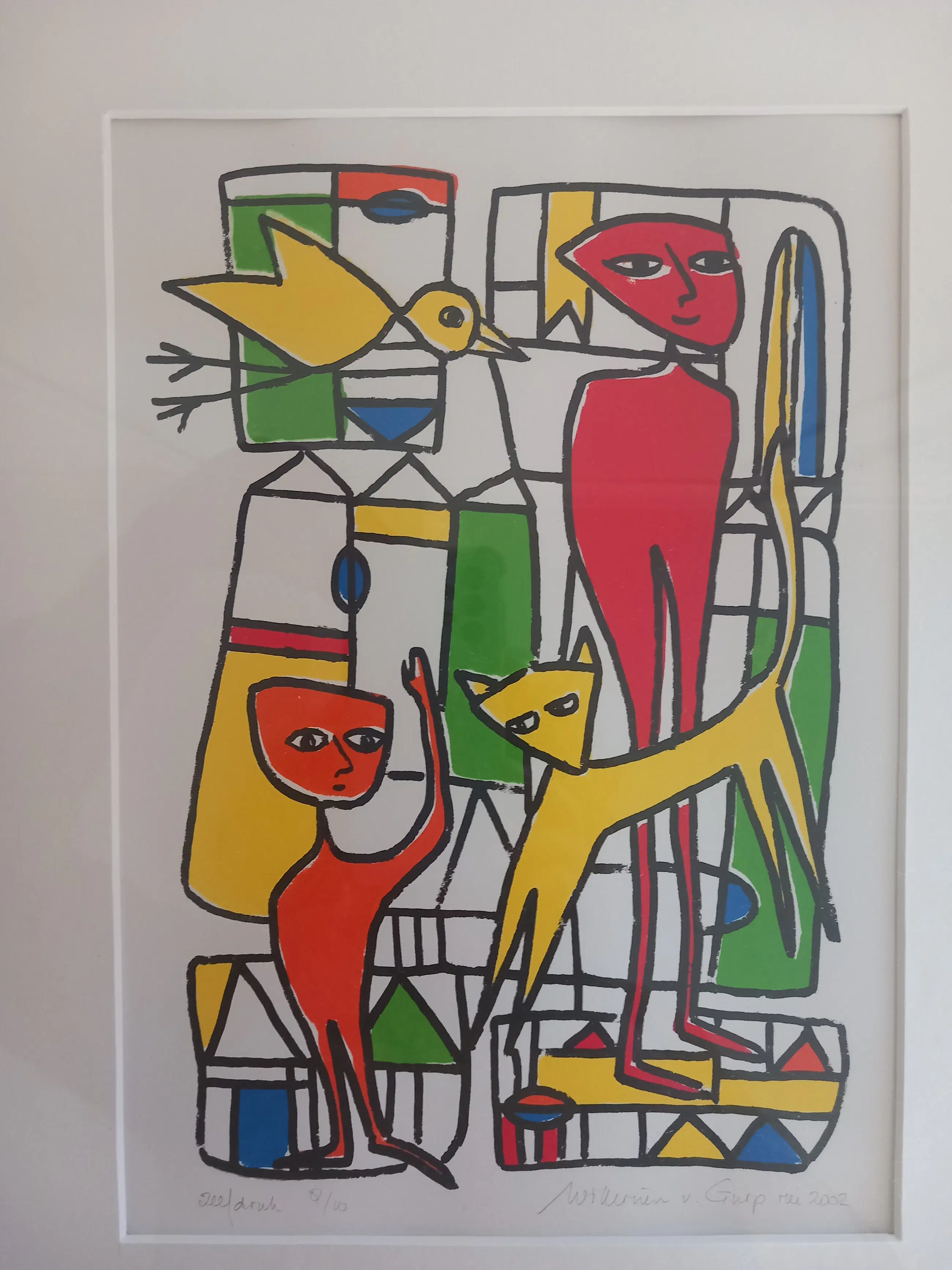 Willemien van Gurp is een Nederlandse beeldend kunstenaar. Haar werk hangt vooral samen met de verassende aspecten van het scheppingsproces. Ze werkt niet vanuit een vastomlijnd plan maar speelt met het toeval, met het materiaal en met het beeld dat geleidelijk ontstaat. Dit betreft een zeefdruk met een gelimiteerd aantal namelijk 8/10. Dit beeld geeft met strakke lijnen en felle kleuren een afscheid weer met dieren en mensen die op abstracte wijze worden afgebeeld.