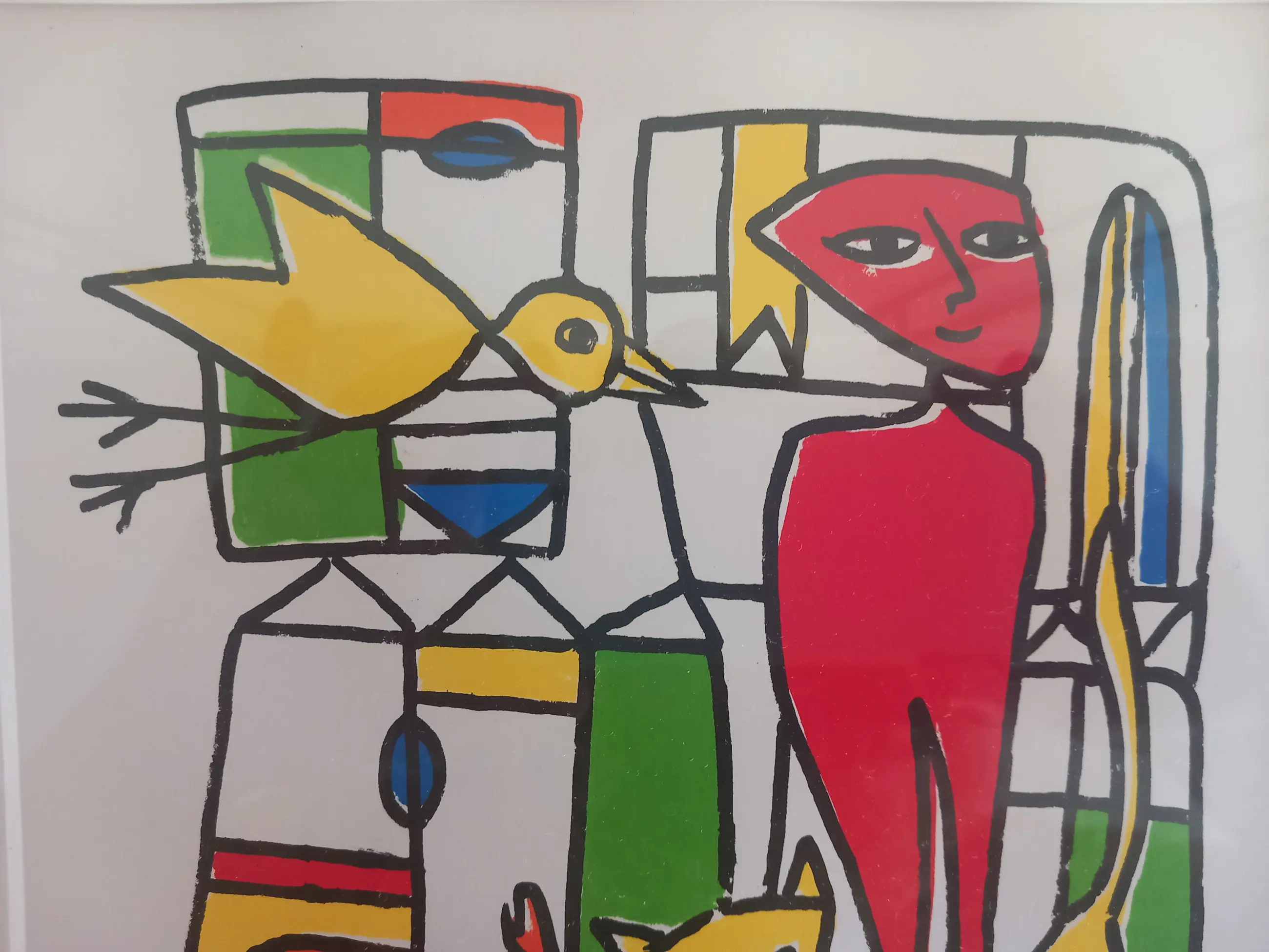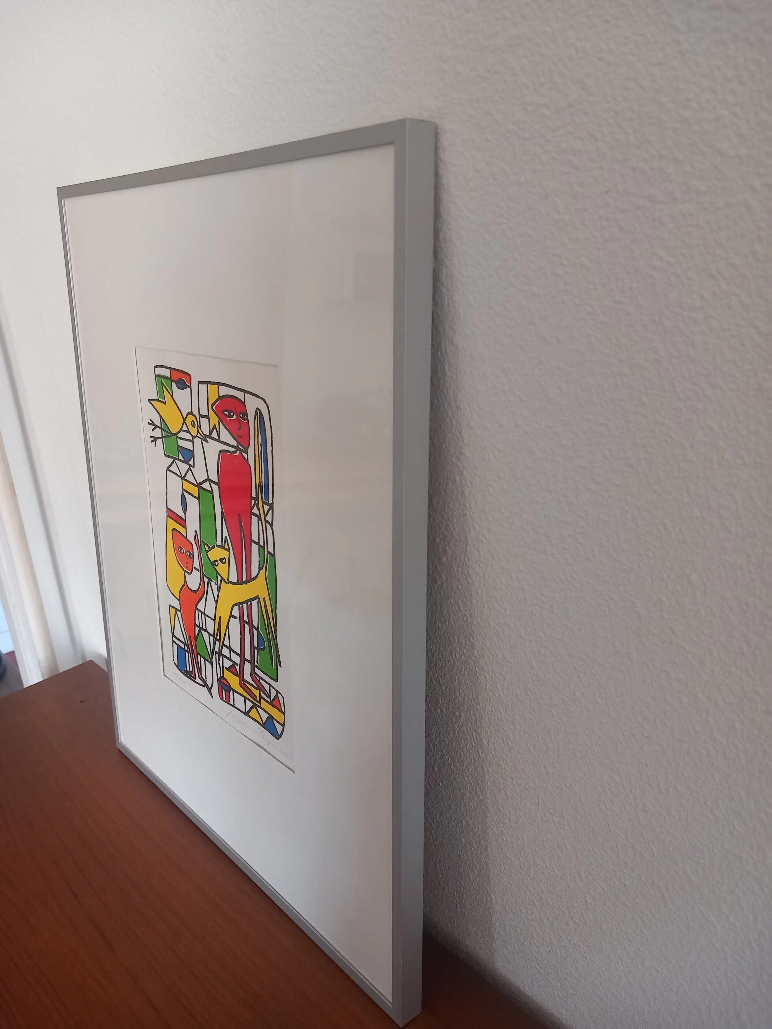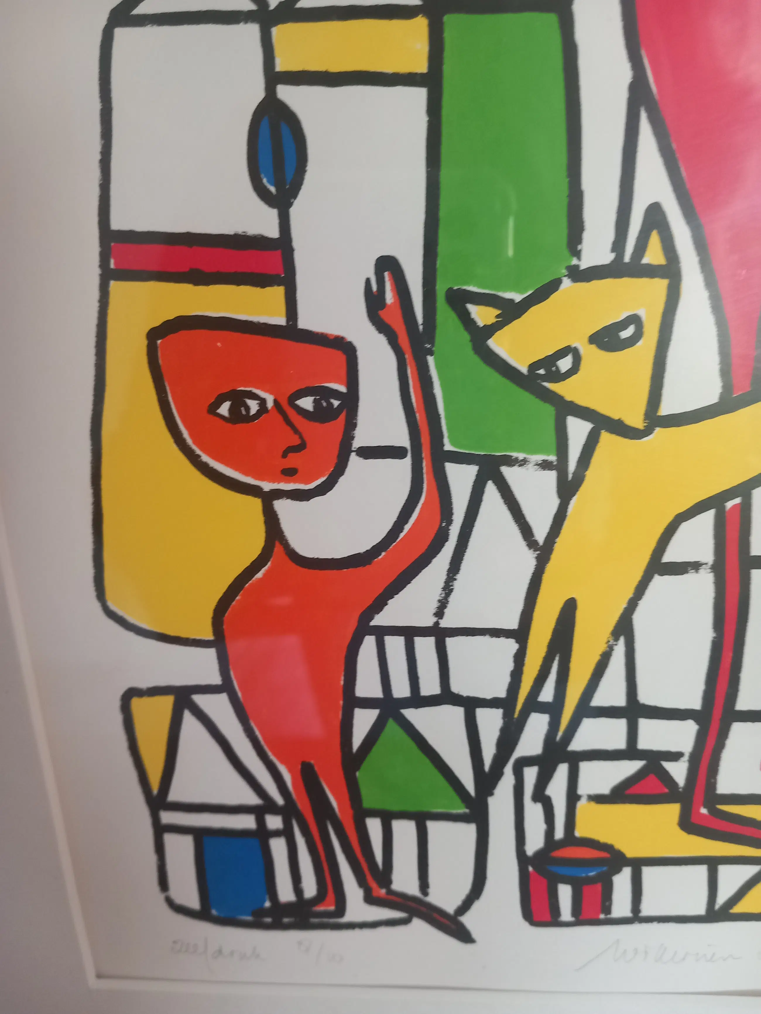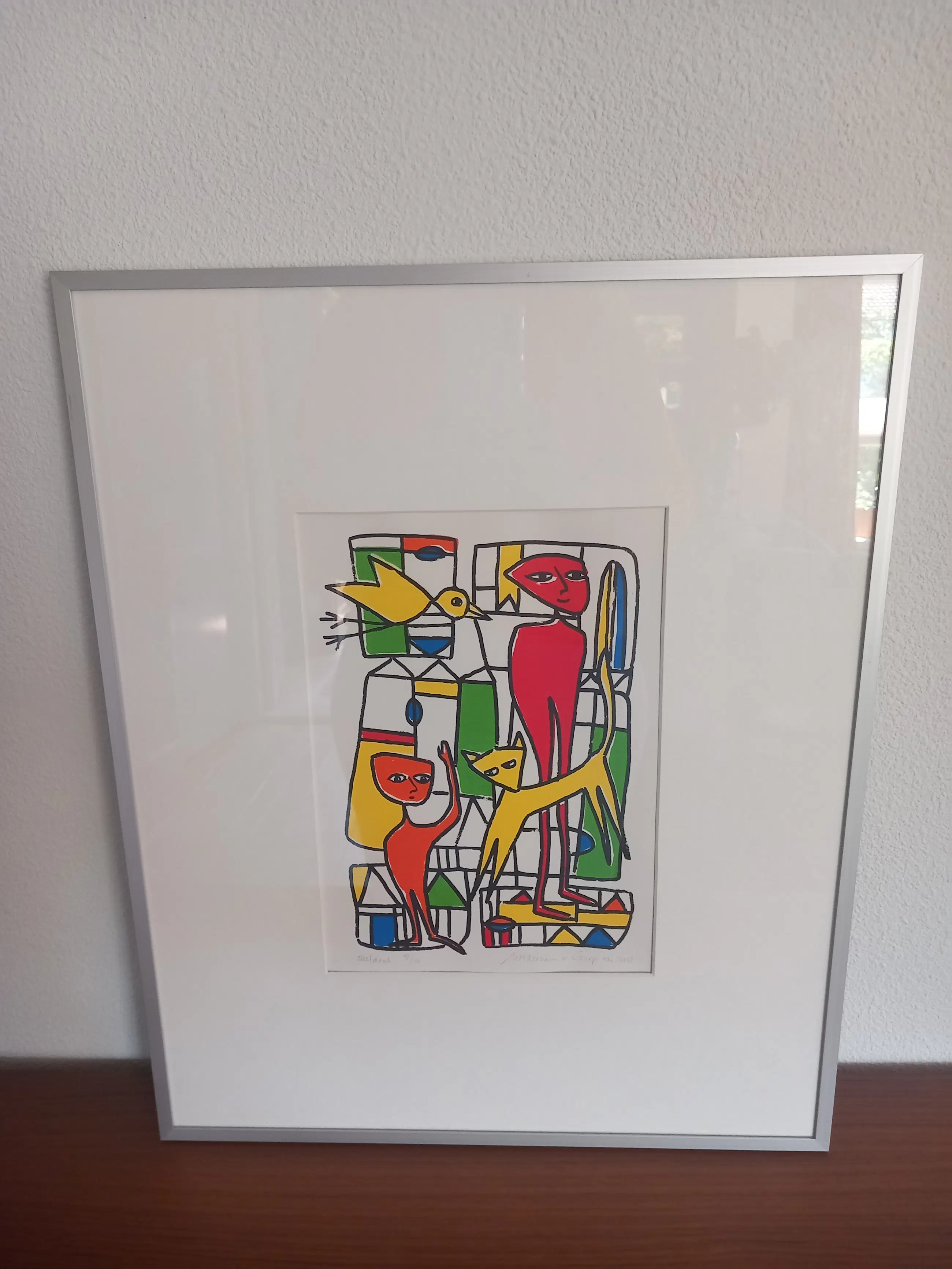 Willemien van Gurp is een Nederlandse beeldend kunstenaar. Haar werk hangt vooral samen met de verassende aspecten van het scheppingsproces. Ze werkt niet vanuit een vastomlijnd plan maar speelt met het toeval, met het materiaal en met het beeld dat geleidelijk ontstaat. Dit betreft een zeefdruk met een gelimiteerd aantal namelijk 8/10. Dit beeld geeft met strakke lijnen en felle kleuren een afscheid weer met dieren en mensen die op abstracte wijze worden afgebeeld.
