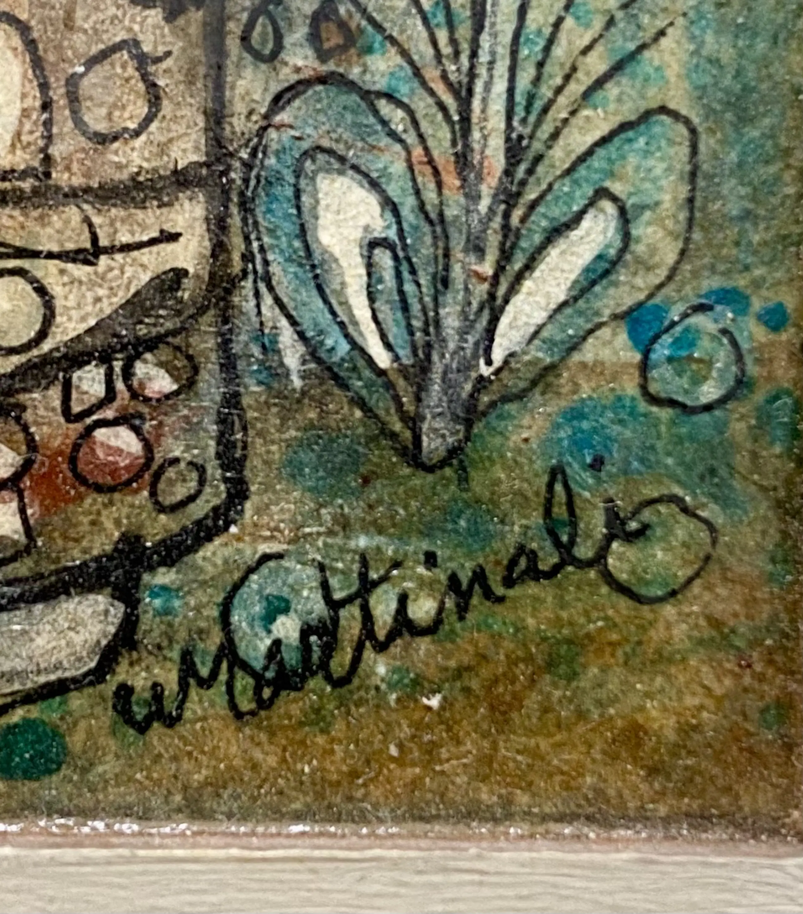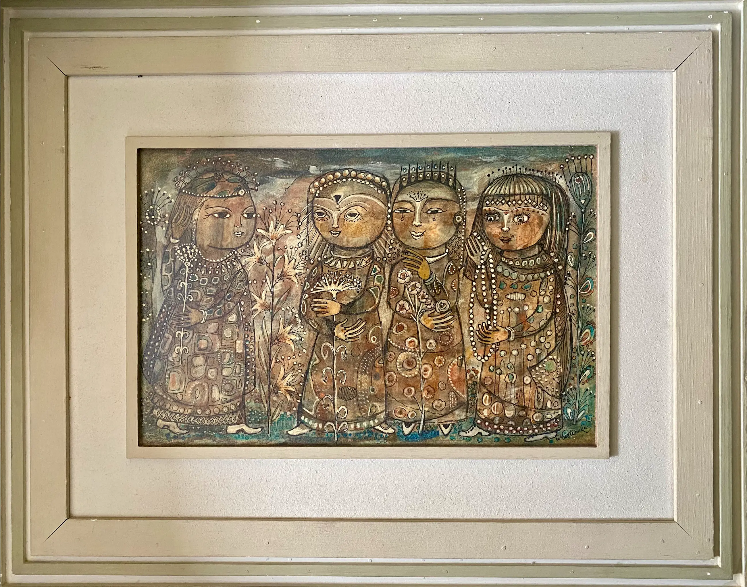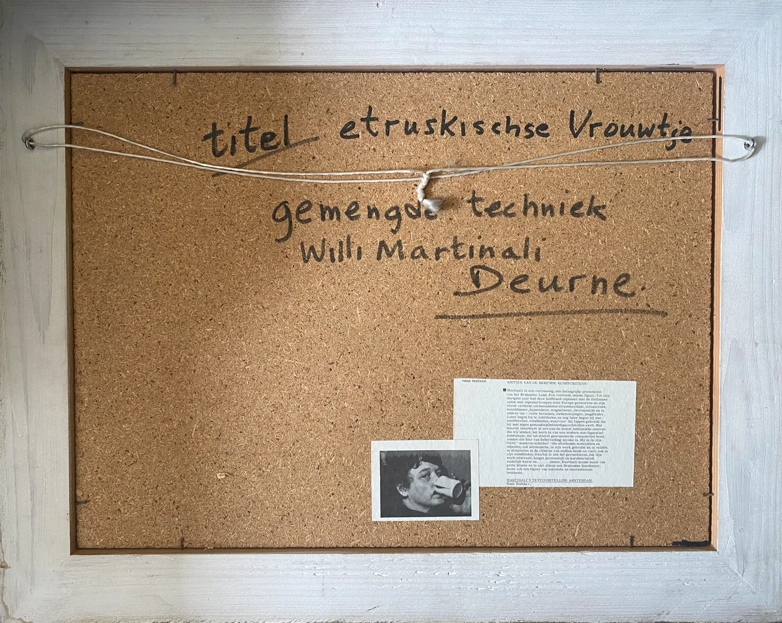 Schilderij gemaakt met gemengde techniek getiteld ‘Etruskische vrouwtje’ geschilderd en gesigneerd door de kunstenaar Willi Martinali. Gezet in lijst met passe partout.
