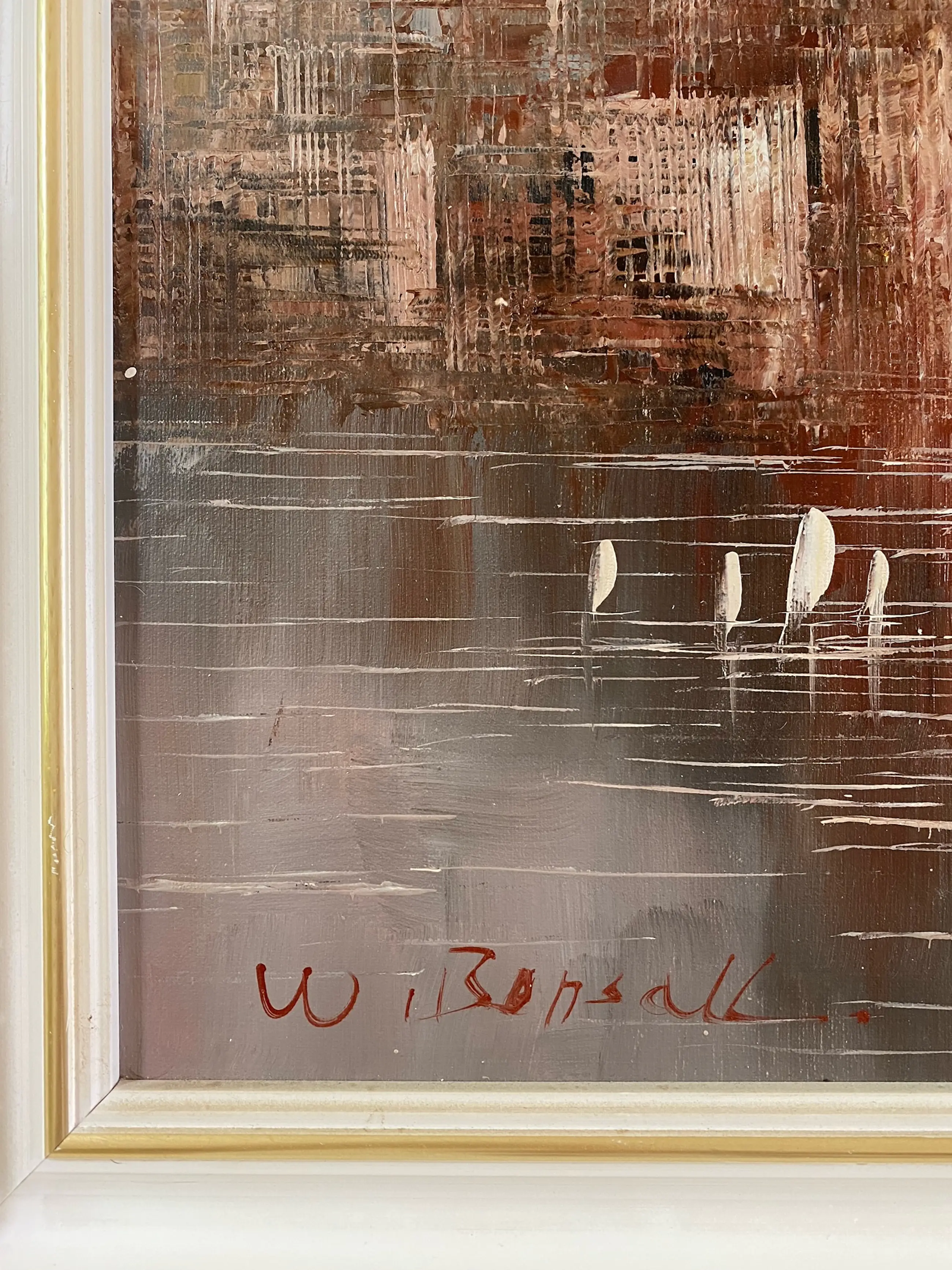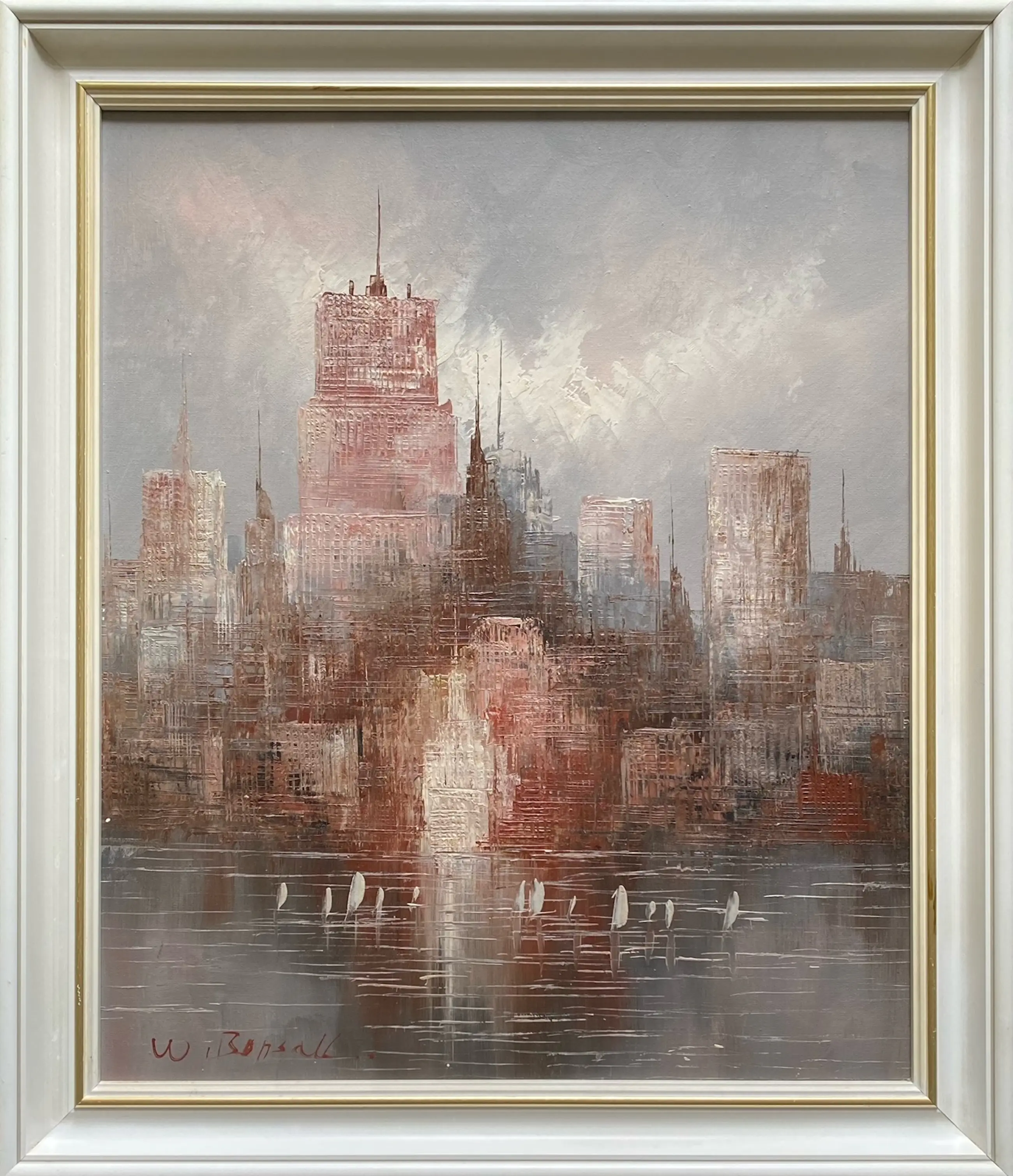 Kenmerkend werk van W. Bonsoll. Skyline. Geschilderd op canvas. Keurig ingelijst in witte lijst met goudkleurige binnenrand.