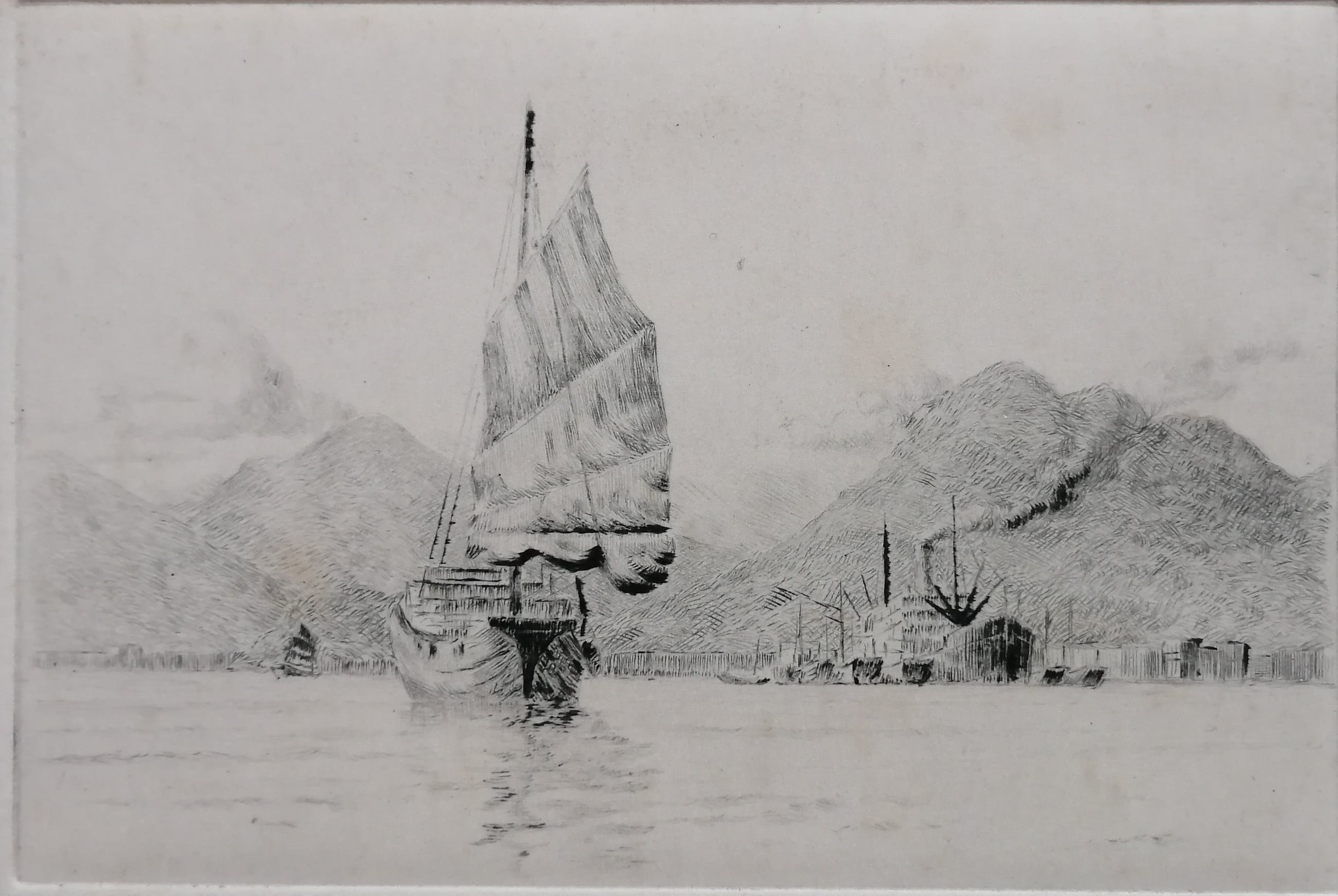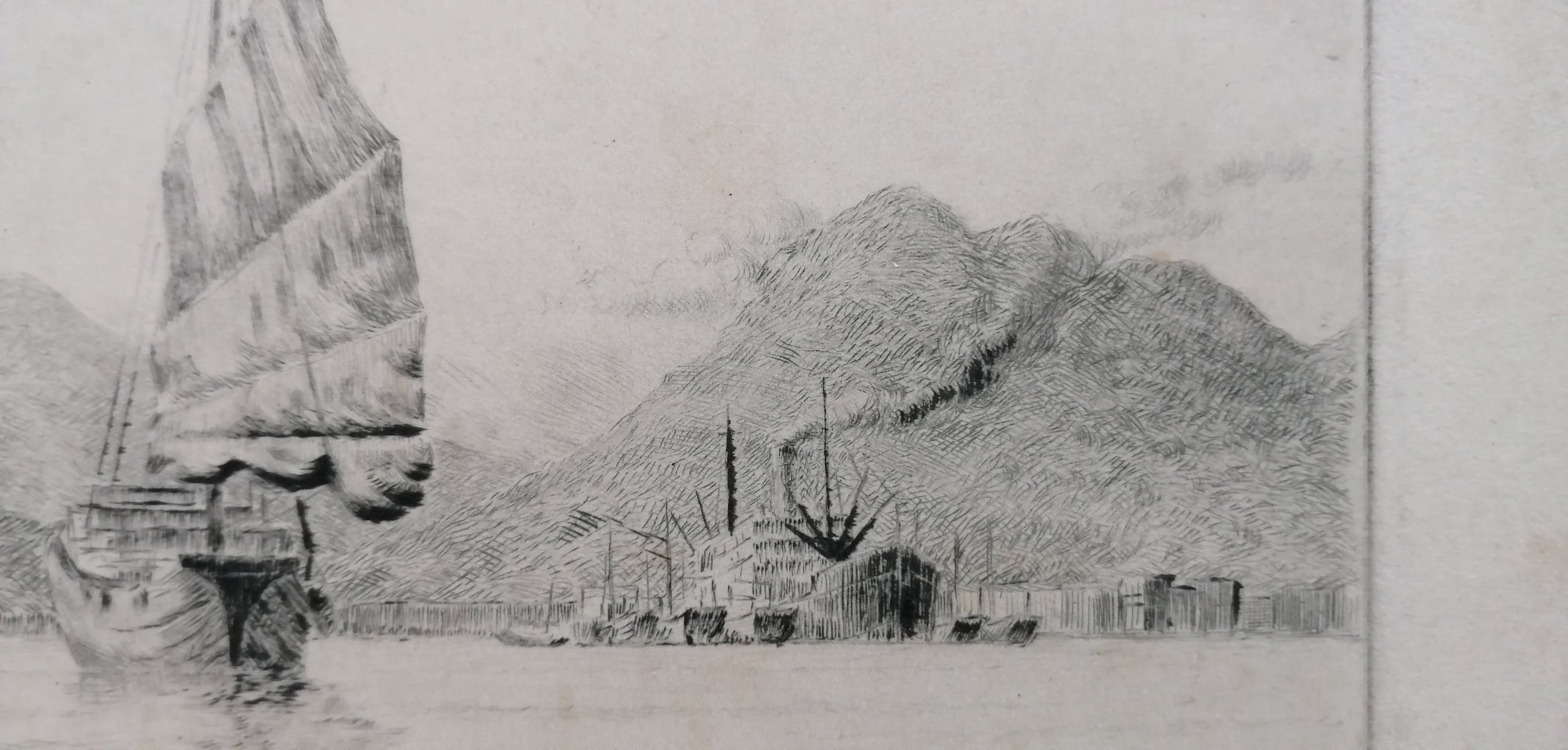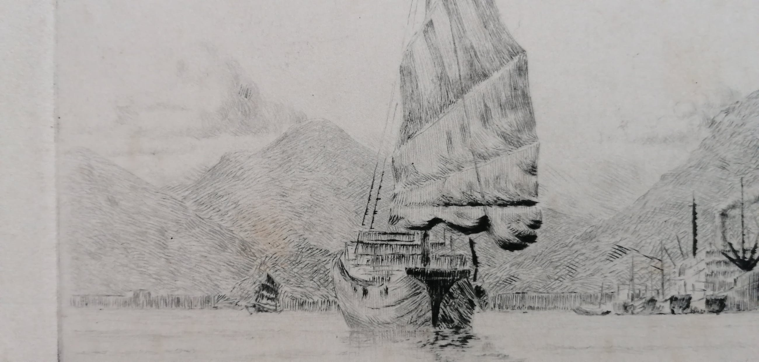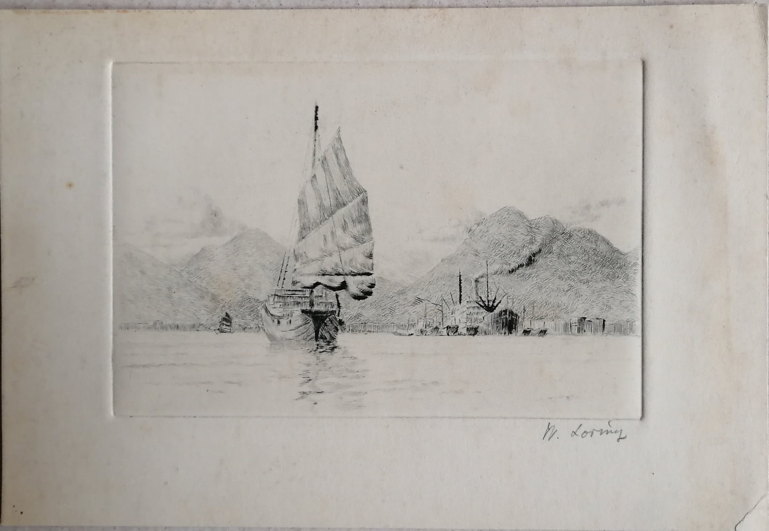 Kleine maar fijne ets met de haven van Hong Kong.Gesigneerd rechtsonder.Beeldmaat 10x15 cm. Bladmaat 14,5x21,5 cm. Losbladig.