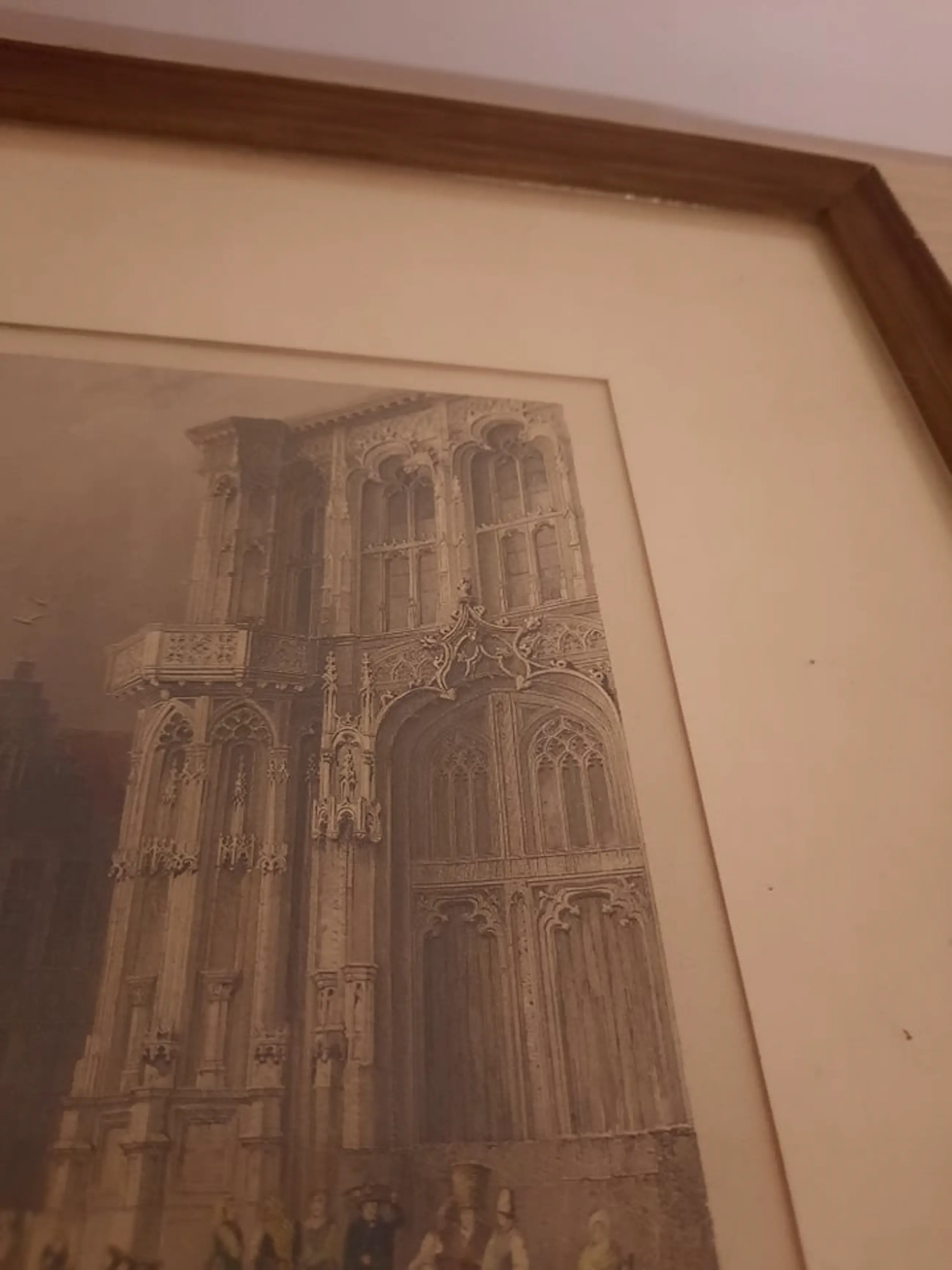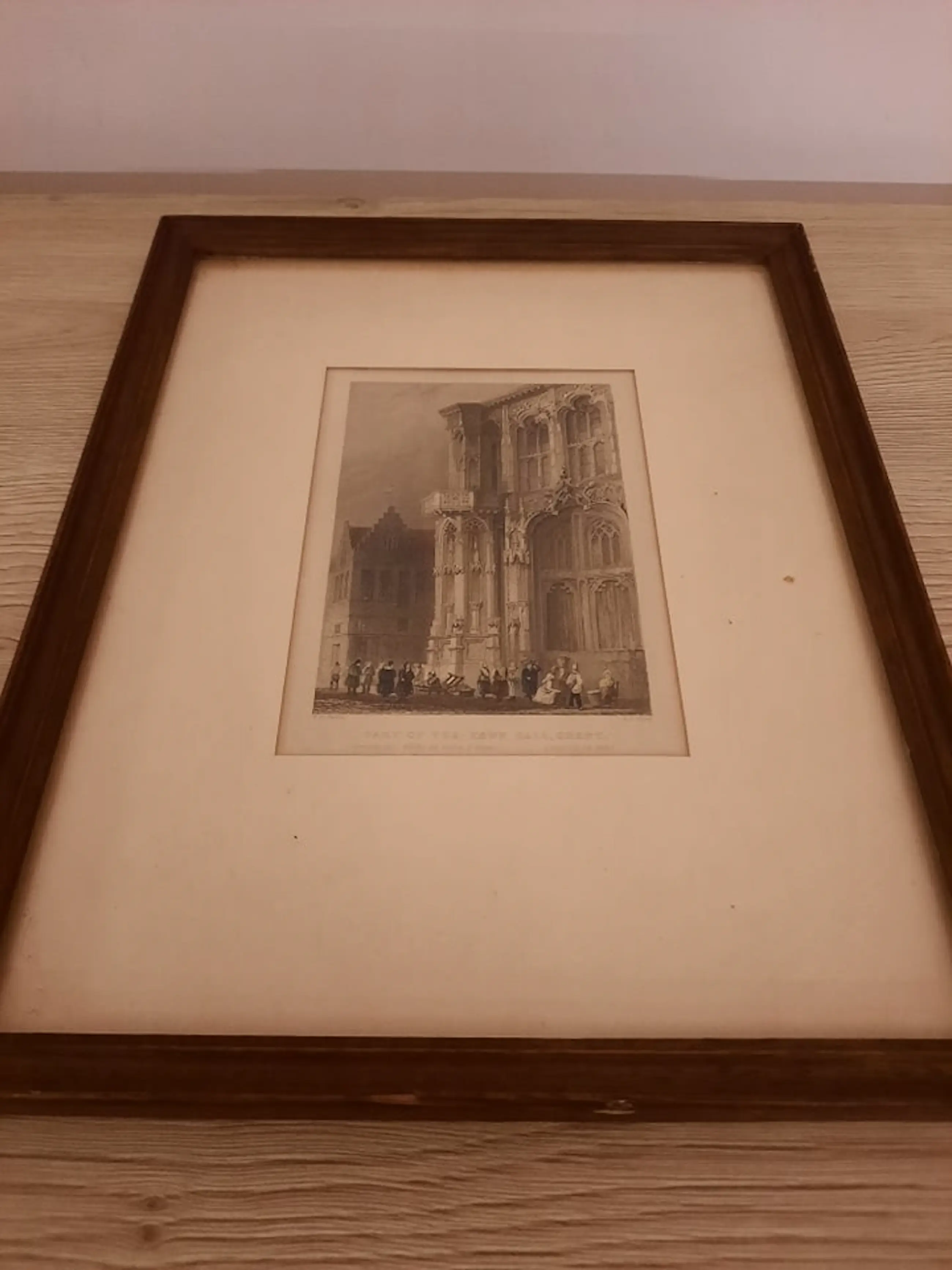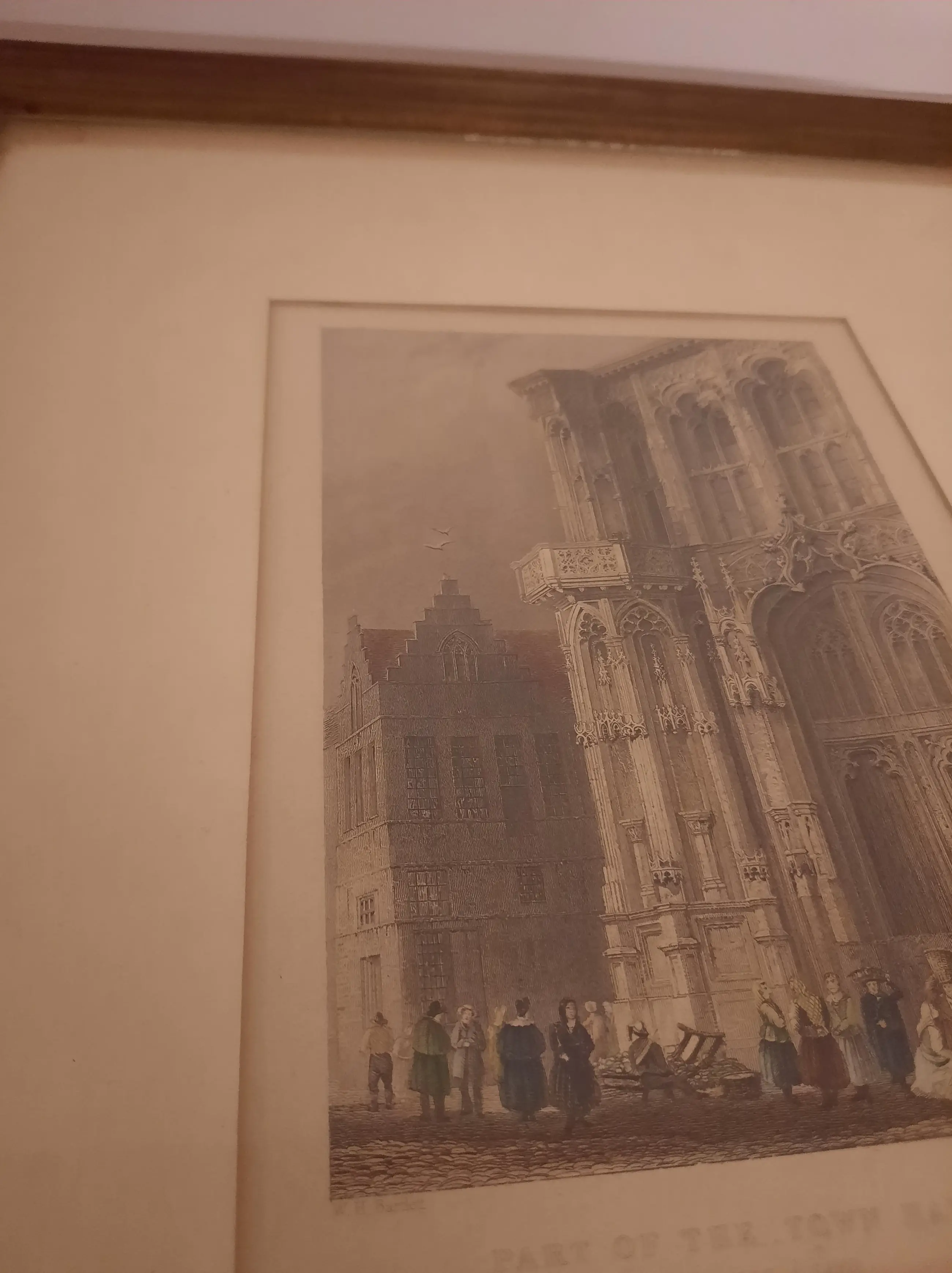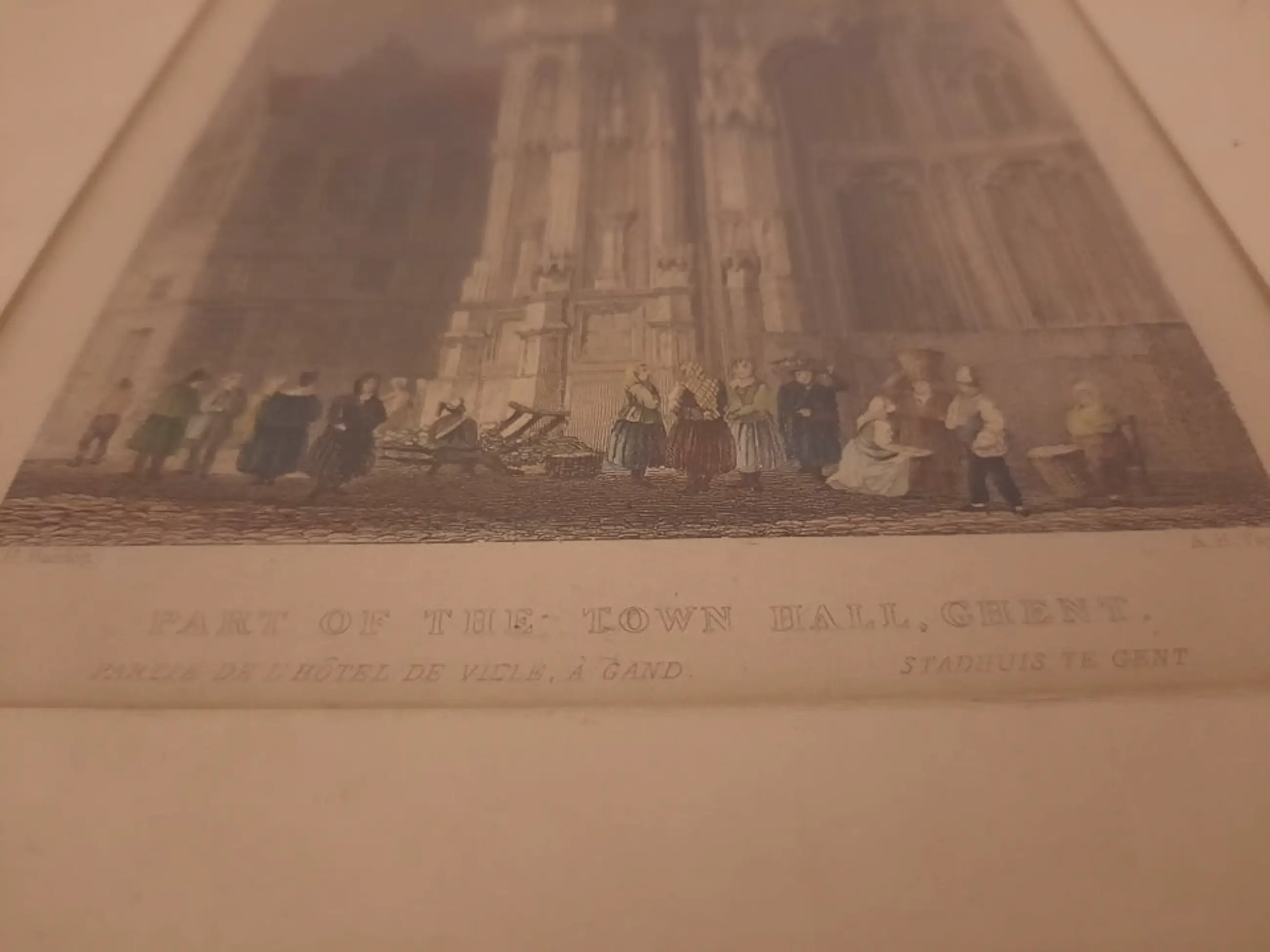 Litho van W. H. Bartlett William Henry BARTLETT (Kentish Town (Londen) 1809 - Malta 1854) Hij overleed op zijn thuisreis vanuit het Midden Oosten naar Engeland aan boord van een schip voor de kust van Malta. William Henry Bartlett was een begaafd tekenaar en illustrator die veel heeft gereisd o.a. naar de Balkan, het Midden Oosten, Amerika en Canada, maar ook naar Nederland. Tijdens deze reizen maakte hij veel tekeningen die later als gravures in boeken werden uitgegeven. Titel "Part of the Town Hall, Ghent" (stadhuis Gent, België)