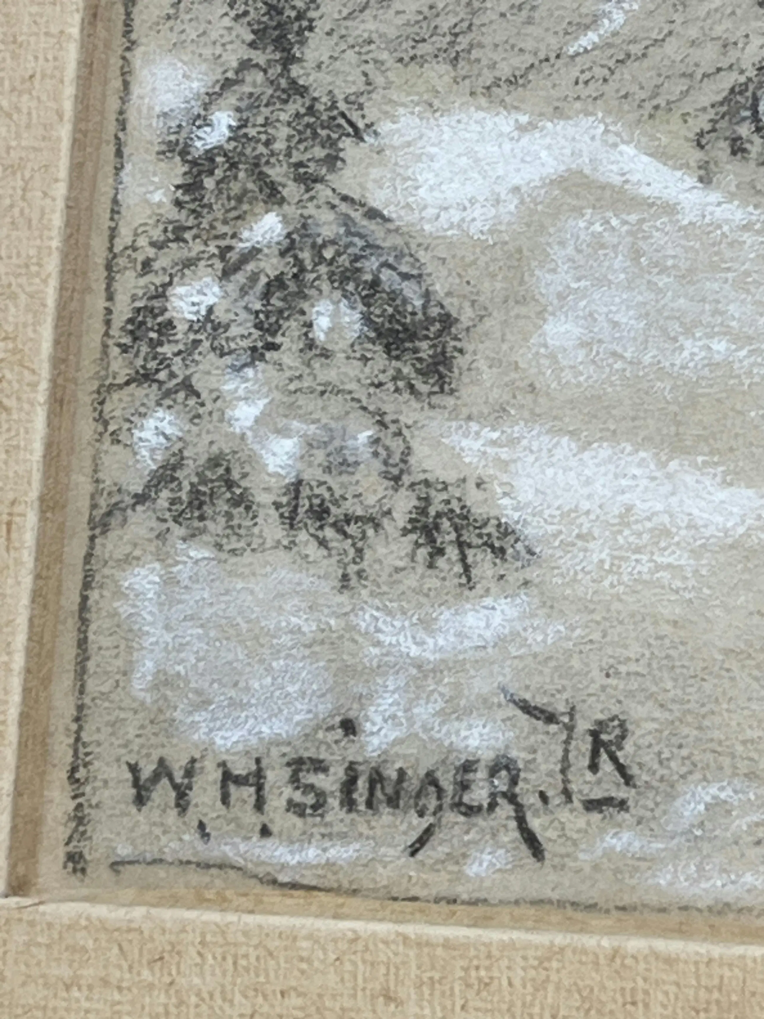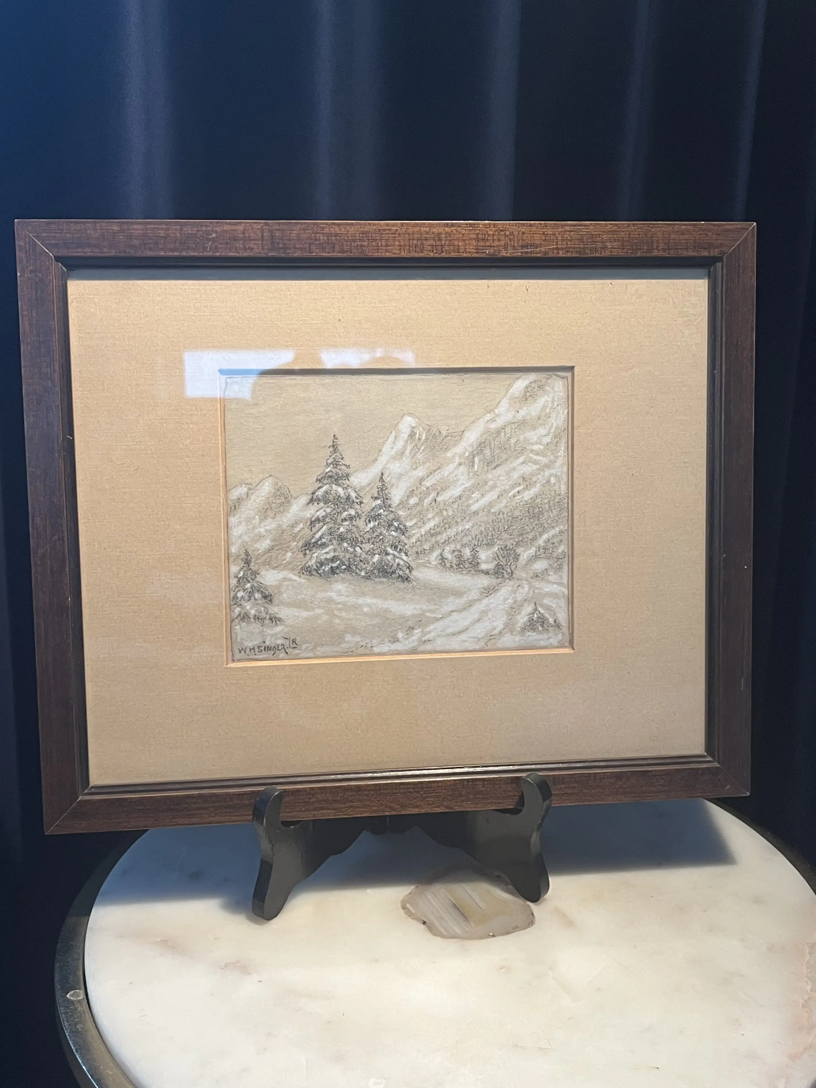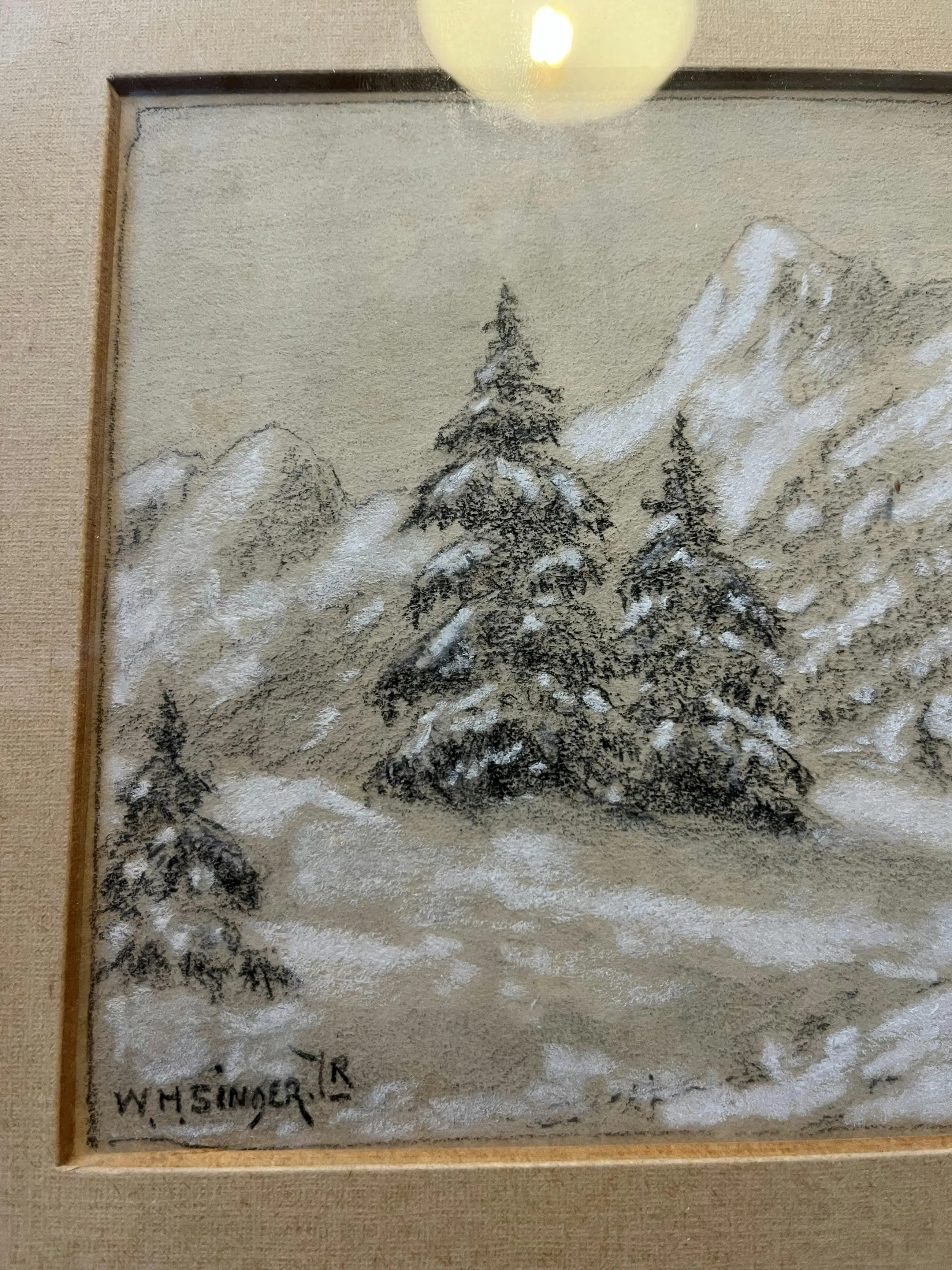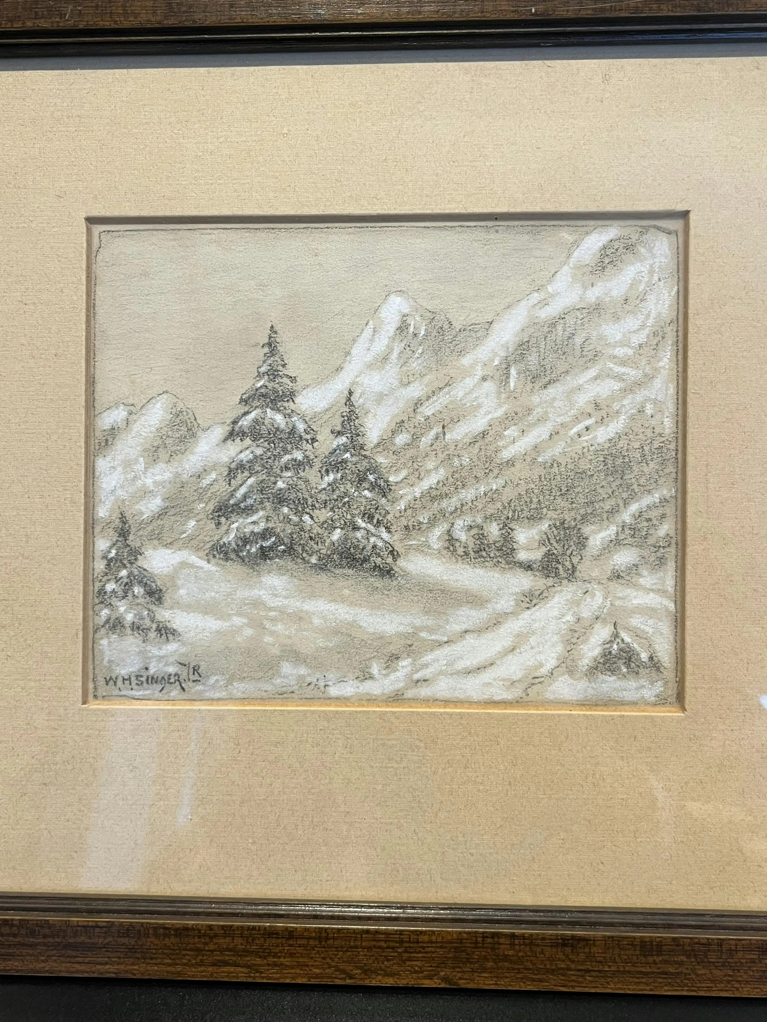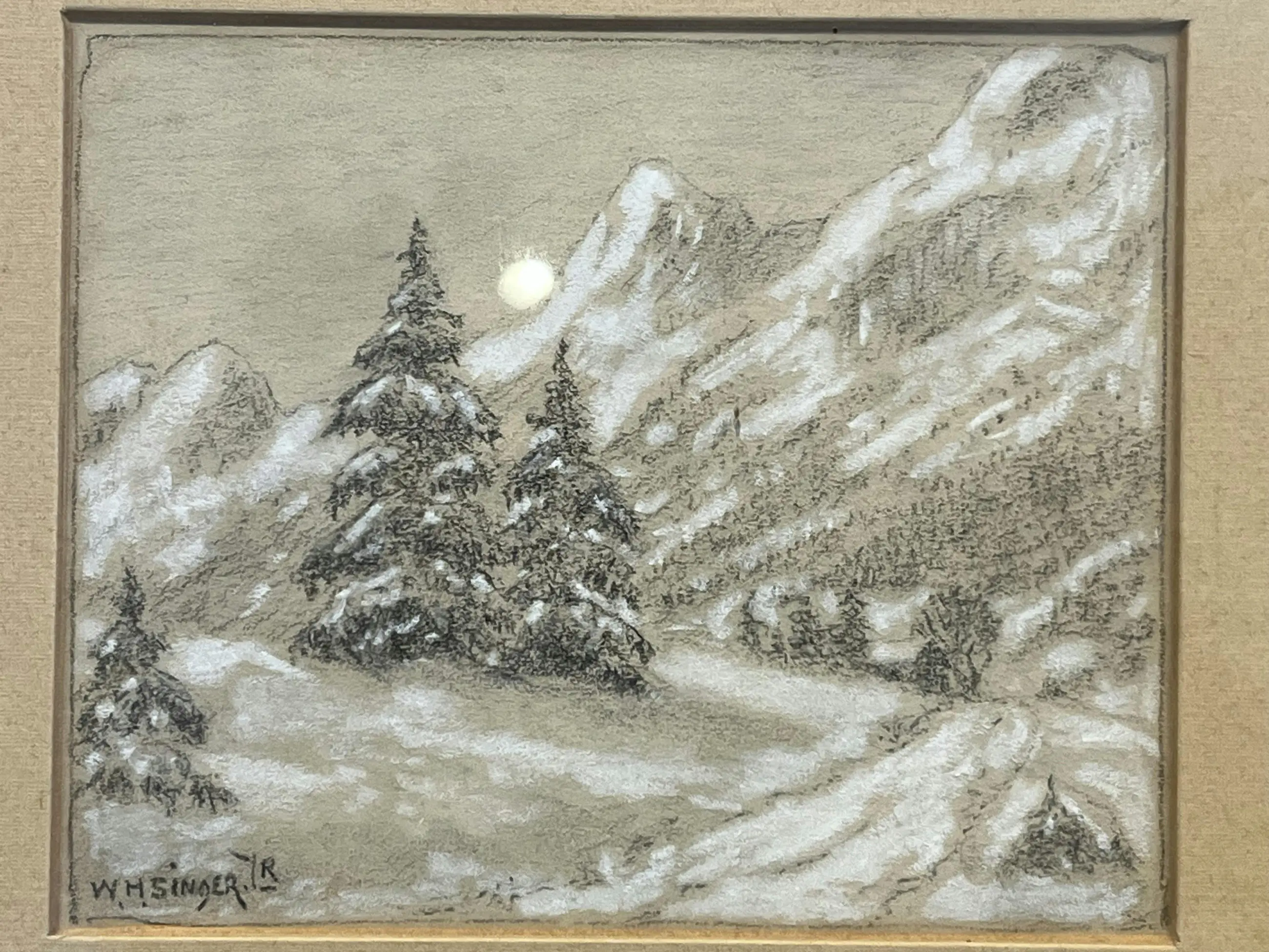 Sfeervolle pasteltekening van een winters berglandschap, uitgevoerd door W.H. Singer, bekend om zijn verstilde natuurvoorstellingen en verfijnde gevoel voor licht en atmosfeer. In deze compositie zien we besneeuwde sparren tegen een bergachtige achtergrond, uitgevoerd in zachte, ingetogen tinten. De tekening ademt rust en winterse stilte.