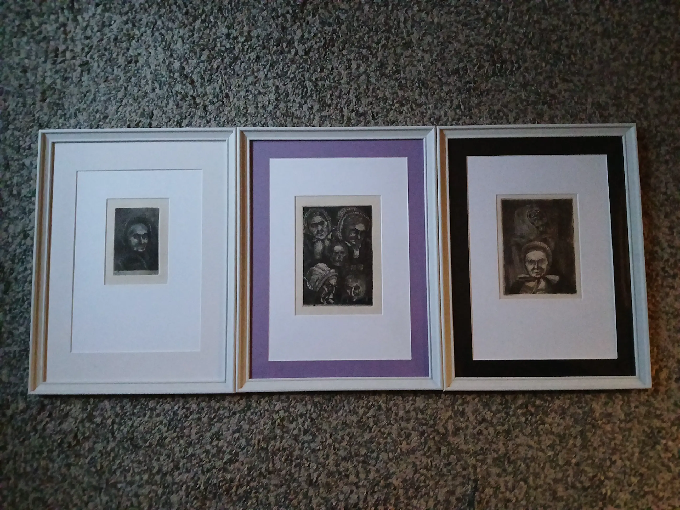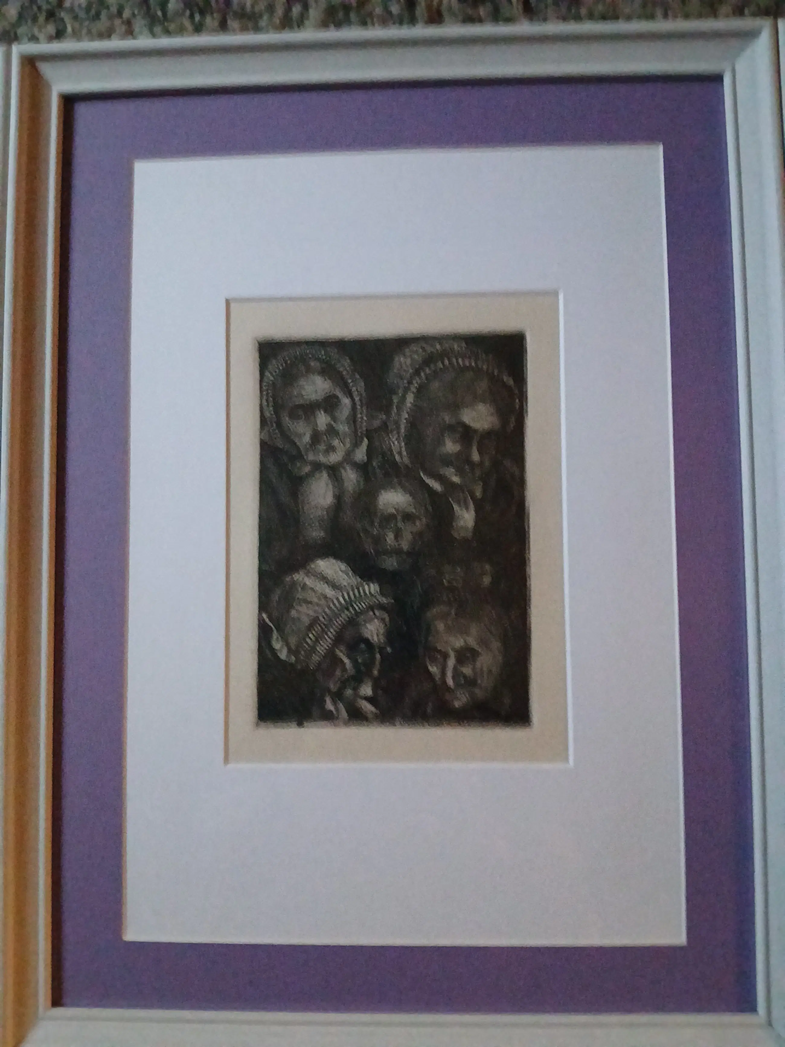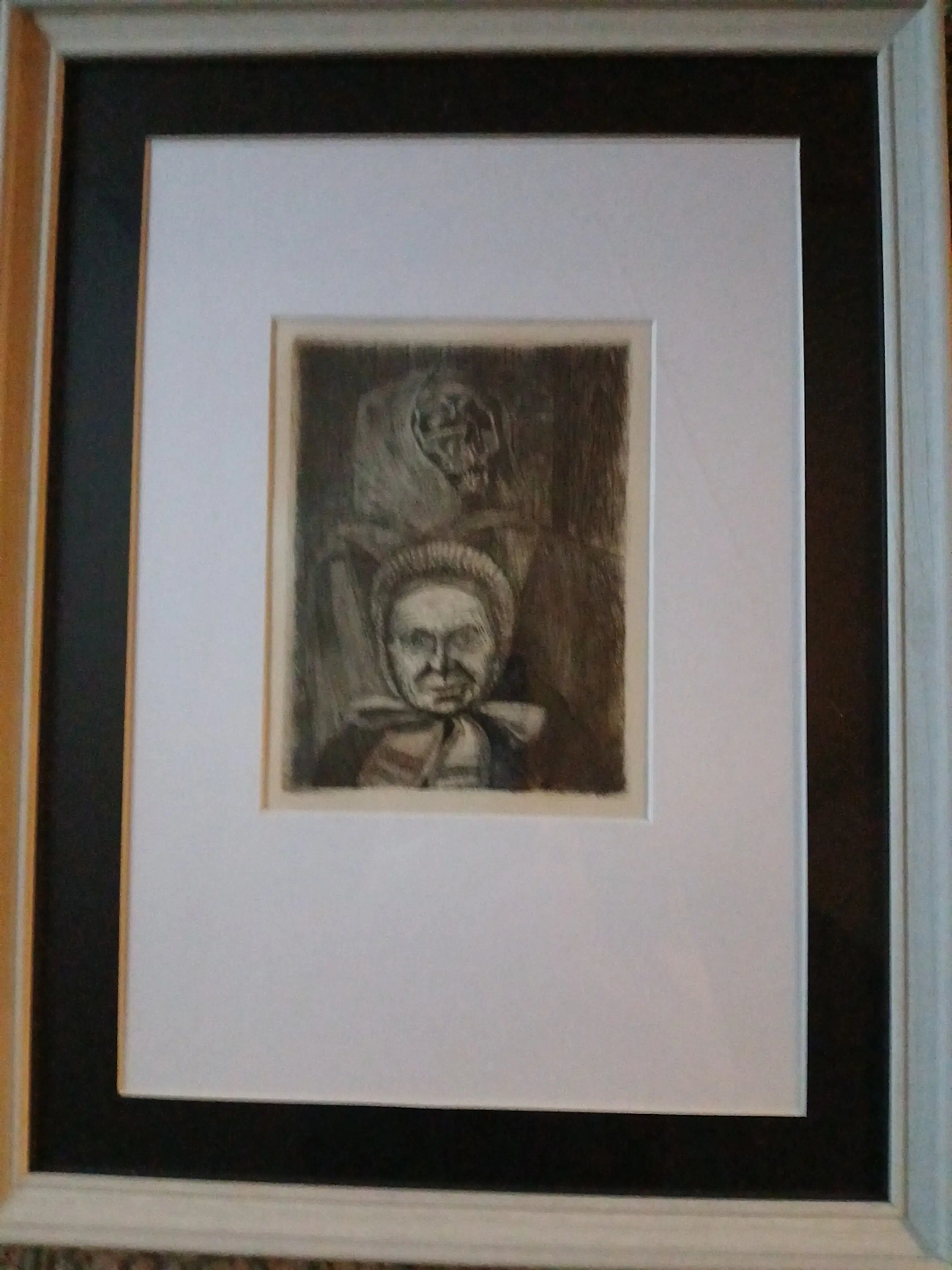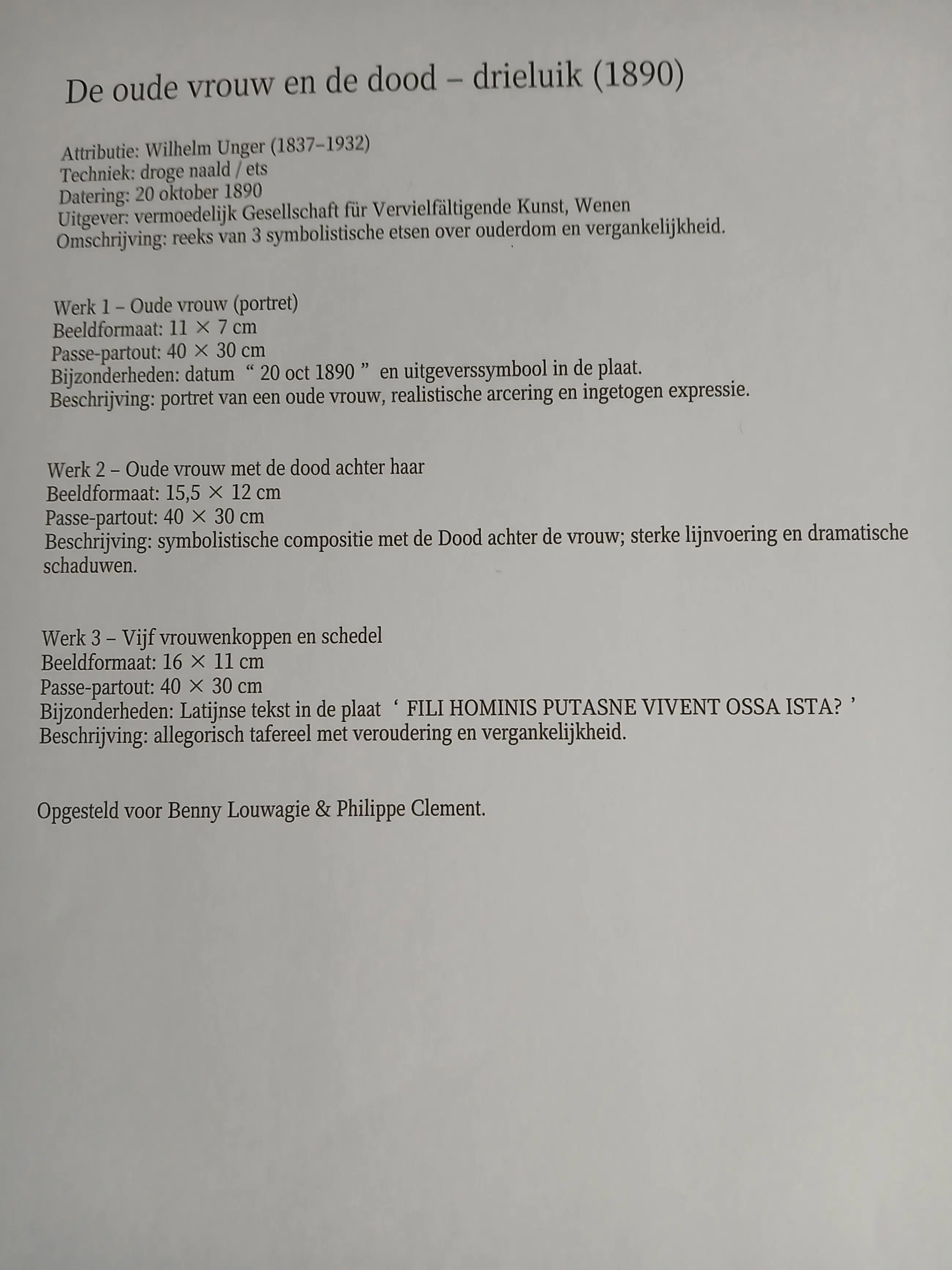 Droge naald/ets 20 oktober 1890+uitgeverssymbool in de plaat. Reeks van 3 symbolische etsen over ouderdom en vergankelijkheid. Werk 1:Oude vrouw 11x7 etsmaat Werk 2:oude vrouw met de dood achter haar 15,5x12 etsmaat Werk 3:Vijf vrouwenopvang en schedel 16x11 etsmaat Latijnse tekst in plaat:'FILI HOMINIS PUTASNE VIVENT OSSA ISTA?'('ZOON DES MENSEN KUNNEN DEZE BEENDEREN HERLEVEN?") Zeer mooi en gewild drieluik