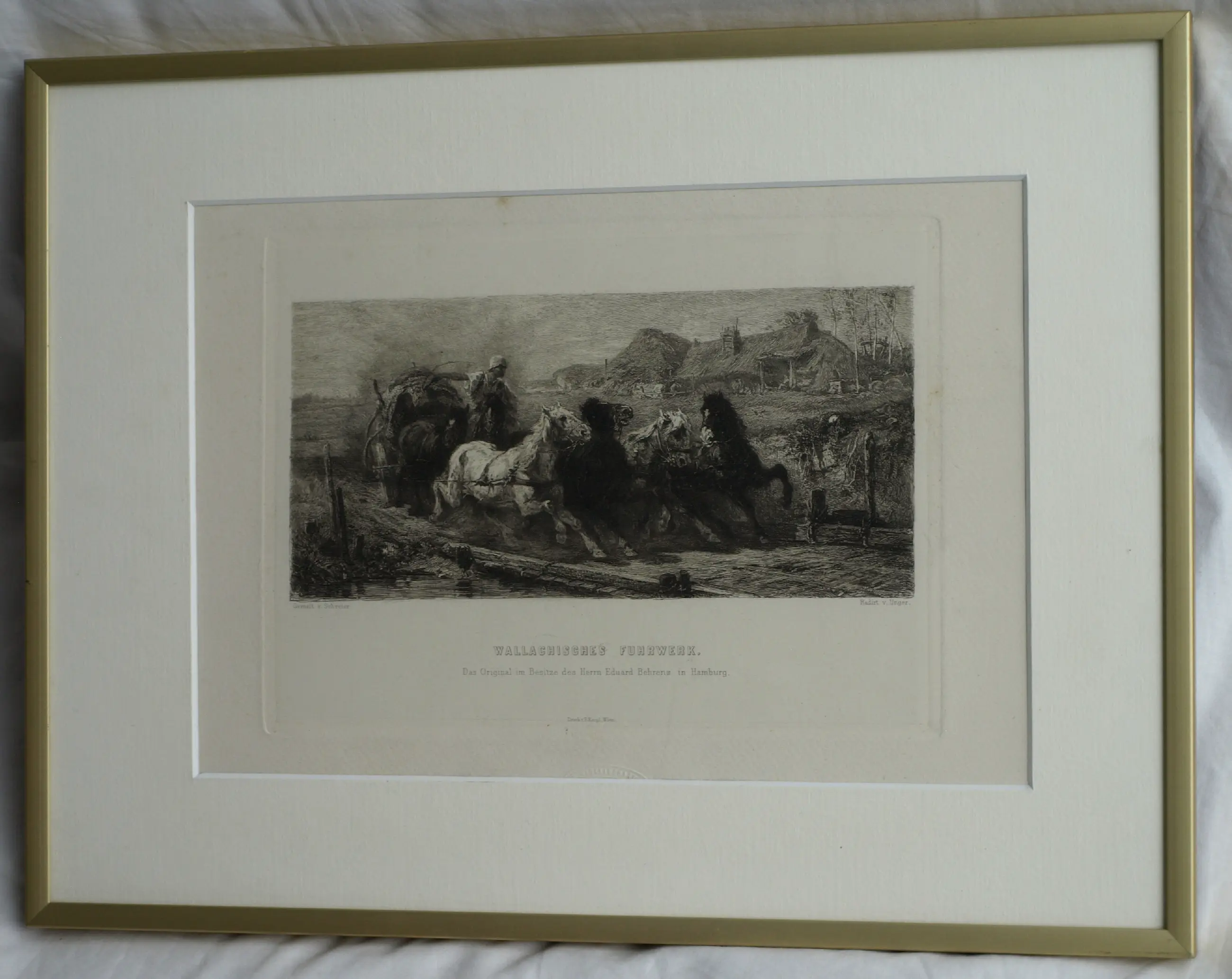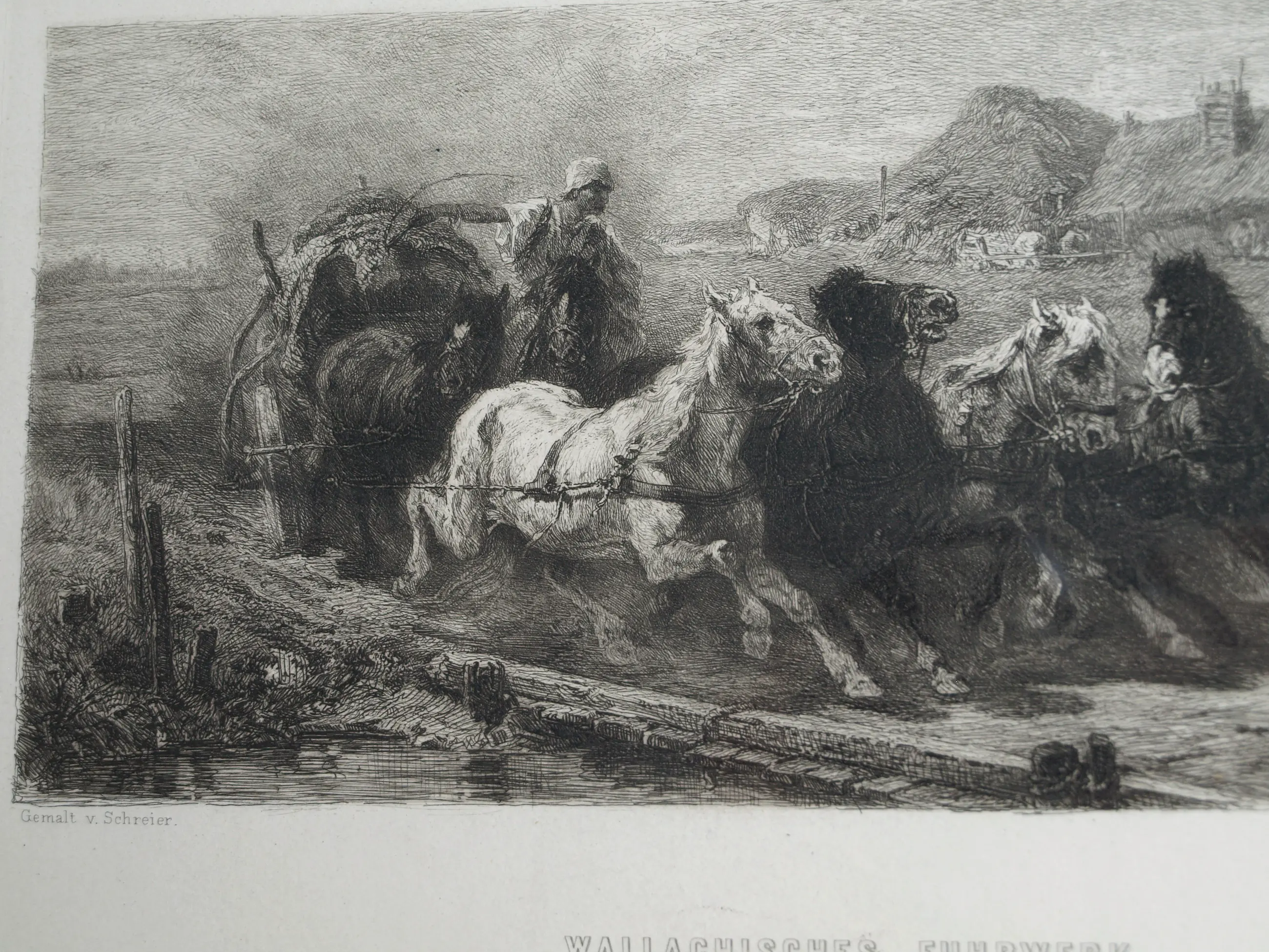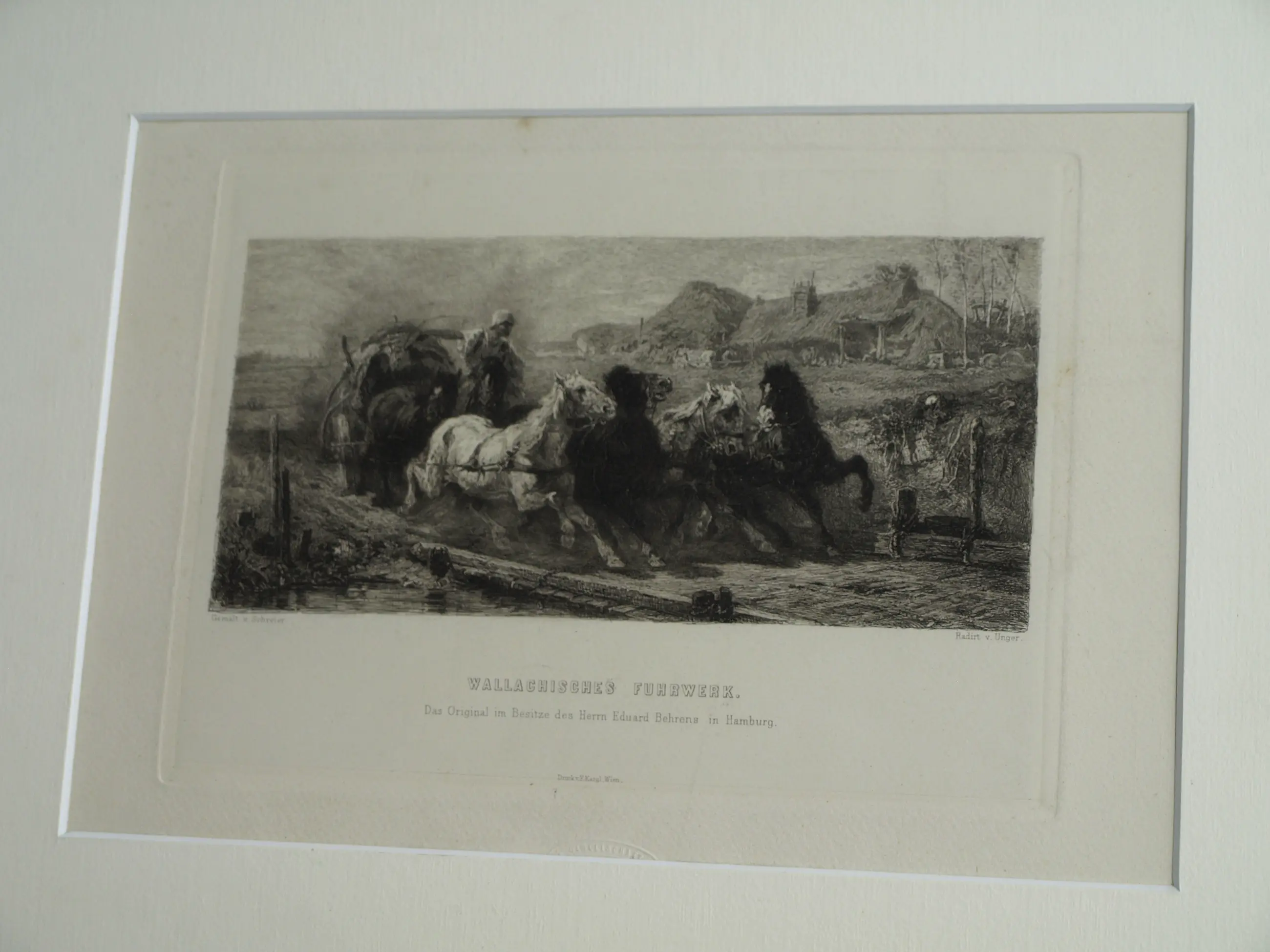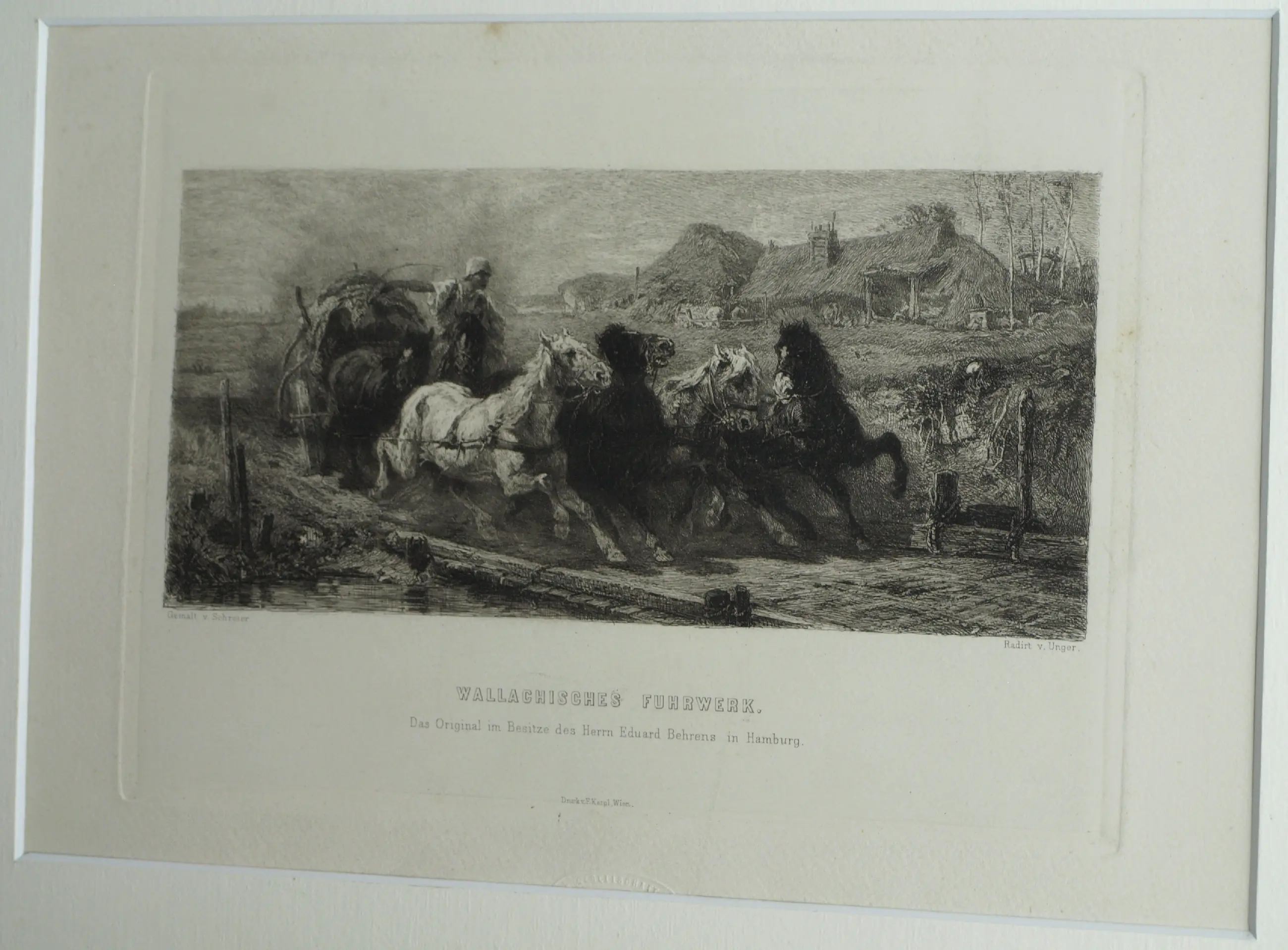 Een ingelijste ets uit ca 1880 van de Duitse kunstenaar Willam Unger (1837-1932), naar het schilderij van de Duitse kunstenaar Christian Adolf Schreyer (1828-1899) “Wallachisches Fuhrwerk” (“Postwagen in Walachije”). Dit schilderij bevindt zich in de collectie van de Layton Art Gallery in de Verenigde Staten.