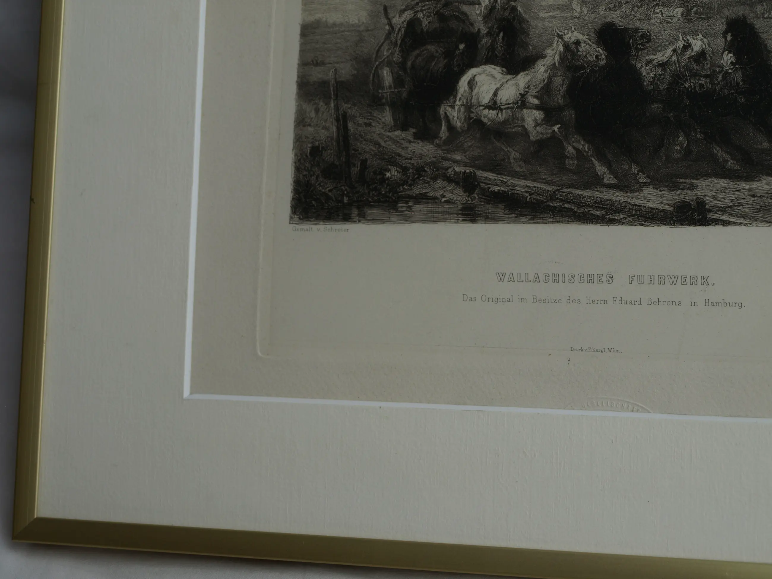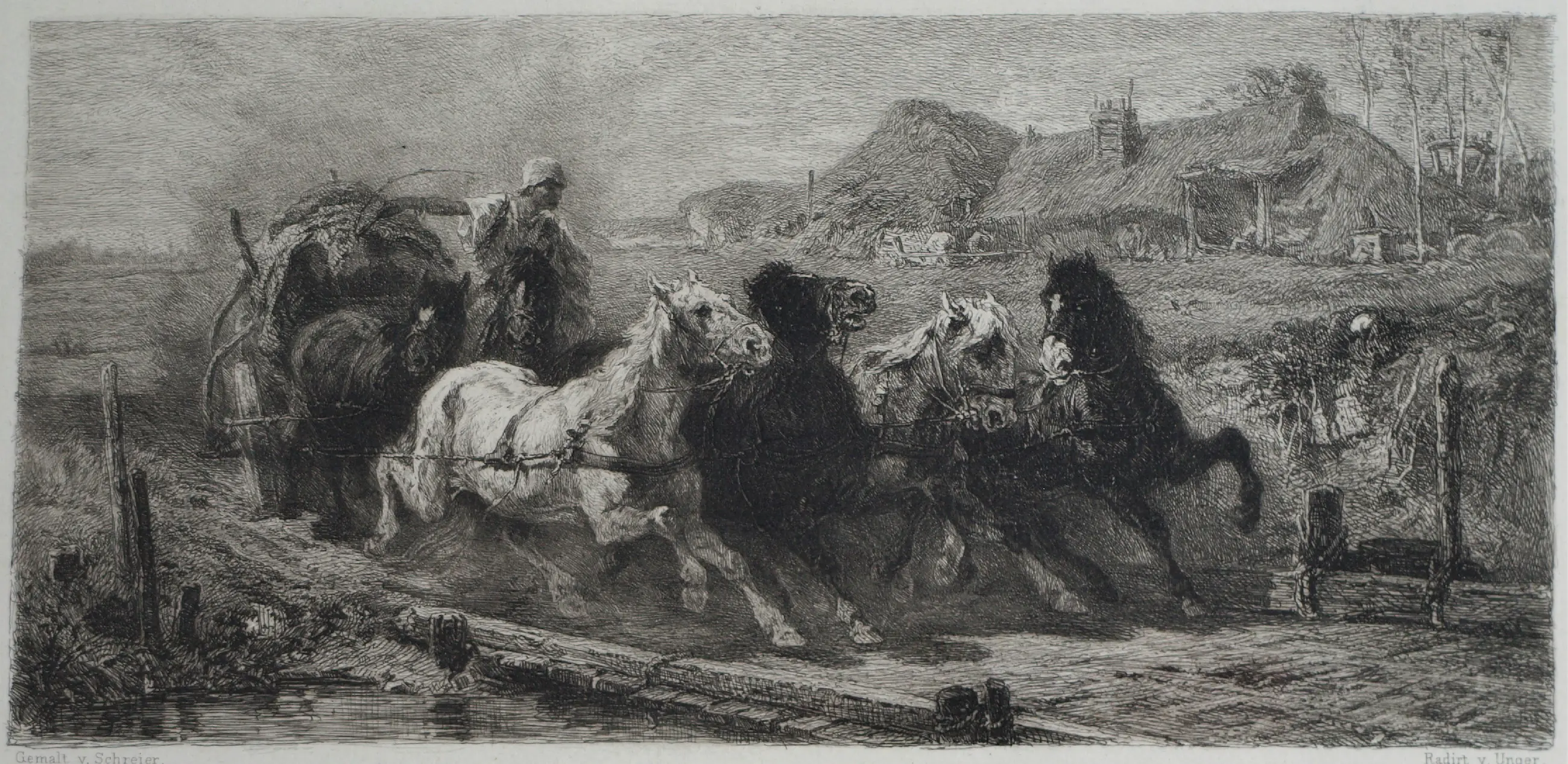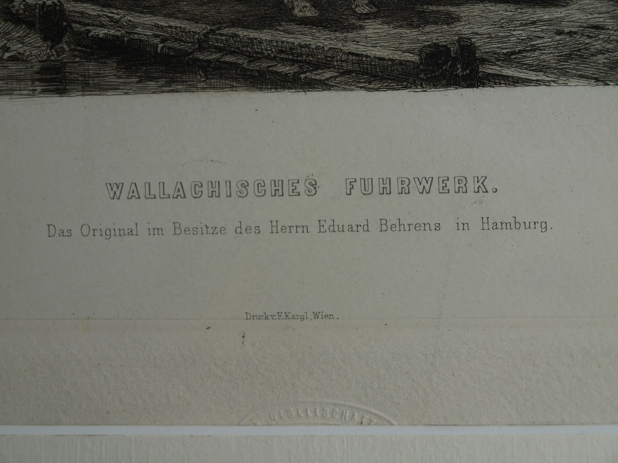 Een ingelijste ets uit ca 1880 van de Duitse kunstenaar Willam Unger (1837-1932), naar het schilderij van de Duitse kunstenaar Christian Adolf Schreyer (1828-1899) “Wallachisches Fuhrwerk” (“Postwagen in Walachije”). Dit schilderij bevindt zich in de collectie van de Layton Art Gallery in de Verenigde Staten.
