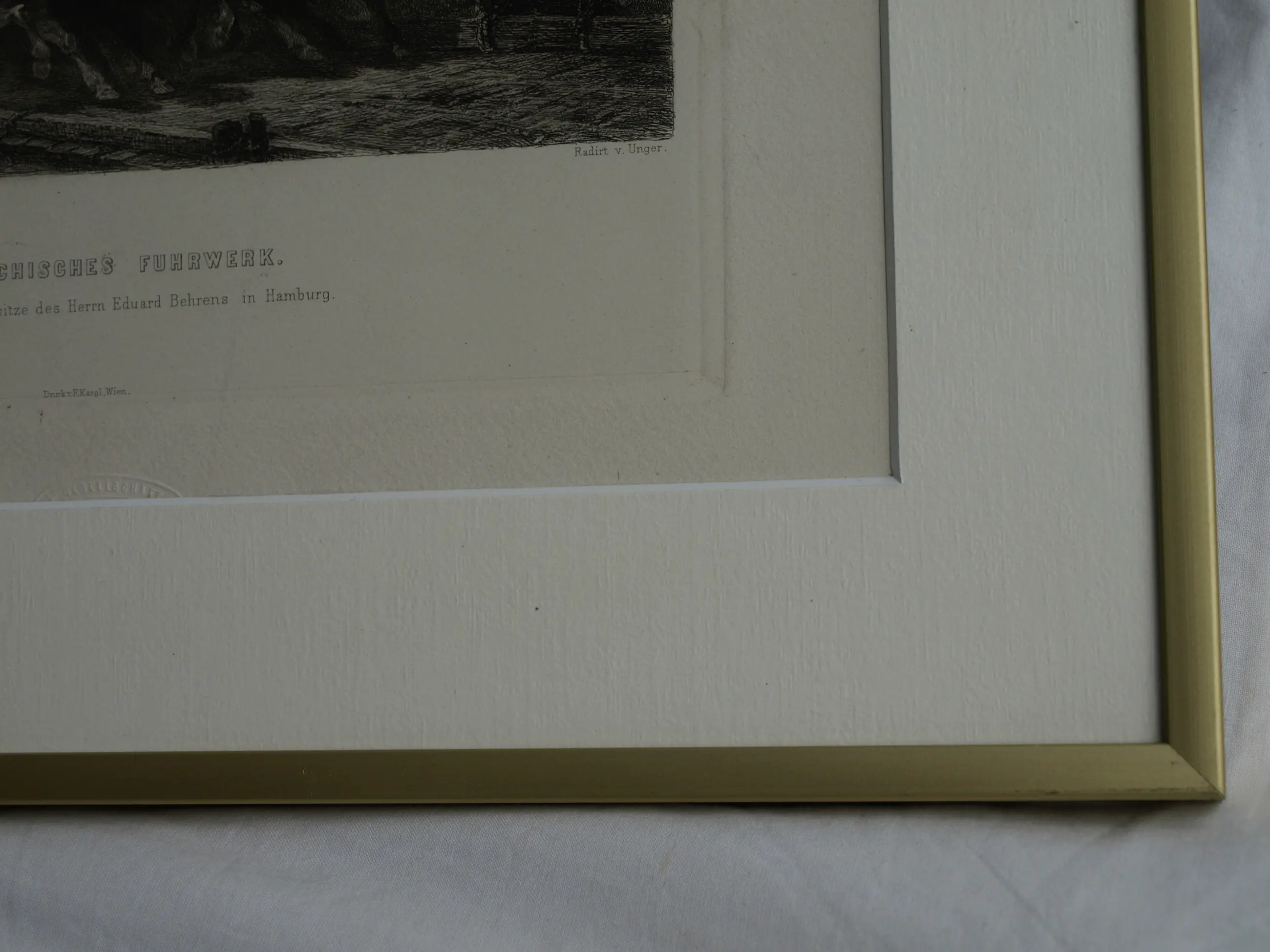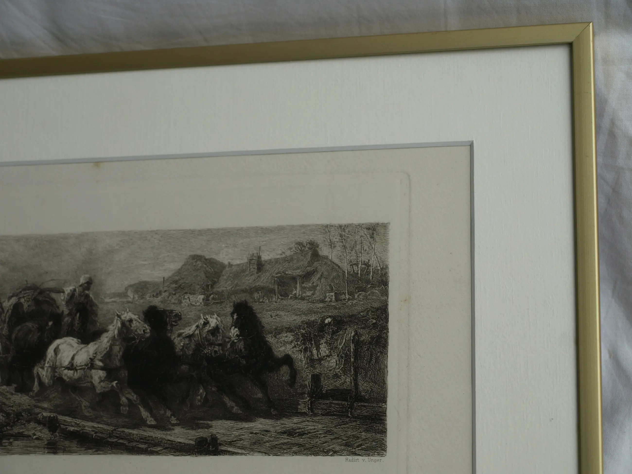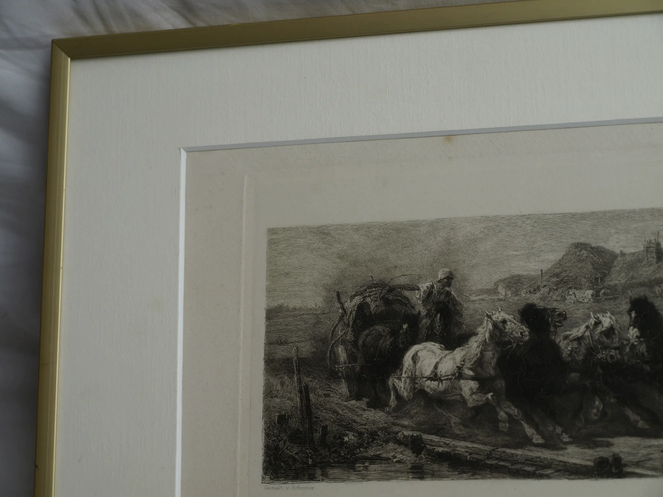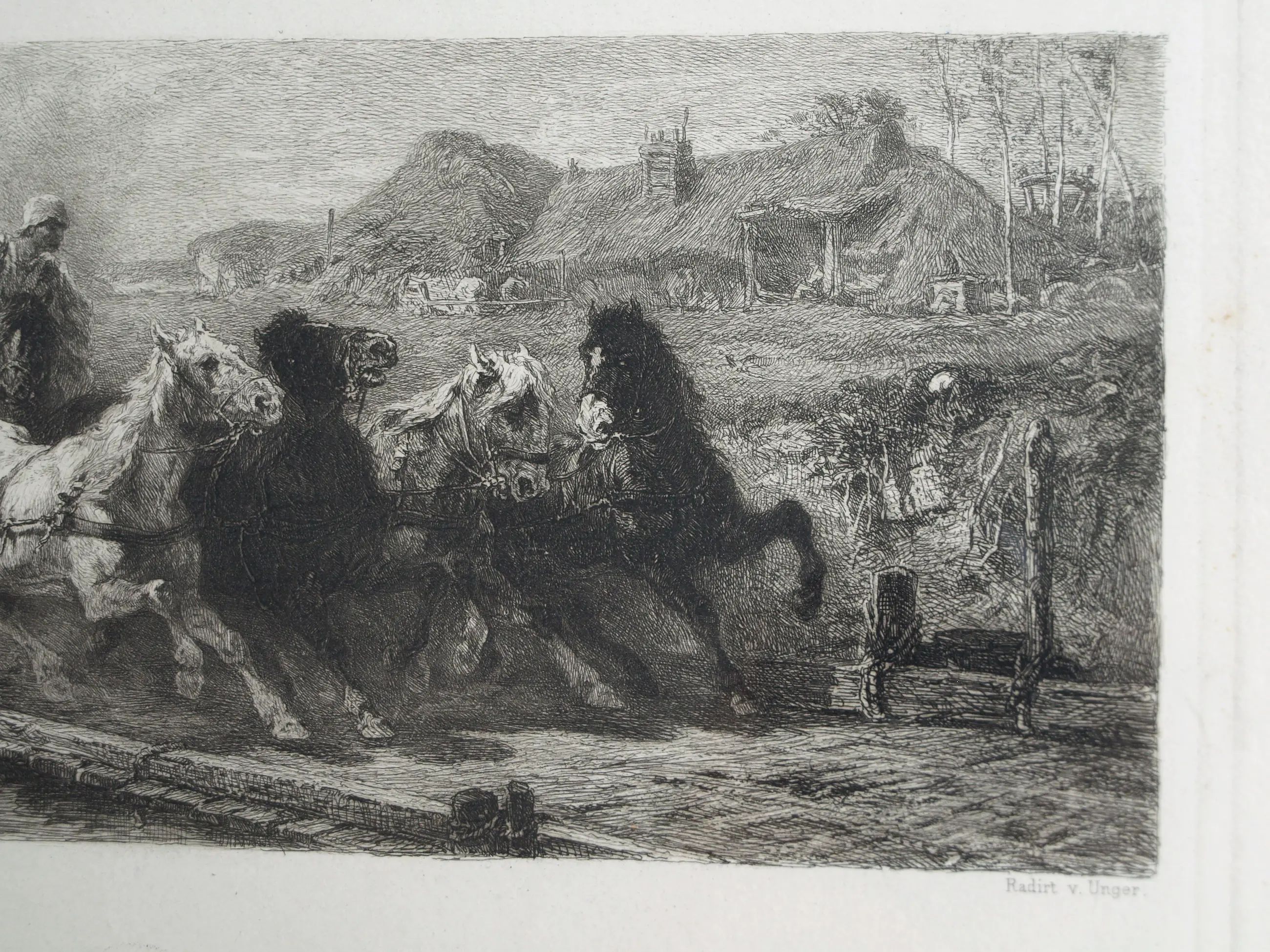 Een ingelijste ets uit ca 1880 van de Duitse kunstenaar Willam Unger (1837-1932), naar het schilderij van de Duitse kunstenaar Christian Adolf Schreyer (1828-1899) “Wallachisches Fuhrwerk” (“Postwagen in Walachije”). Dit schilderij bevindt zich in de collectie van de Layton Art Gallery in de Verenigde Staten.