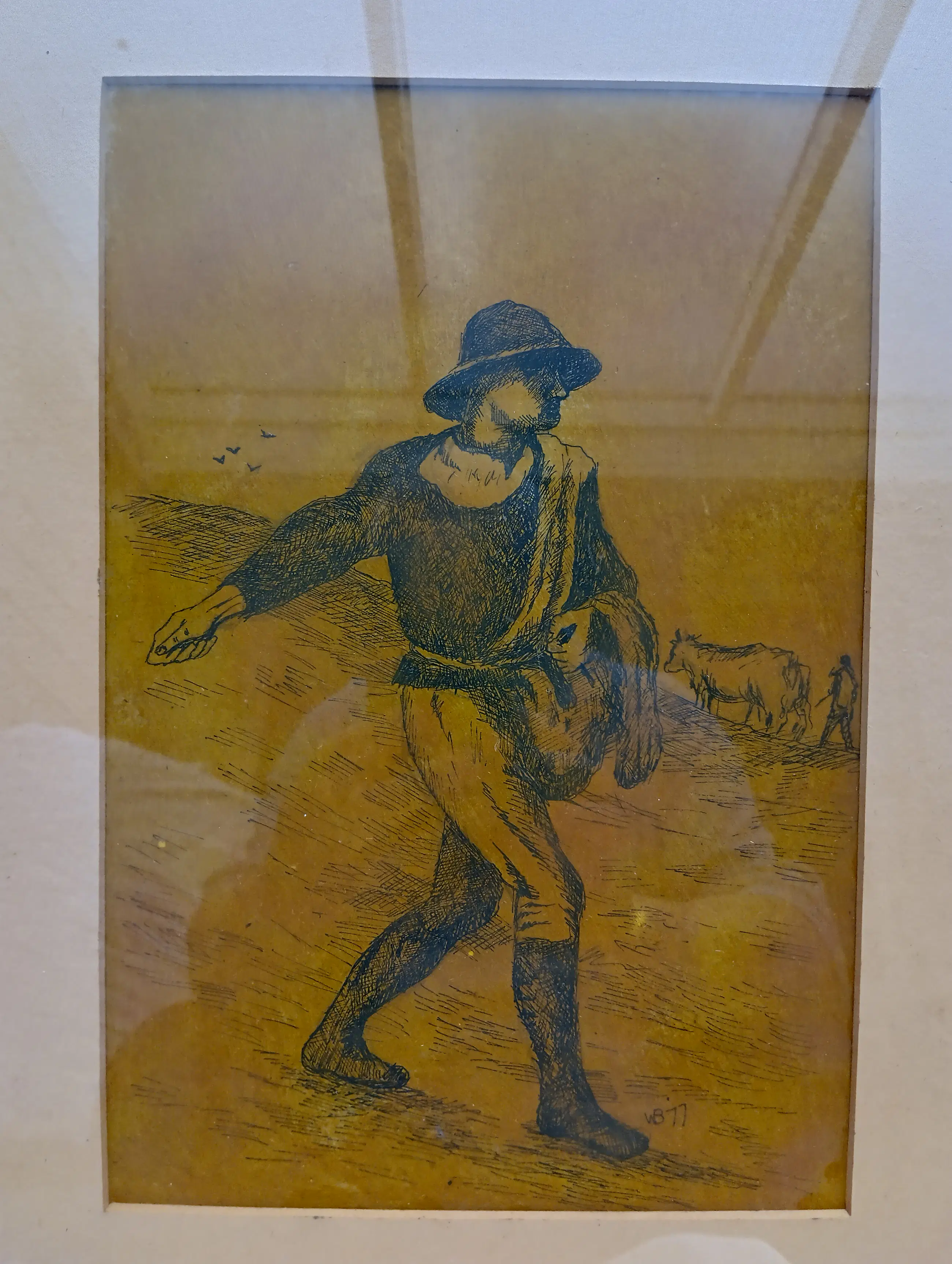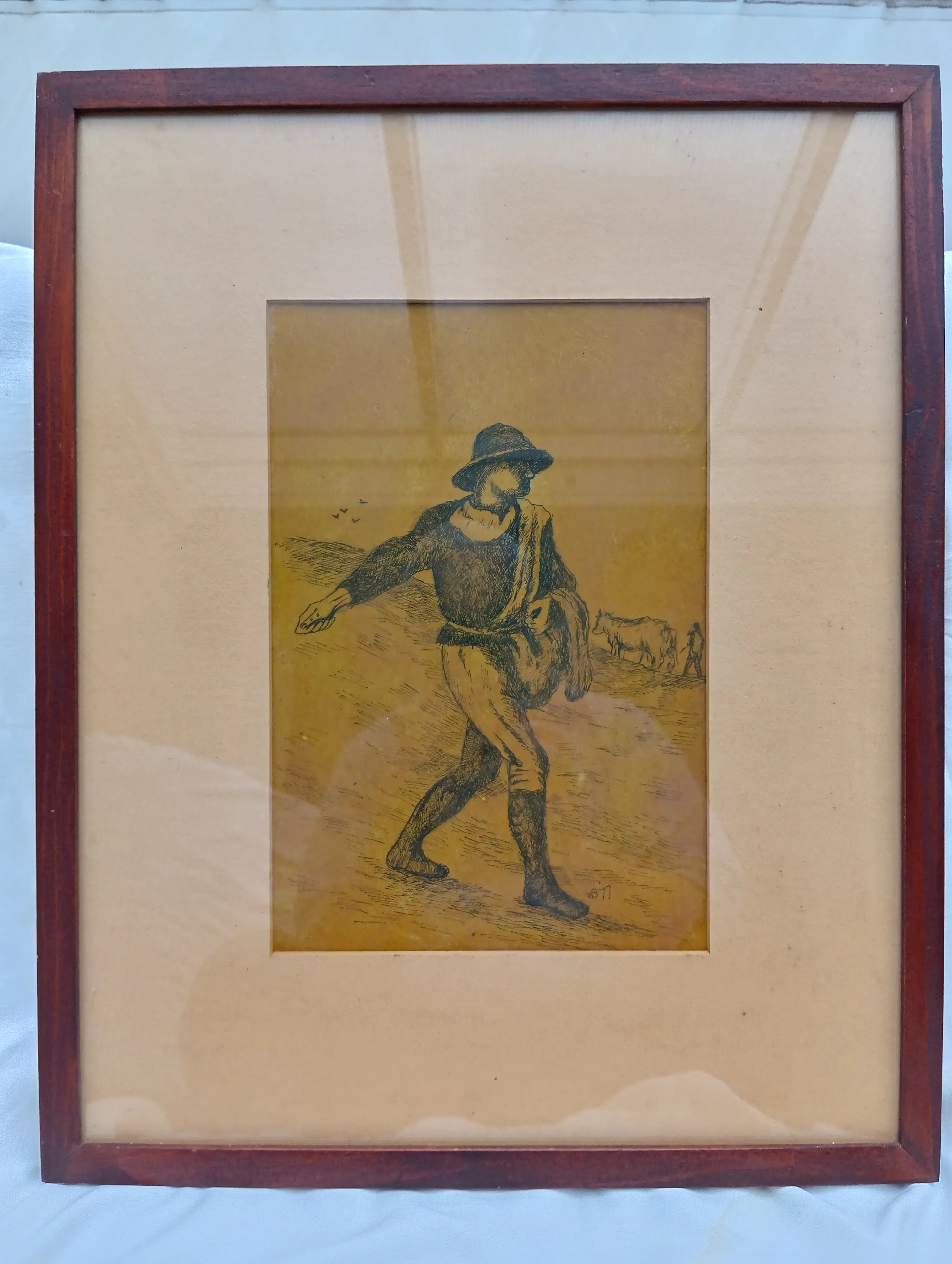 Pentekening van deze Brabantse kunstenaar uit 1977. De pentekening is gebaseerd op een voorbeeld van Millet / Vincent van Gogh. Deze tekening is in mijn bezit gekomen in 1977, tegen betaling van Hfl. 200,-- Willie Berkers is bekend geworden door het schilderen van dorpsgezichten van vnl. zijn woonplaats Deurne. Pentekeningen van Willie zijn redelijk onbekend, omdat zijn voorkeur toch in het schilderwerk lag.