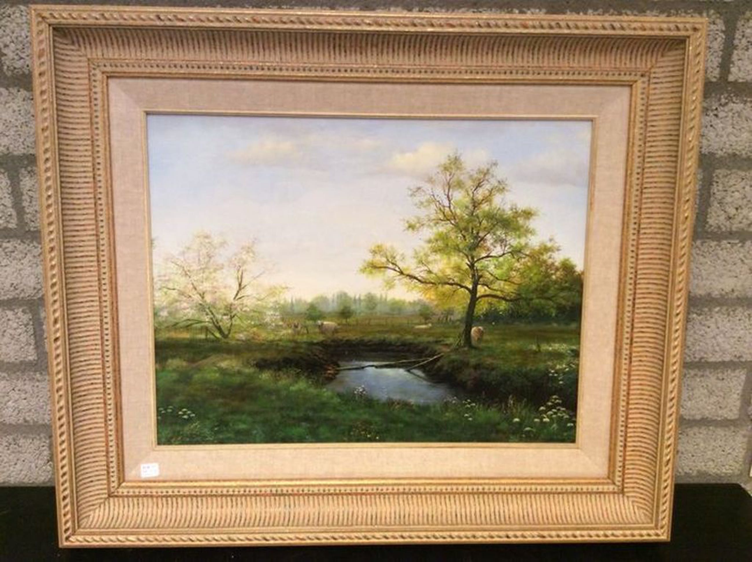 Een prachtig geschilderd landschap met een beekje en schapen van Willie Berkers. De conditie van het schilderij is zeer goed.